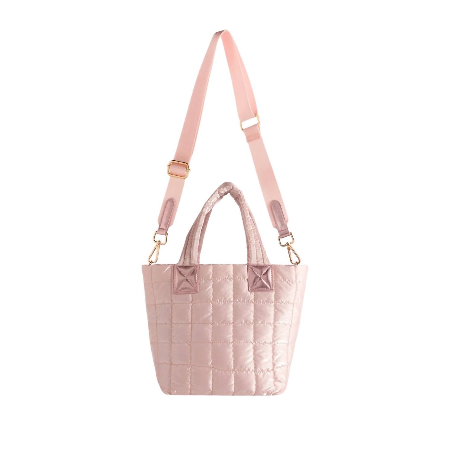 The crossbody bag is a trend that is here to stay and we especially love this style. Discover the Women's Logan Mini Tote Cross-Body Bag by Shiraleah, a stylish accessory in a metallic rose hue. The bag is crafted from shiny quilted nylon and boasts both classic top handles and a detachable cross-body strap. It features a large zipper closure and three smaller zipper pockets for your essentials, with dimensions of L 14" x W 6" x H 9" and a handle drop of 6" and an adjustable long strap of approximately 28". Perfectly designed for outings, it offers ample space for your phone, keys, and a touch of elegance.