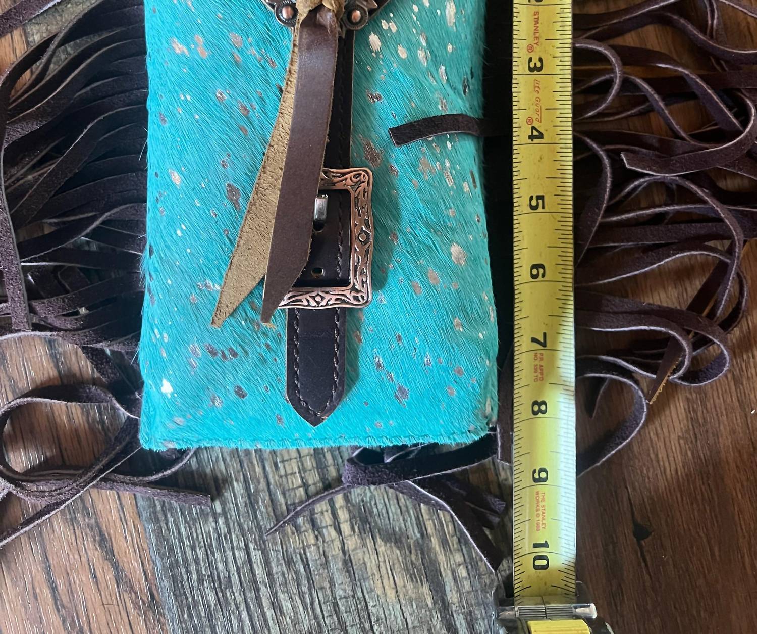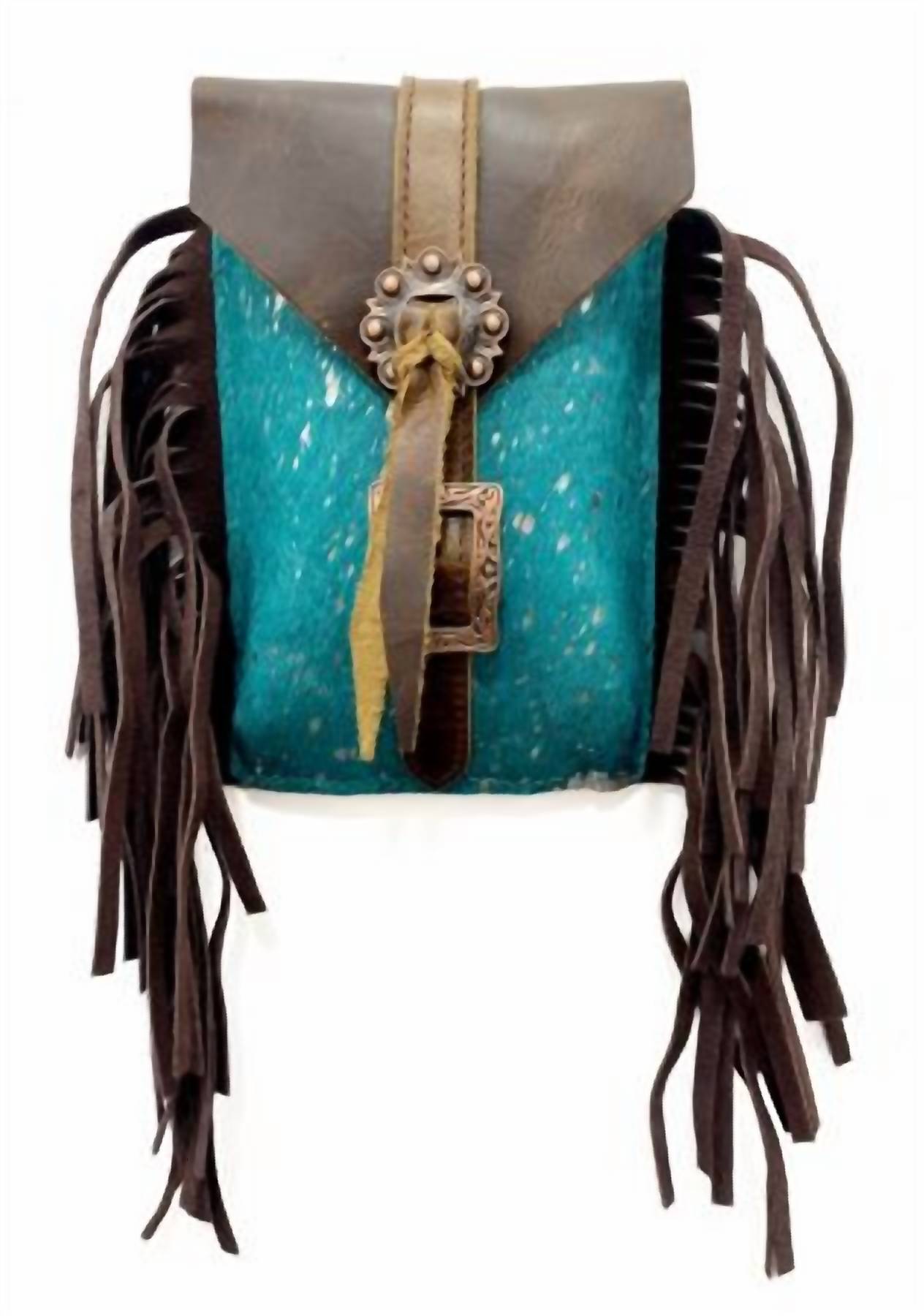 This crossbody bag will be your go-to bag of the season. Introducing the Showman Women's Hair On Cowhide Saddle Bag, crafted in striking Acid Wash Teal for bold sophistication. Made from genuine leather, this crossbody bag showcases the unique tones and patterns inherent to real cowhide, ensuring each piece is distinctive. The bag measures 8.5" in height and 5" in width, providing ample space for essentials like your phone, keys, and money. Perfect for stylish functionality while on the go.