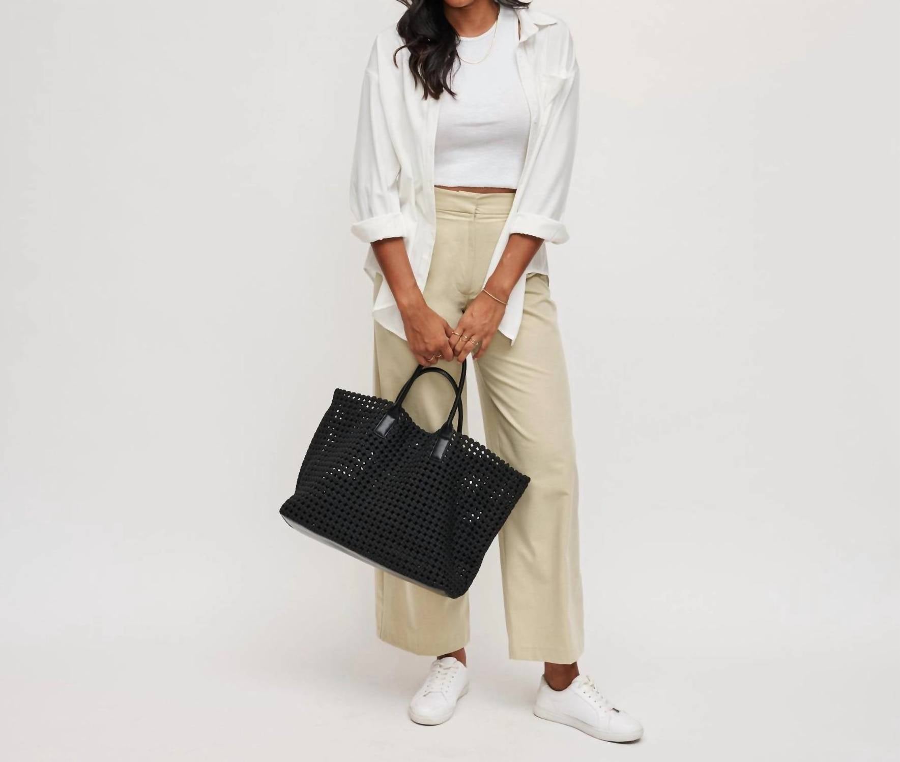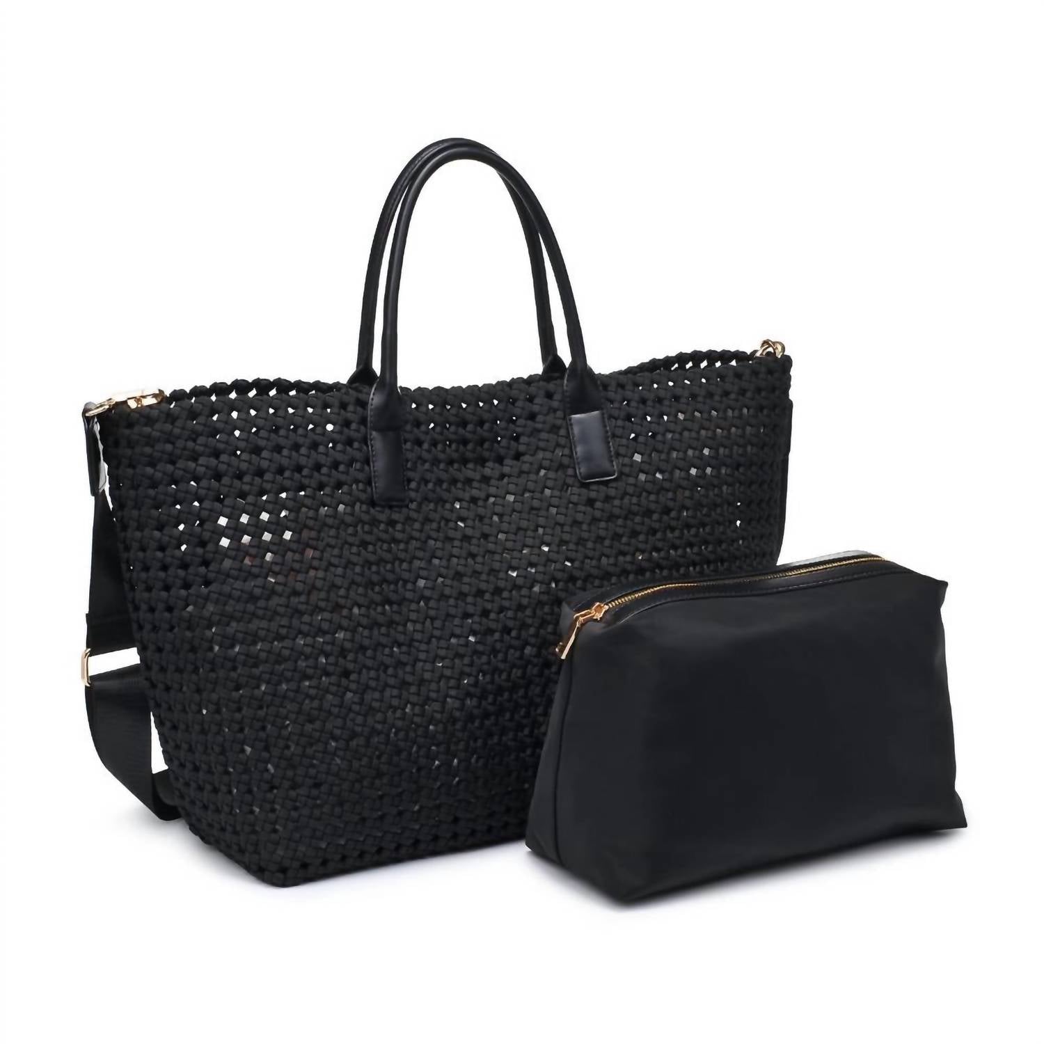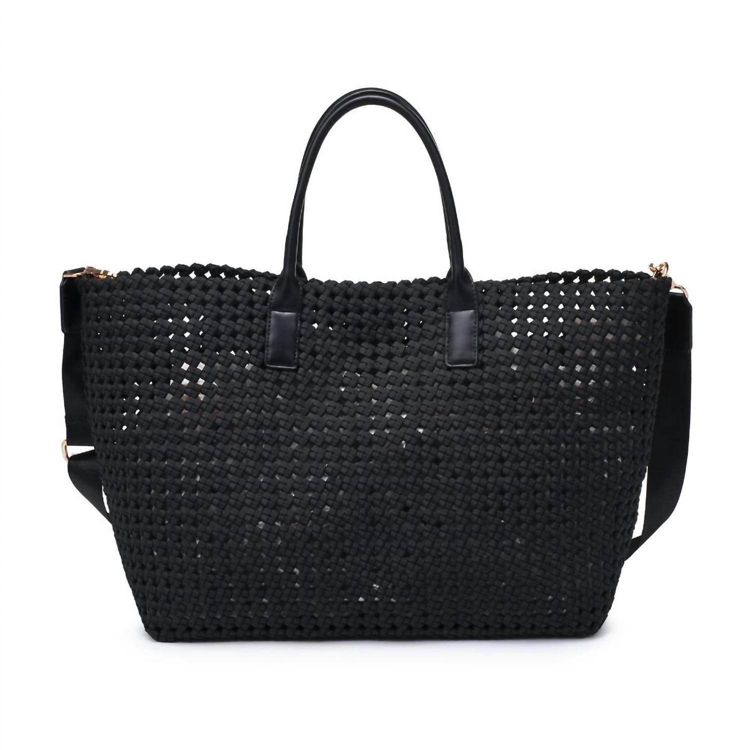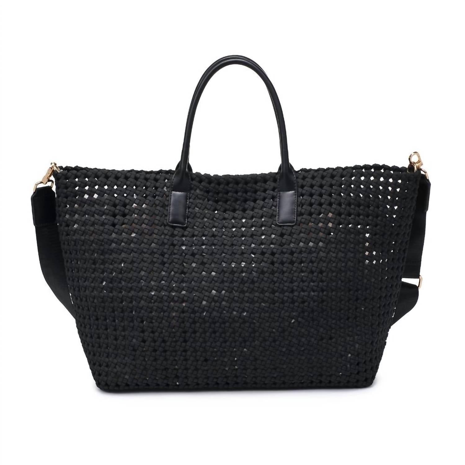 The perfect throw-it-in-and-go bag for your next weekend away or beach vacation! Its classic design will never go out of style and you'll be reaching for this bag season after season. Discover the Solstice Large Hand Woven Knot Tote by SOL and SELENE, a black hobo bag embodying effortless style and versatility. Crafted from neoprene, this tote features an intricate braided design and an open closure for relaxed elegance. It comes with an adjustable and detachable shoulder strap, offering personalized wear, while the unlined interior includes a removable drawstring pouch for practicality. The hand-woven knot design showcases a series of interlaced loops that add a textured, decorative touch to this essential accessory.