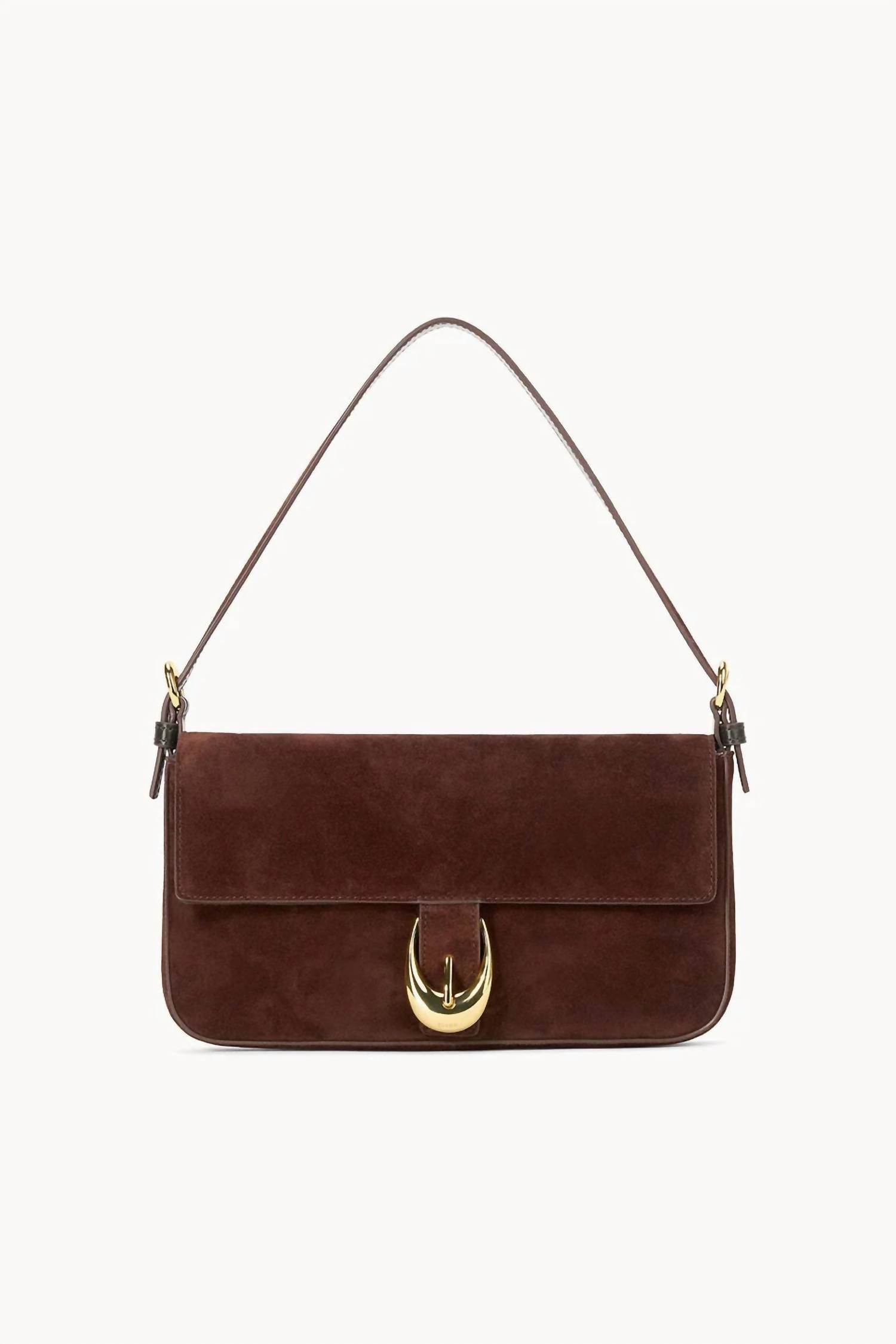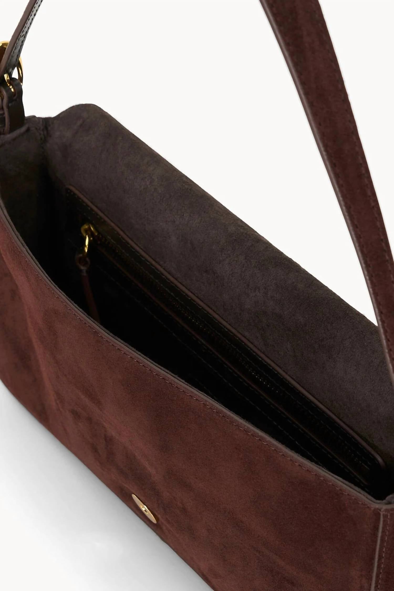 Introducing the Women's Harlow Bag by STAUD, a sophisticated shoulder accessory in a rich mahogany hue. Crafted from 100% suede, this bag features STAUD's signature Moon buckle hardware and a convenient snap closure, with an interior pocket for added functionality. Measuring at 5 inches in height, 10.25 inches in width, and 1.5 inches in depth, this piece is designed to elevate your everyday ensemble. The elegant design ensures it is both stylish and practical for any occasion.