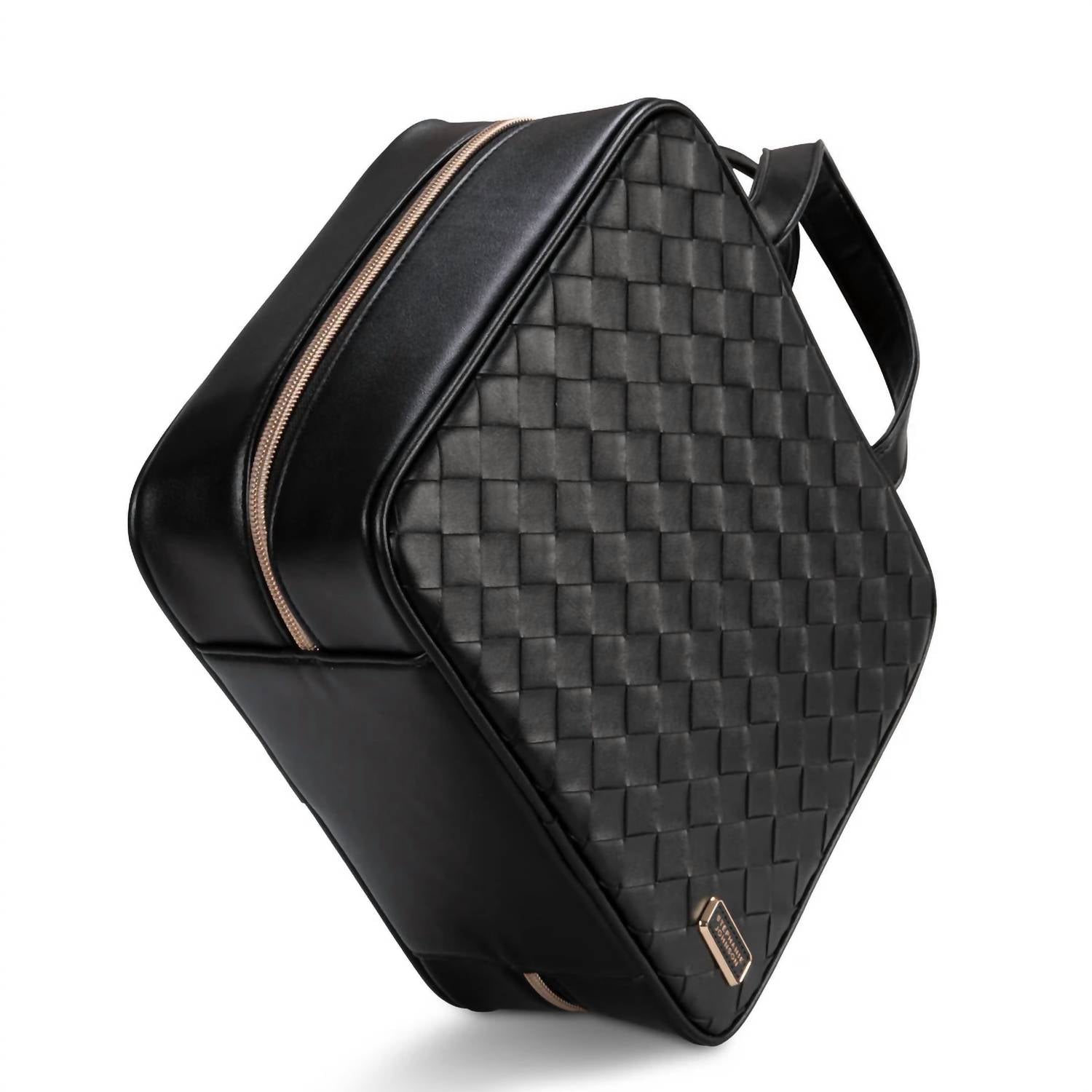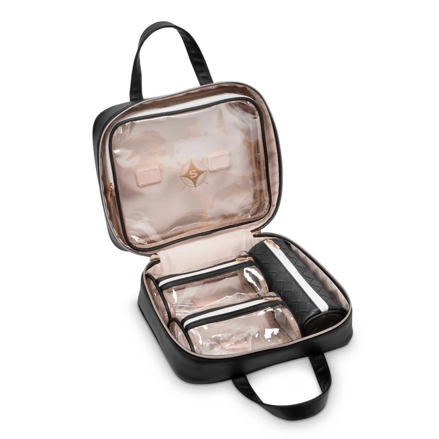 A stylish bag to use for makeup, skincare, or anything else you might want to travel with in style. Introducing the Women's Belize Raven Martha Large Briefcase Bag by Stephanie Johnson, an elegant yet functional cosmetic case in sleek black. This cosmetic bag features a spacious interior with three removable compartments and a large clear zip wall pocket, making organization effortless. Dimensions: 9.25 inches in height, 11.25 inches in width, and 4 inches in depth. Perfect for the woman on the go, this bag combines practicality with a stylish exterior, ensuring your travel essentials are both secure and elegantly displayed.