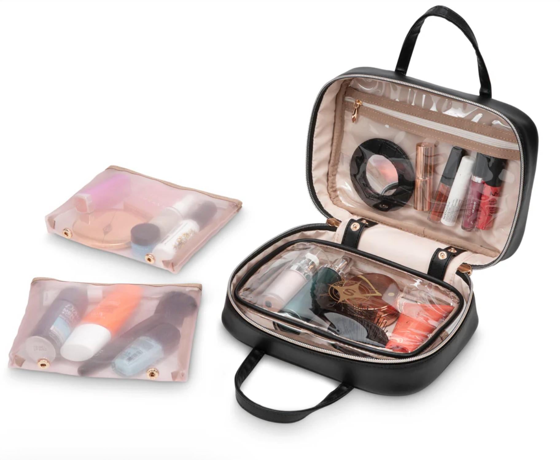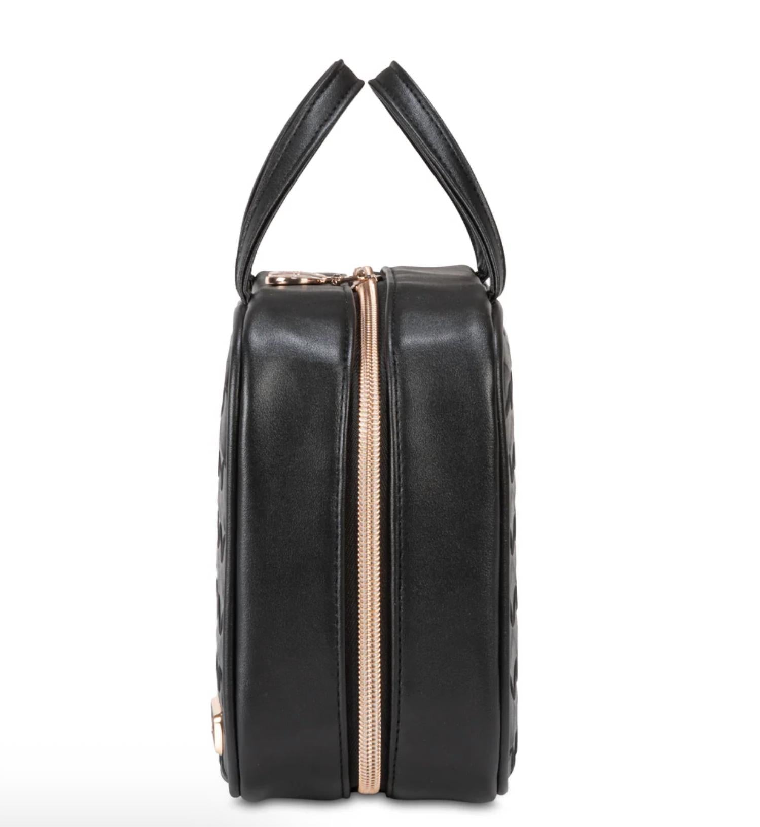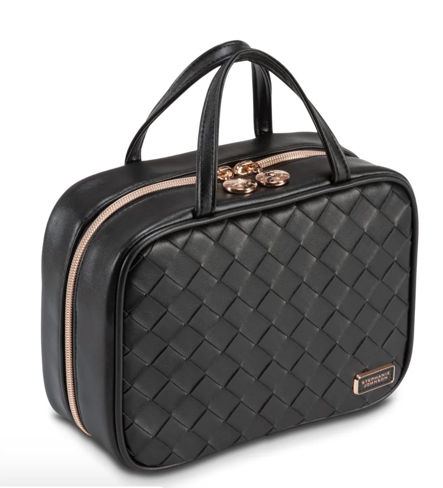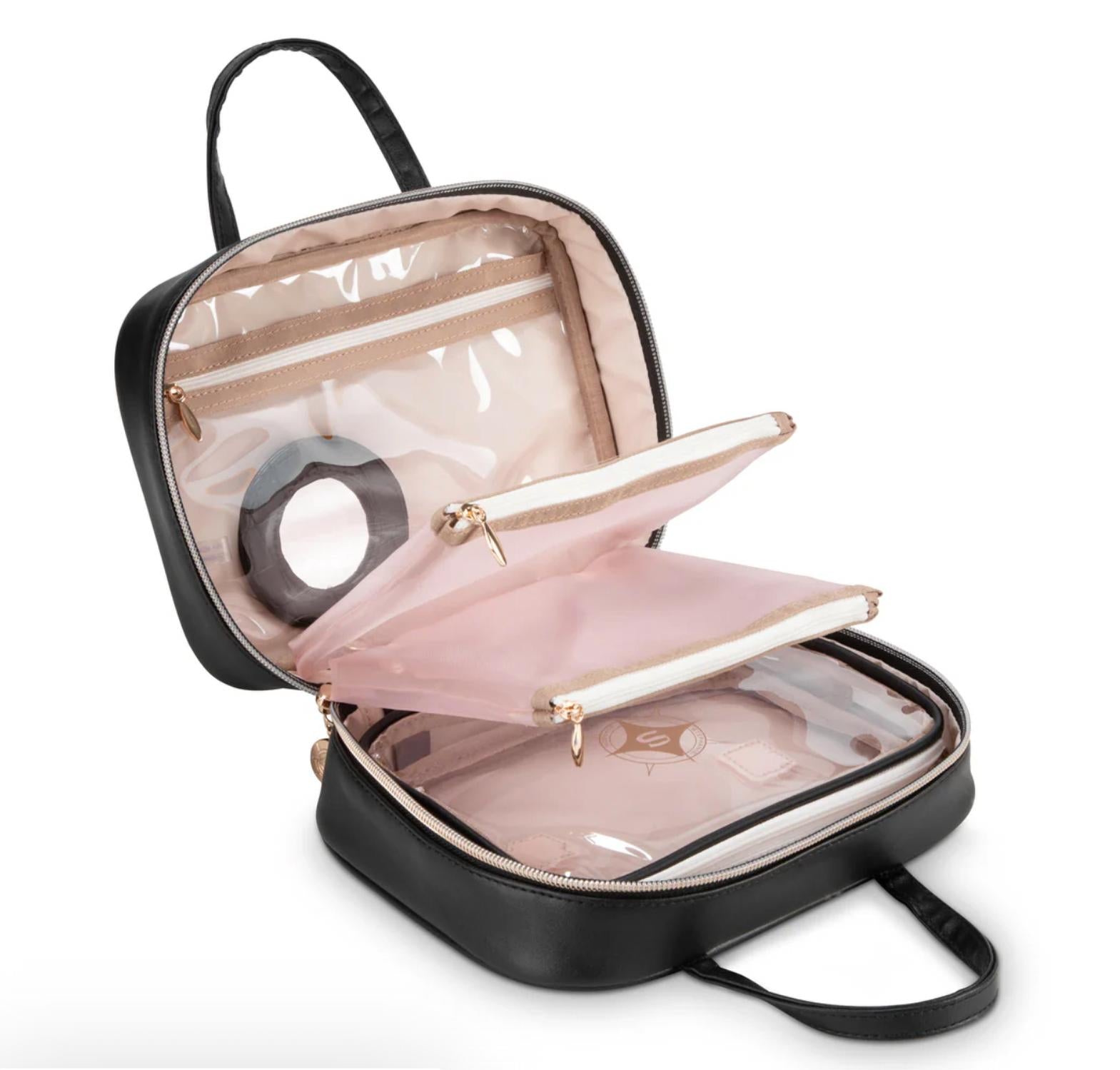A stylish bag to use for makeup, skincare, or anything else you might want to travel with in style. Discover the Women's Belize Raven ML Traveler Bag by Stephanie Johnson, a chic and eco-friendly cosmetic case in sleek black. Crafted from 100% recycled post-consumer materials, this bag is designed for both home and on-the-go convenience. It features removable compartments, perfect for organizing your essentials like brushes and makeup. Embrace sustainable style with this must-have accessory for efficient beauty routines.