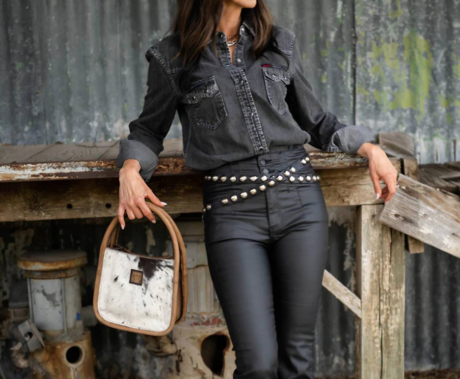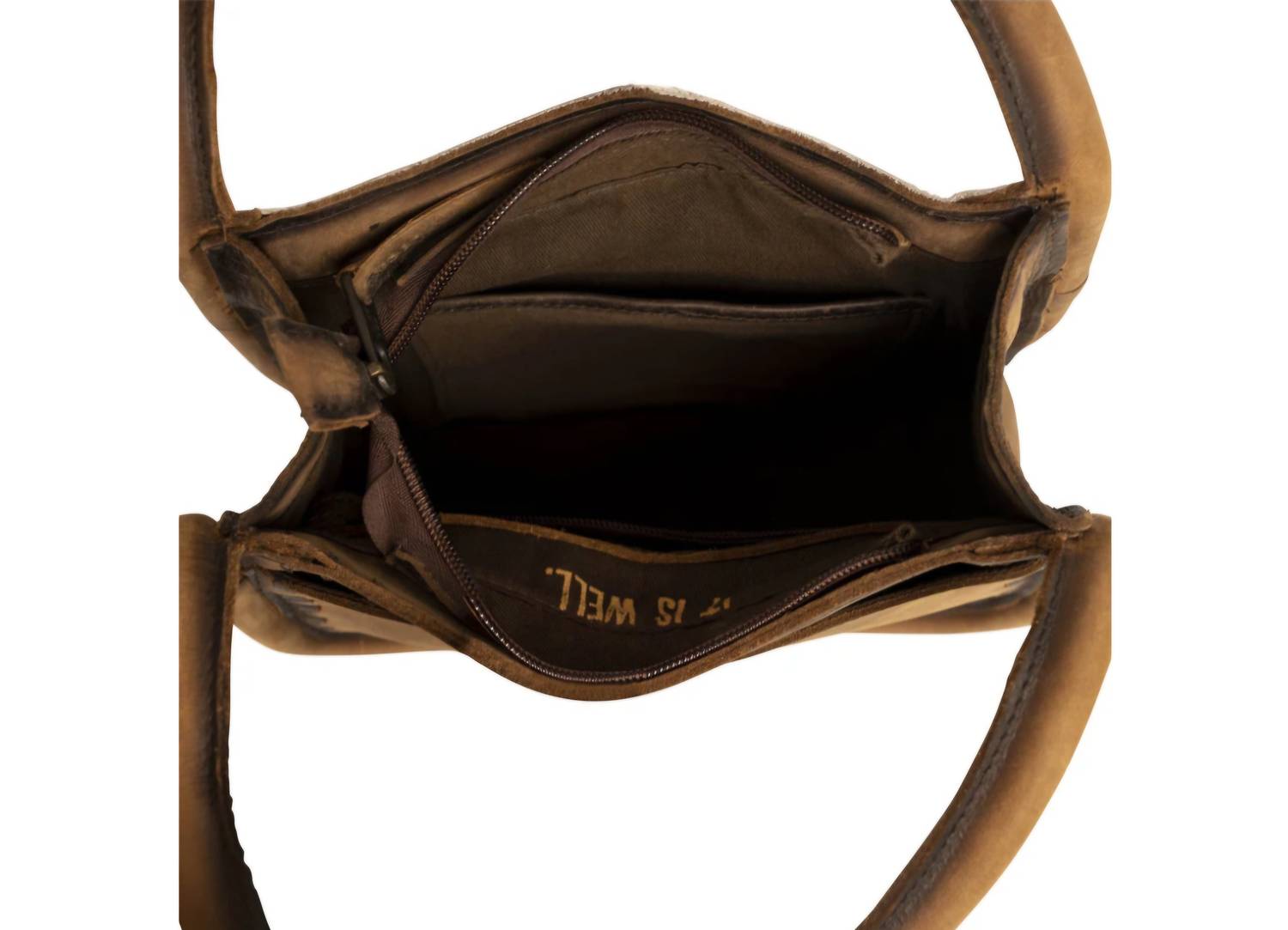 The cutest satchel bag that complements any outfit and carries just about everything you could possibly need. The Cowhide Sugar Satchel by STS Ranchwear showcases a unique blend of genuine hair on hide cowhide and buffed, brown full-grain leather. This satchel is equipped with dual rolled leather carry handles and a removable, adjustable crossbody strap for versatile carrying options. Featuring a zip closure, it offers a spacious main compartment with an interior slip pocket, zip pocket, and keychain clasp, as well as an additional exterior slip pocket for easy access to essentials. The satchel measures 9" W x 8.5" H at the bottom and 8" W x 8.5" H at the top, and is marked with the inspiring quote "It is well" inside.
