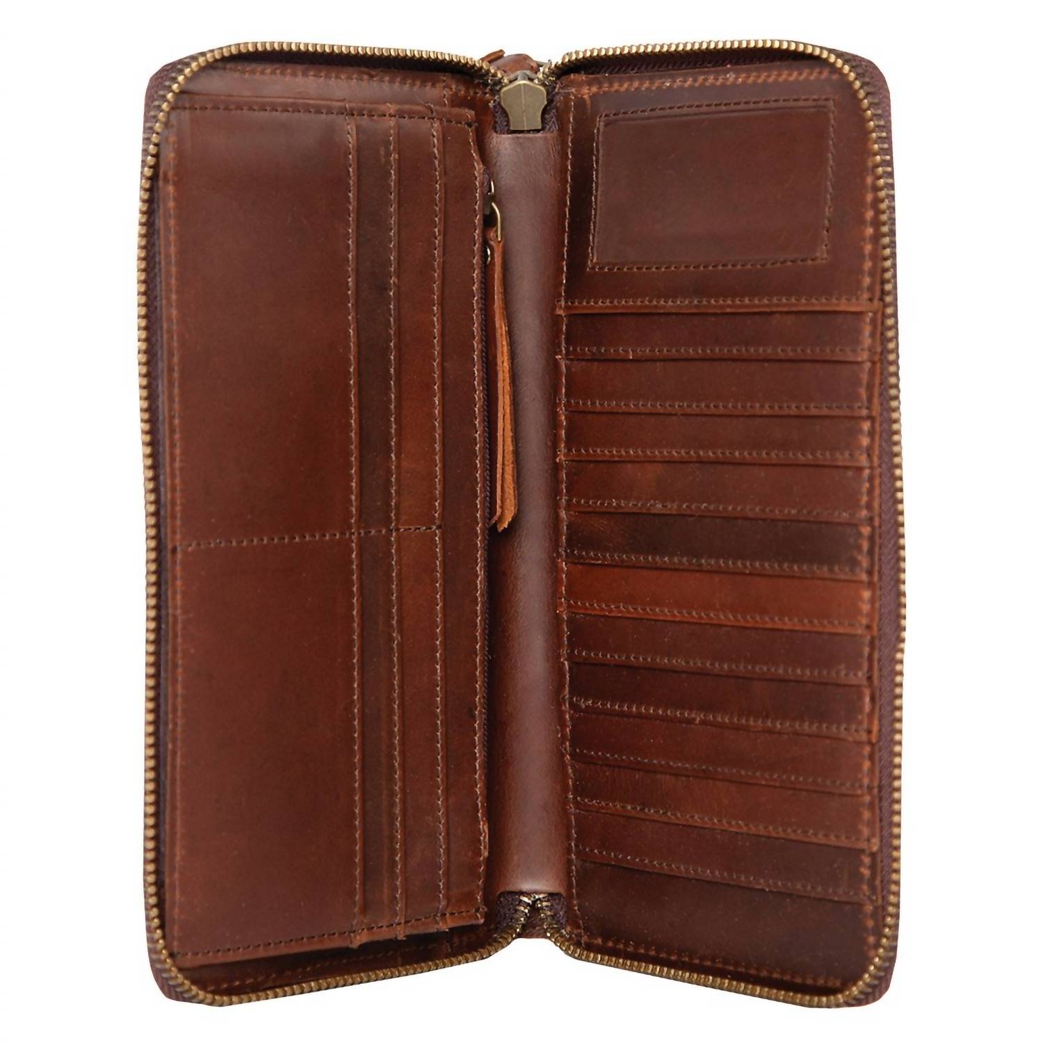 Enhance your accessory collection with this stylish wallet, expertly crafted to blend fashion and practicality. The multiple compartments provide easy organization for your cards and cash. Introducing the Women's All Around Bentley Wallet by STS Ranchwear in a stylish Cyclone brown. Crafted from genuine full grain leather, this wallet features an 8" wide design with multiple functionalities. Enjoy convenient access with a zip around closure using YKK zippers, an exterior snap closure slip pocket, card slots, an ID slot, an interior slip pocket, and an interior zip closure pocket. It also includes a removable leather wrist strap for added convenience.