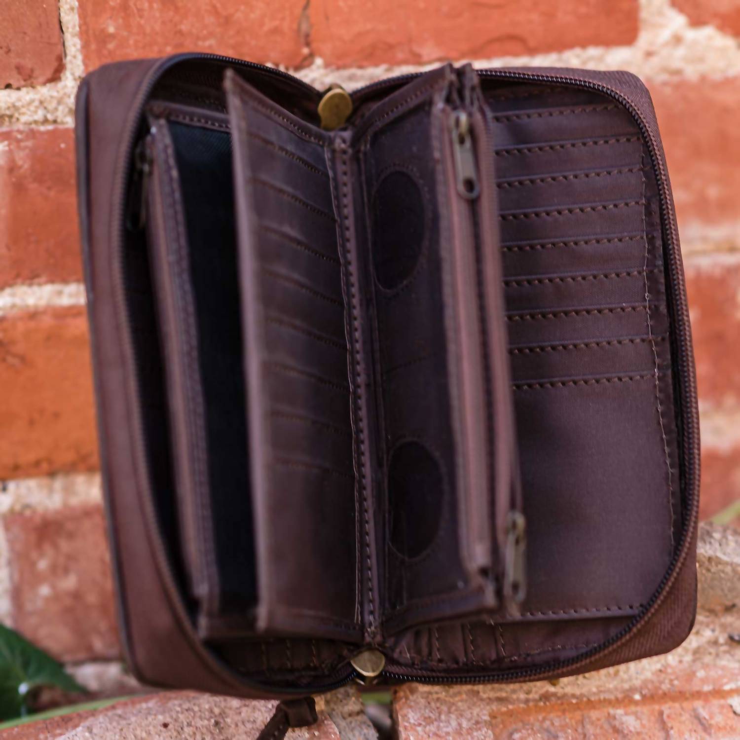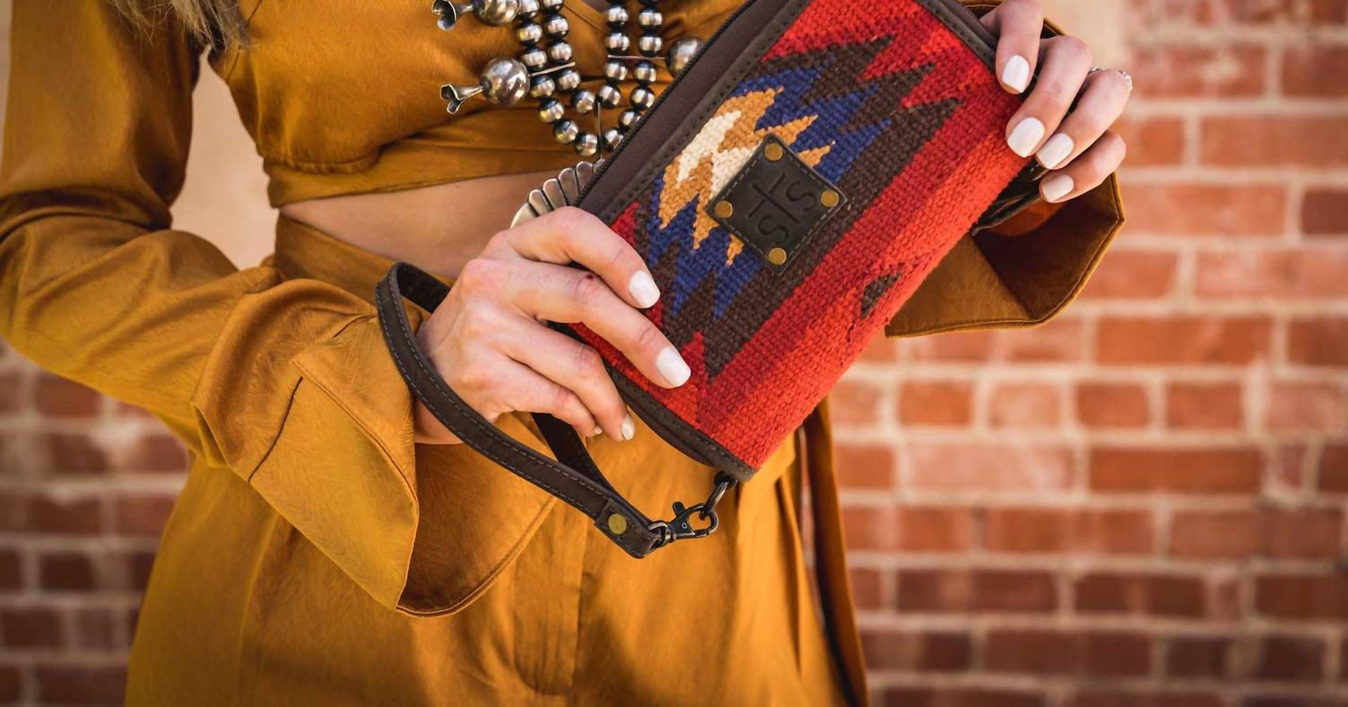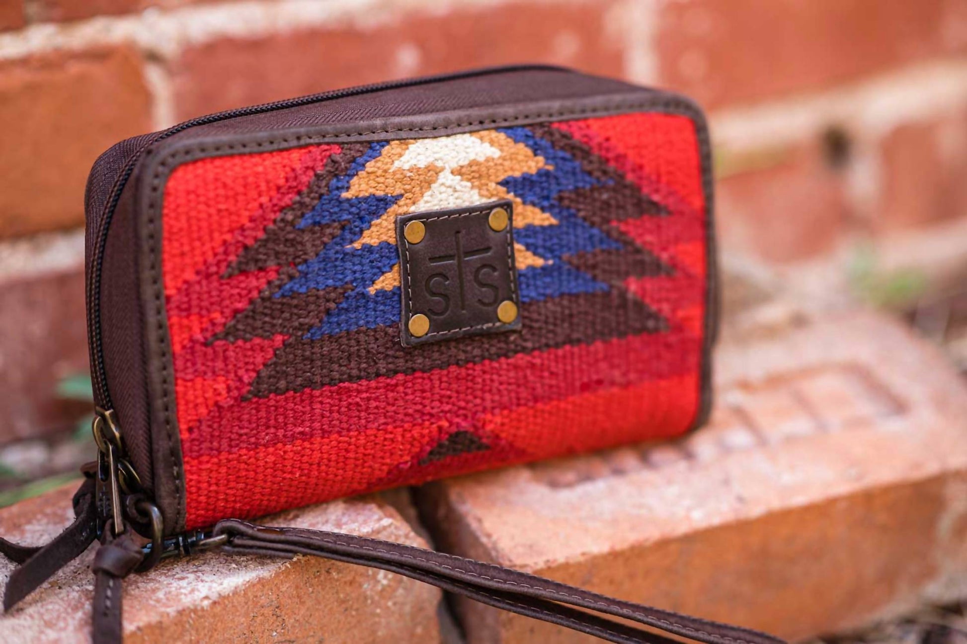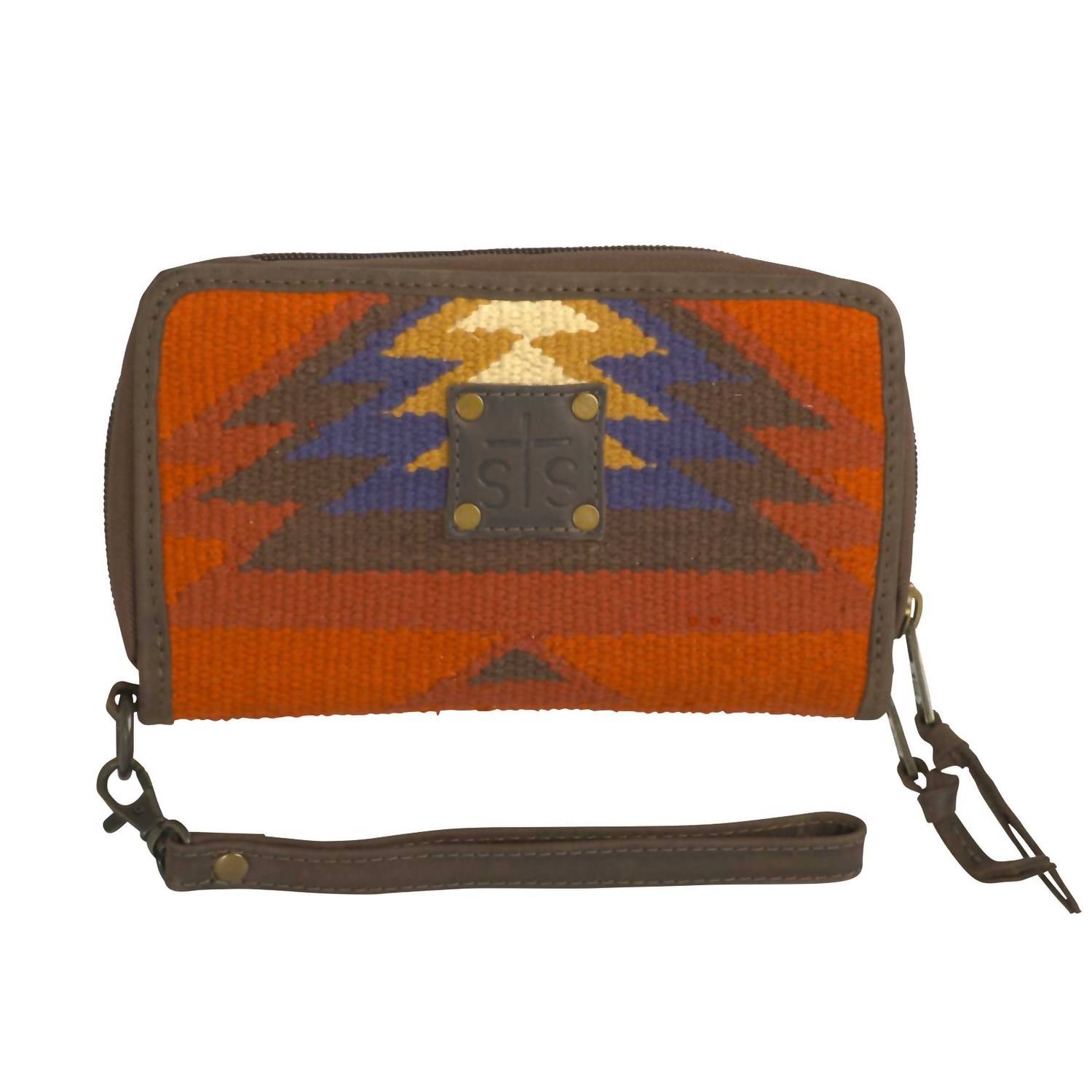 This little number holds all of the important things... lipstick, mints, credit card. The Women's Sun Kacy Organizer Bag by STS Ranchwear showcases a captivating Aztec woven serape with rich leather accents for a stylish Western touch. It features a zip-around closure, along with 32 interior card slots and three interior zip pockets, ensuring both style and functionality. This mini bag includes a removable leather wrist strap for versatile carrying and fits perfectly with dimensions of 9.75" width and 4.25" height. Ideal for those who appreciate a blend of traditional charm and modern convenience.