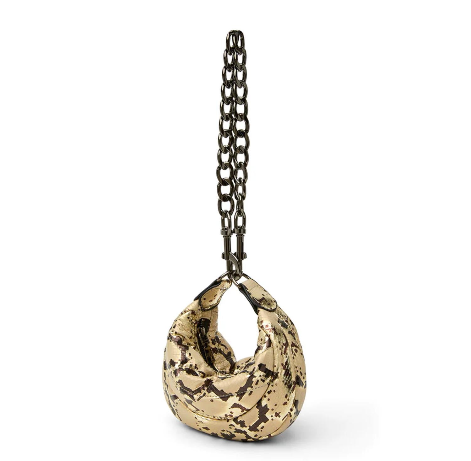 This crossbody bag will be your go-to bag of the season. Introducing the THINK ROYLN Tiny Dancer Crossbody Hobo Bag in elegant Python Luxe, a nod to the classic seventies statement with a modern twist. This versatile bag features a detachable metal chain strap and an adjustable crossbody strap with luxe trim, offering multiple ways to style. Crafted from durable 100% polyester nylon with a luxe embossed cowhide exterior, the bag dimensions are 6.5" in height, 2" in depth, and 10" in width. Elevate your fashion game with this chic accessory, perfect for both day and night outings.