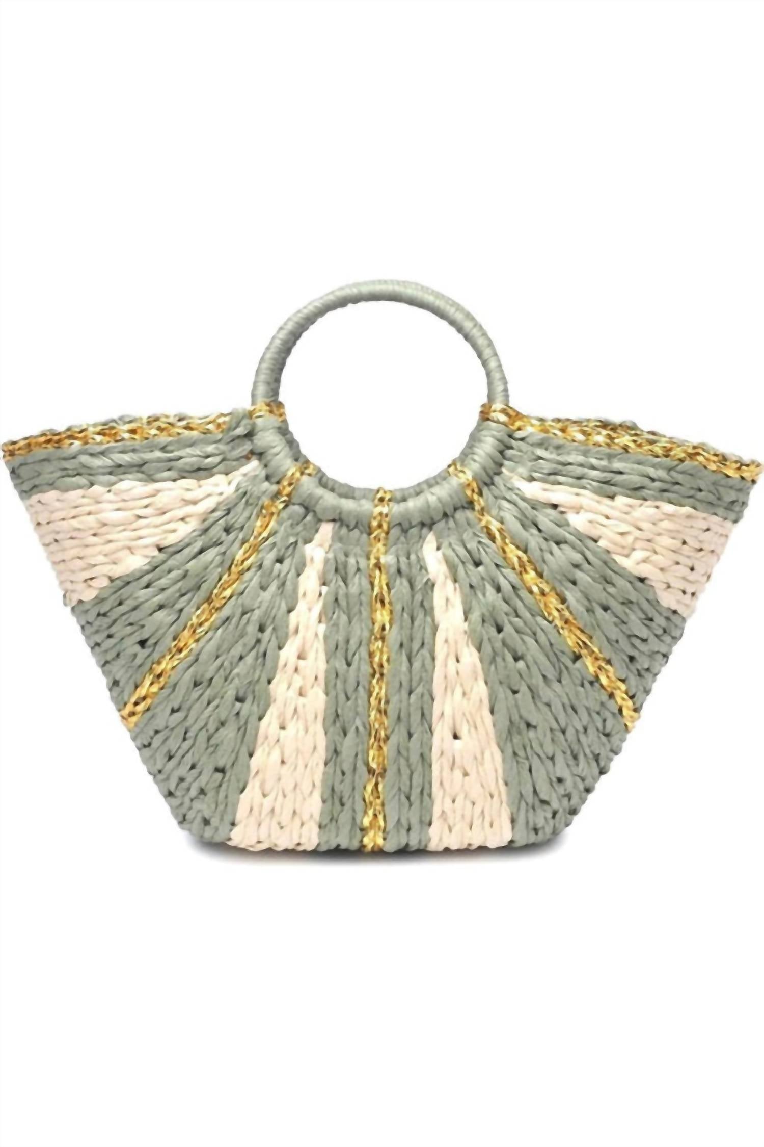 The Women's Straw Beach Tote Bag by Urban Expressions is your stylish summer essential in a chic sage hue. Crafted from straw with an open closure, this tote features a woven design with elegant gold metallic details and a geometric shape, enhanced by a round top handle. Its fabric-lined interior adds practicality, while its dimensions stand at a height of 12" (15" including handle), width of 5", and length of 9". Perfect for adding a touch of glamour to your sunny day outfits.