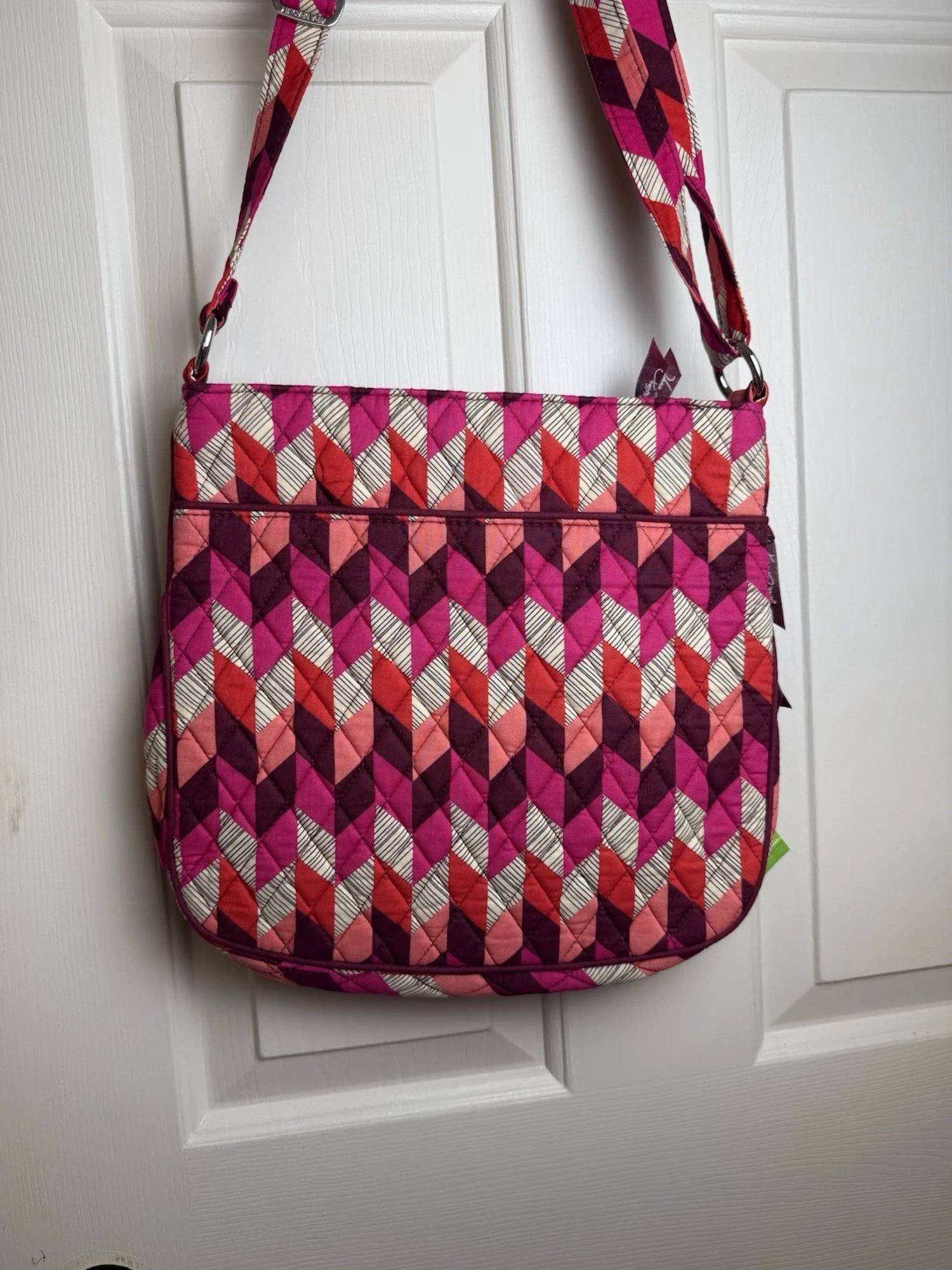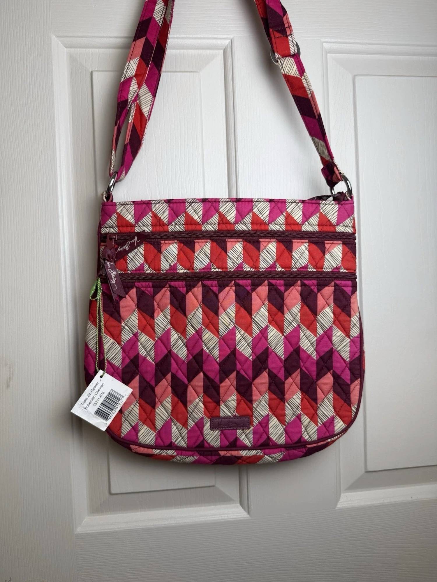 This crossbody bag will be your go-to bag of the season. The Vera Bradley Triple Zip Hipster Crossbody Bag in the retired Bohemian Chevron pattern is a lightweight quilted cotton bag in great pre-owned condition, featuring a secure top zip closure, three zippered compartments, multiple interior and exterior slip pockets for organized storage, and a 56" adjustable strap for crossbody or shoulder wear, all in a compact 11.75" x 11.75" x 1.25" design that blends style and everyday functionality.