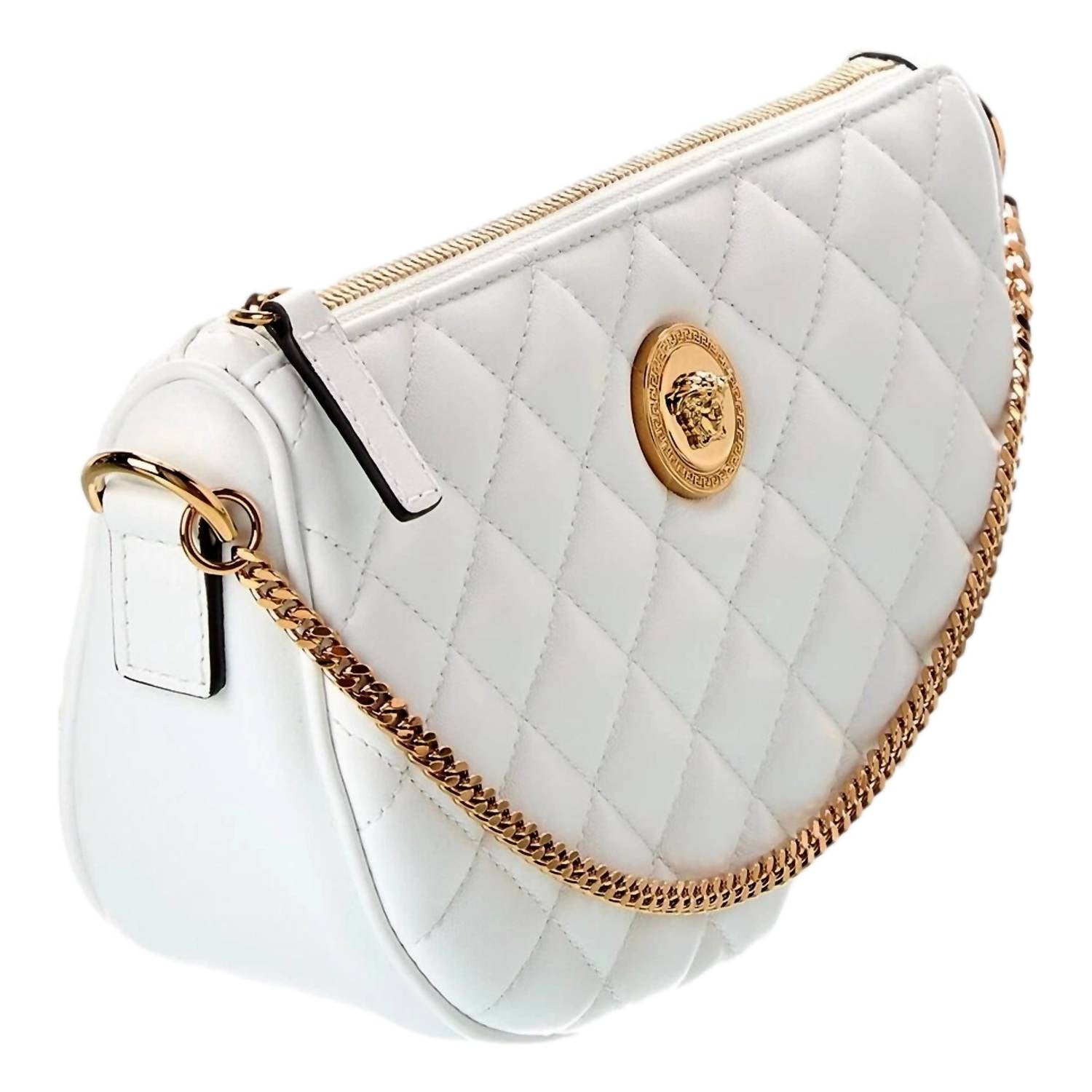 The crossbody bag is a trend that is here to stay and we especially love this style. Add a touch of opulence to your style with the Women's La Medusa Half Moon Quilted Nappa Leather Crossbody Bag by Versace. Expertly made in Italy, this white crossbody bag features luxurious quilted Nappa leather and is adorned with the iconic La Medusa emblem for a distinctive flair. Complete with gold-tone hardware, an adjustable leather strap with a 21" drop, and a chain strap detail, it ensures practicality with elegance. Its compact dimensions of 9" x 3" x 6" make it an ideal companion for a chic, modern ensemble.