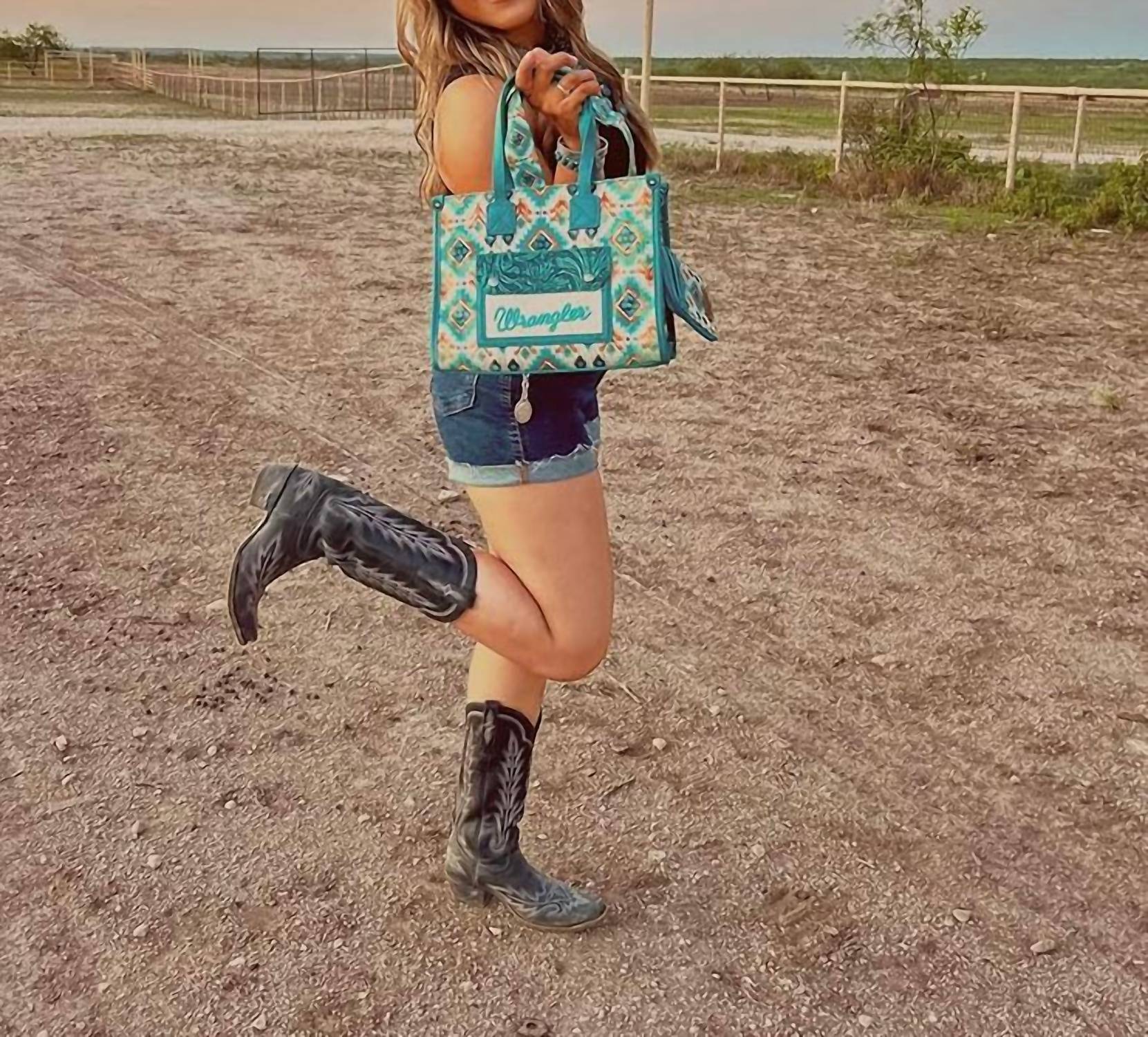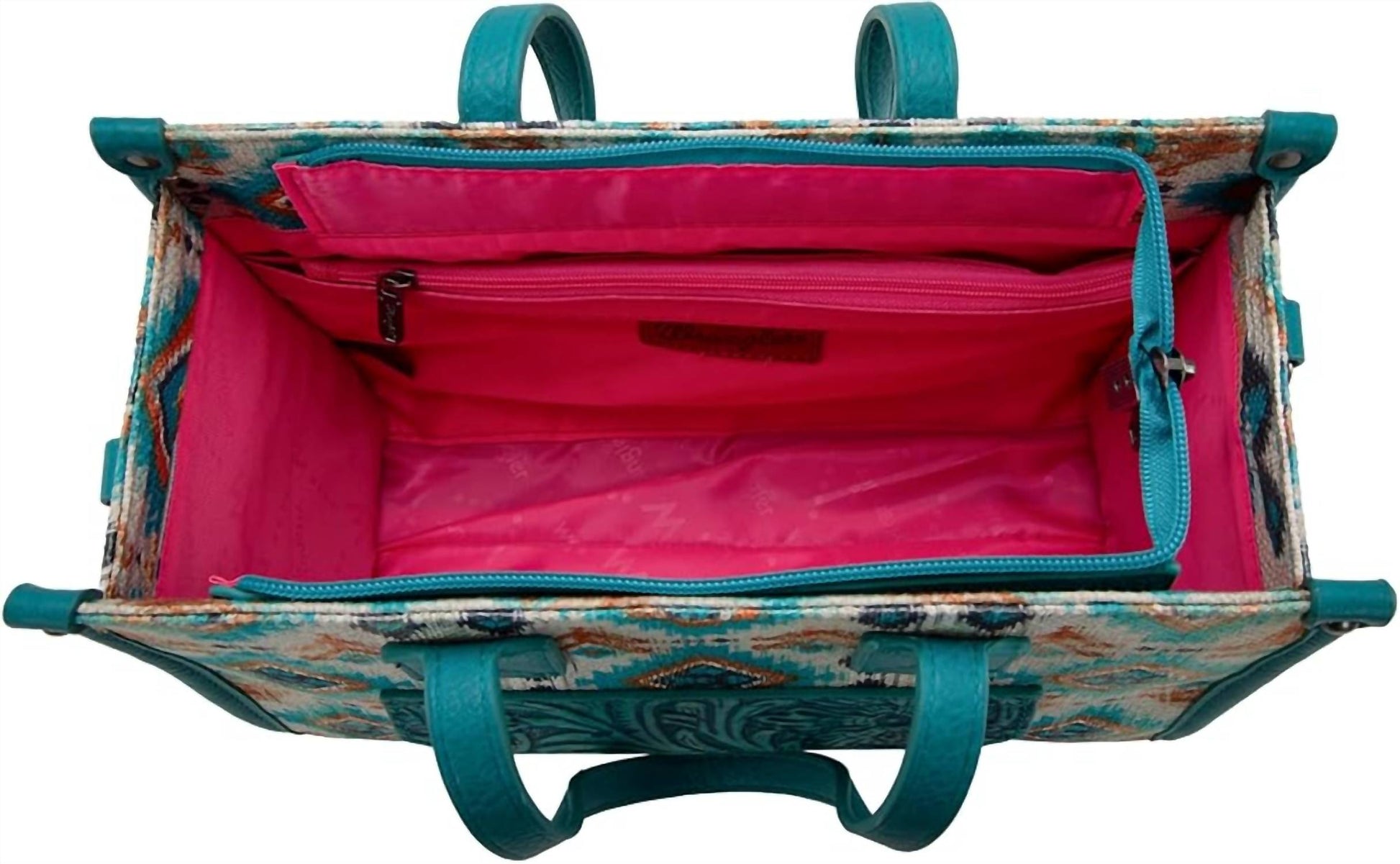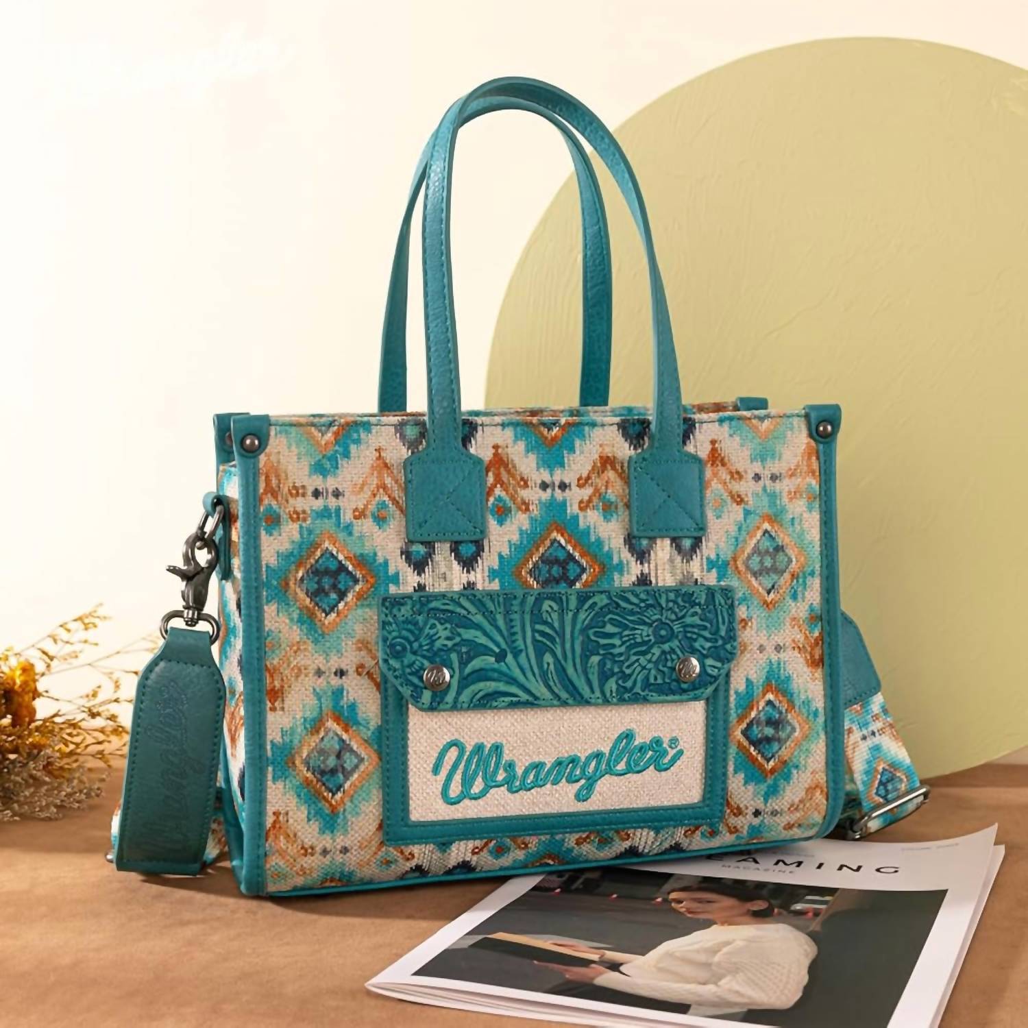 This crossbody bag will be your go-to bag of the season. Introducing the Wrangler Aztec Crossbody Tote Bag in a vibrant turquoise hue, crafted for style and durability. Made with heavy-duty fabric and trimmed in turquoise faux leather, this bag offers a front snap closure pocket with Wrangler embroidery, a functional back pocket, and a zip top entry. Inside, a bright pink satin fabric adds a pop of color, with a deep zip pocket for organization and a slip pocket for additional storage. Dimensions: 11" wide x 8.5" tall x 3.25" deep with a 6.5" strap drop, featuring a versatile Aztec turquoise nylon strap for crossbody or shoulder wear.