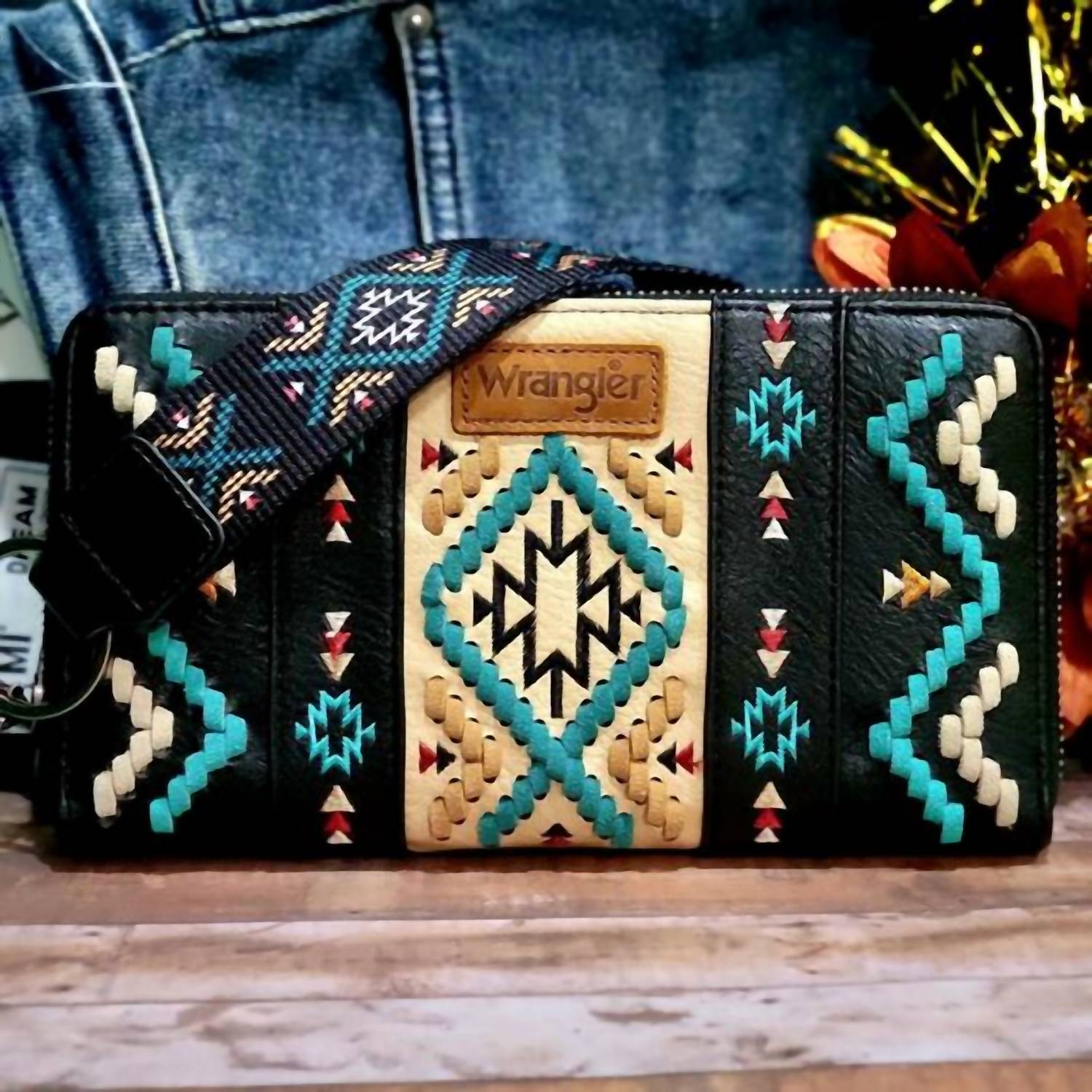 Lipstick, check. Mints, check. Credit card, check. The cutest little bag that holds all of your necessities. Introducing the Women's Western Leather Wristlet Purse by Wrangler, a chic and compact accessory for any occasion. Made from durable leather, this black wristlet features a classic western design and a convenient wrist strap for easy portability. It's spacious enough to accommodate your phone, cards, and cash, making it the perfect companion for nights out, quick errands, or events. Ideal for those who appreciate both style and functionality, this wristlet adds a practical touch of western charm to any look.