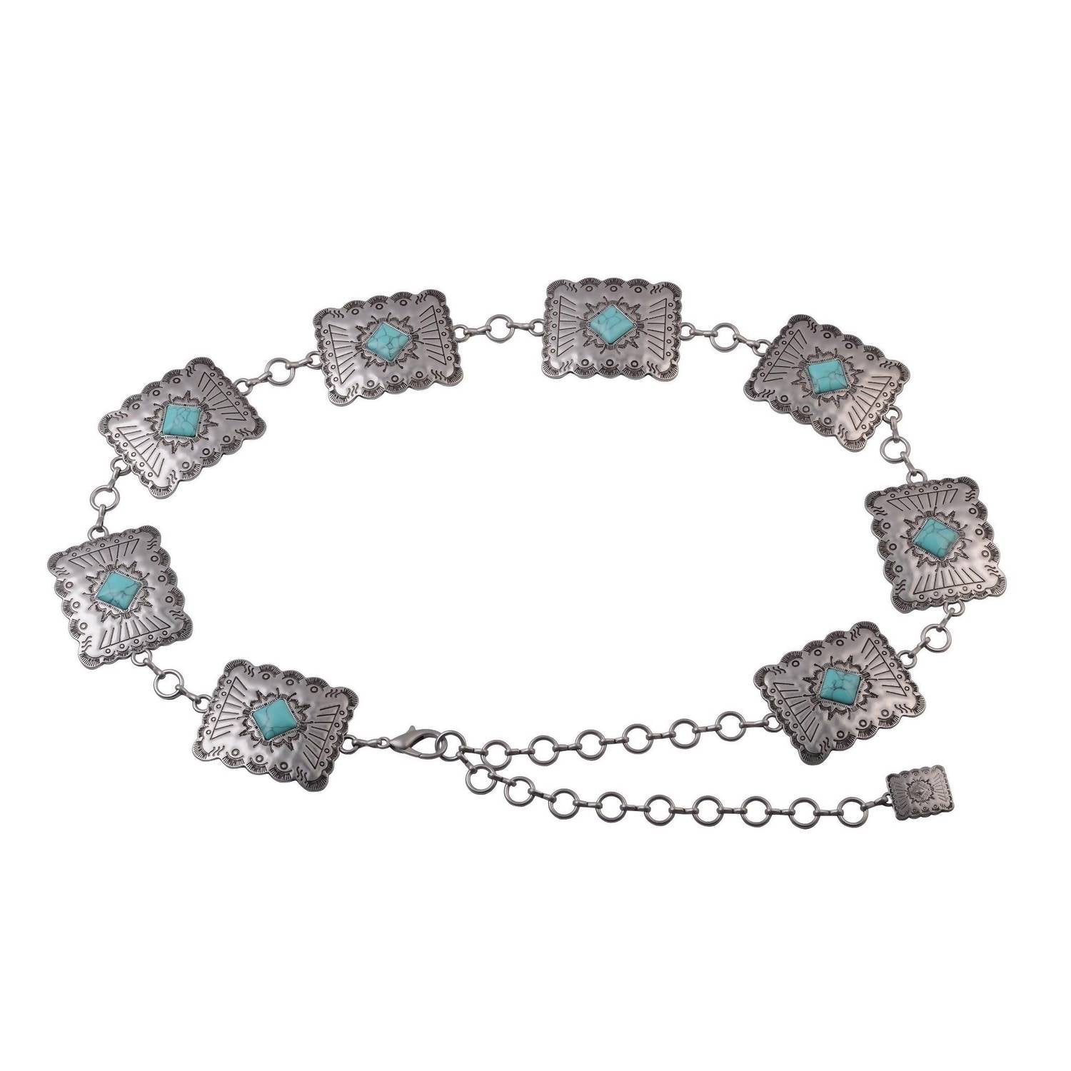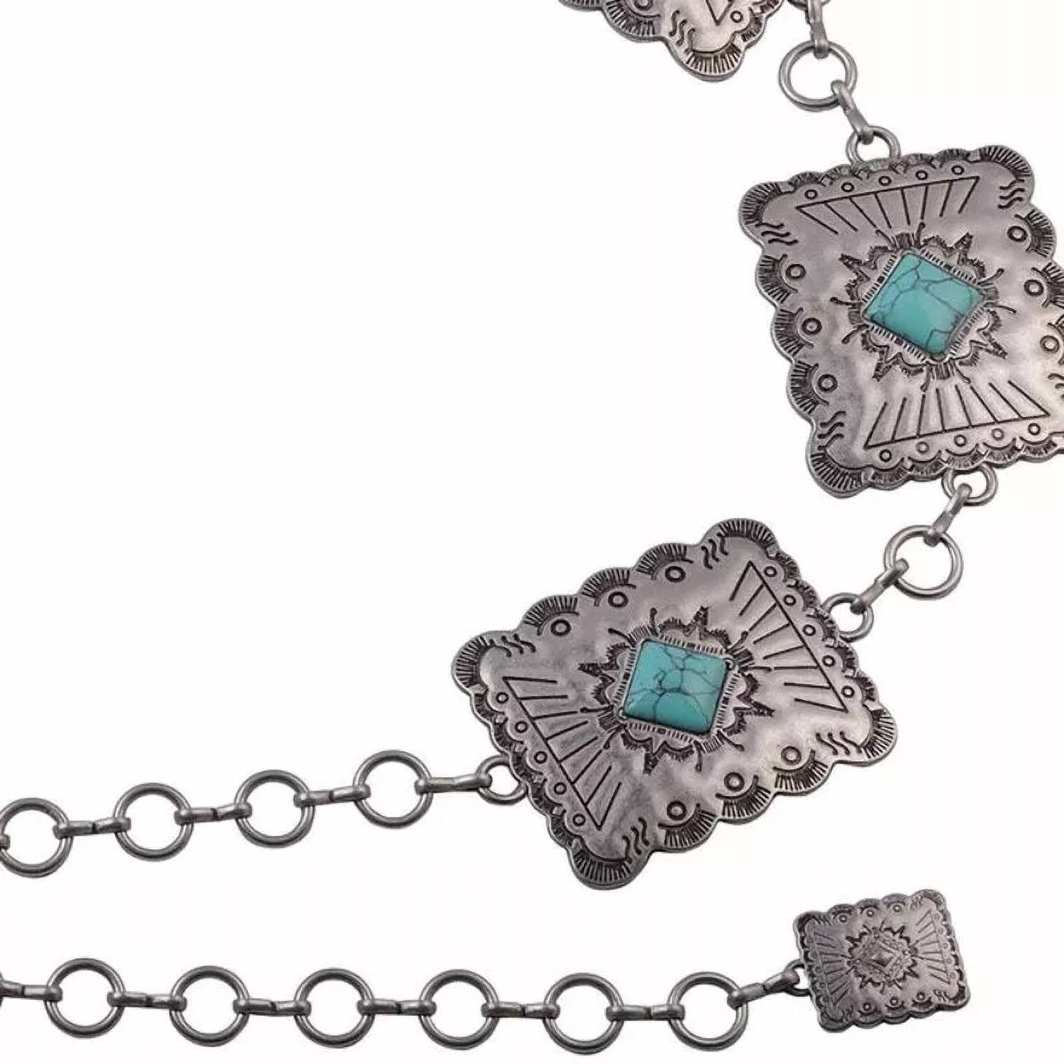 The perfect belt can really tie an outfit together and this one is no exception. Classic in its design and built to last, this belt can complement any outfit. Elevate your wardrobe with the Women's Square Concho Chain Belt by Most Wanted in a striking silver finish. This chic belt features vintage square conchos with turquoise stone centers, linked by a sturdy chain for added durability. Crafted from high-quality alloy metal, it measures 44.5" in length and 2" in width, offering a versatile one-size-fits-most option. Perfectly pair it with jeans or cinch it over a dress for a stylish western-inspired look.