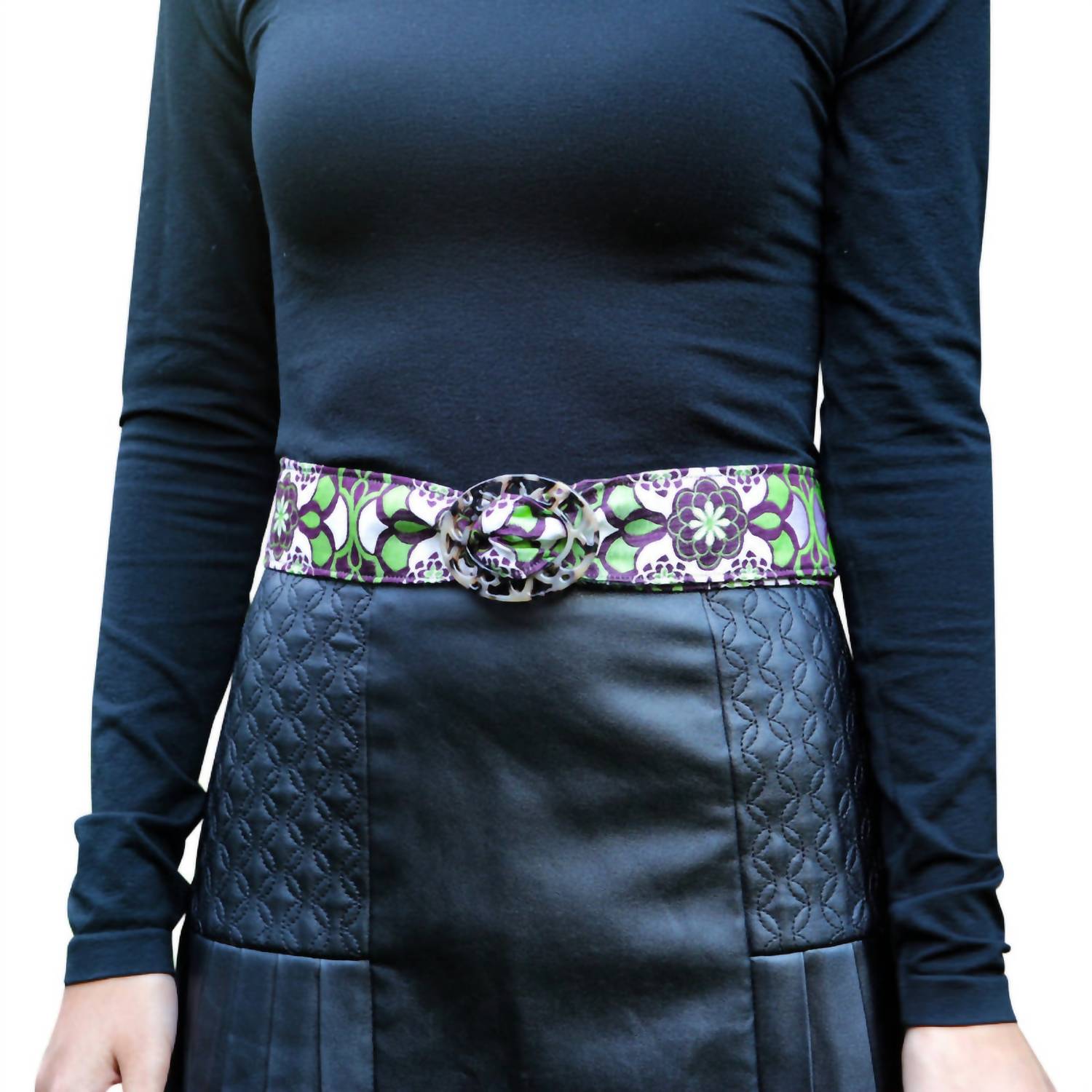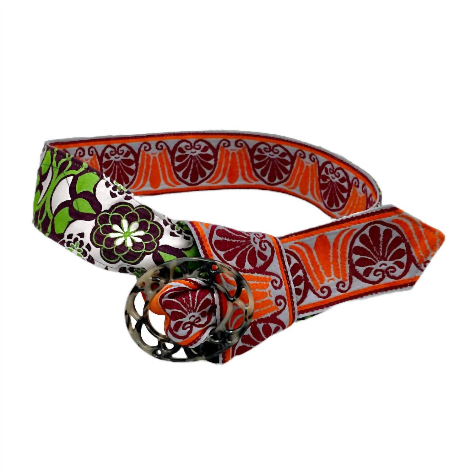 Upgrade your accessory game with this stylish and versatile belt that will tie any outfit together. This must-have accessory is classic in its design and will never go out of style. Introducing the Reversible Floweret Belt by Hadley Pollet, a chic accessory in a refreshing grass color that adds versatility and style to any outfit. This women's hand-crafted belt features a unique reversible jacquard design with a tortoise buckle, allowing you to switch up your look effortlessly. Perfect for adding a floral touch to jeans, skirts, or dresses. Elevate your on-the-go wardrobe with this must-have belt. Small- 38" long ~ Medium- 40" ~ Large- 42" ~ X-Large- 44"