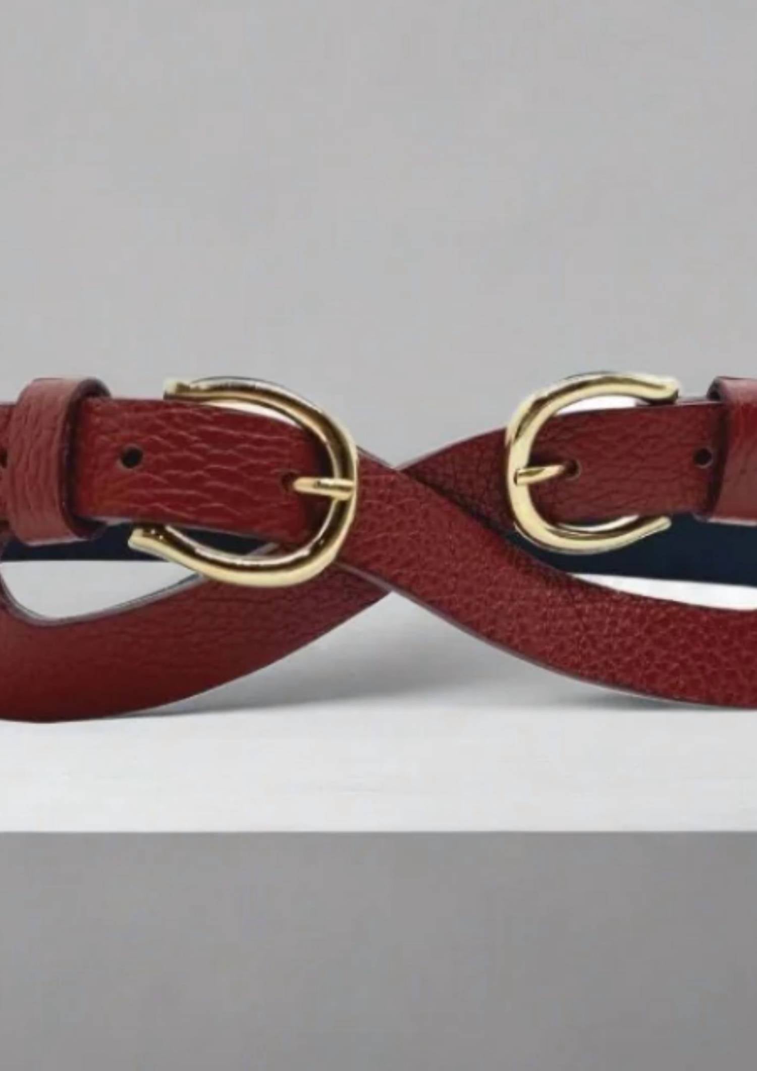The perfect belt can really tie an outfit together and this one is no exception. Classic in its design and built to last, this belt can complement any outfit. Add a sophisticated touch to your outfit with the Women's Criss Cross Belt by Berge, crafted from smooth dark red Italian leather. Its unique hourglass shape is accentuated by two elegant gold oval buckles, allowing adjustable fastening. Made in Italy, this 2" wide belt can be styled high at the waist or draped over the hips. Combine with jeans or dresses for versatile fashion, and remember to size up if styling lower on the hips.
