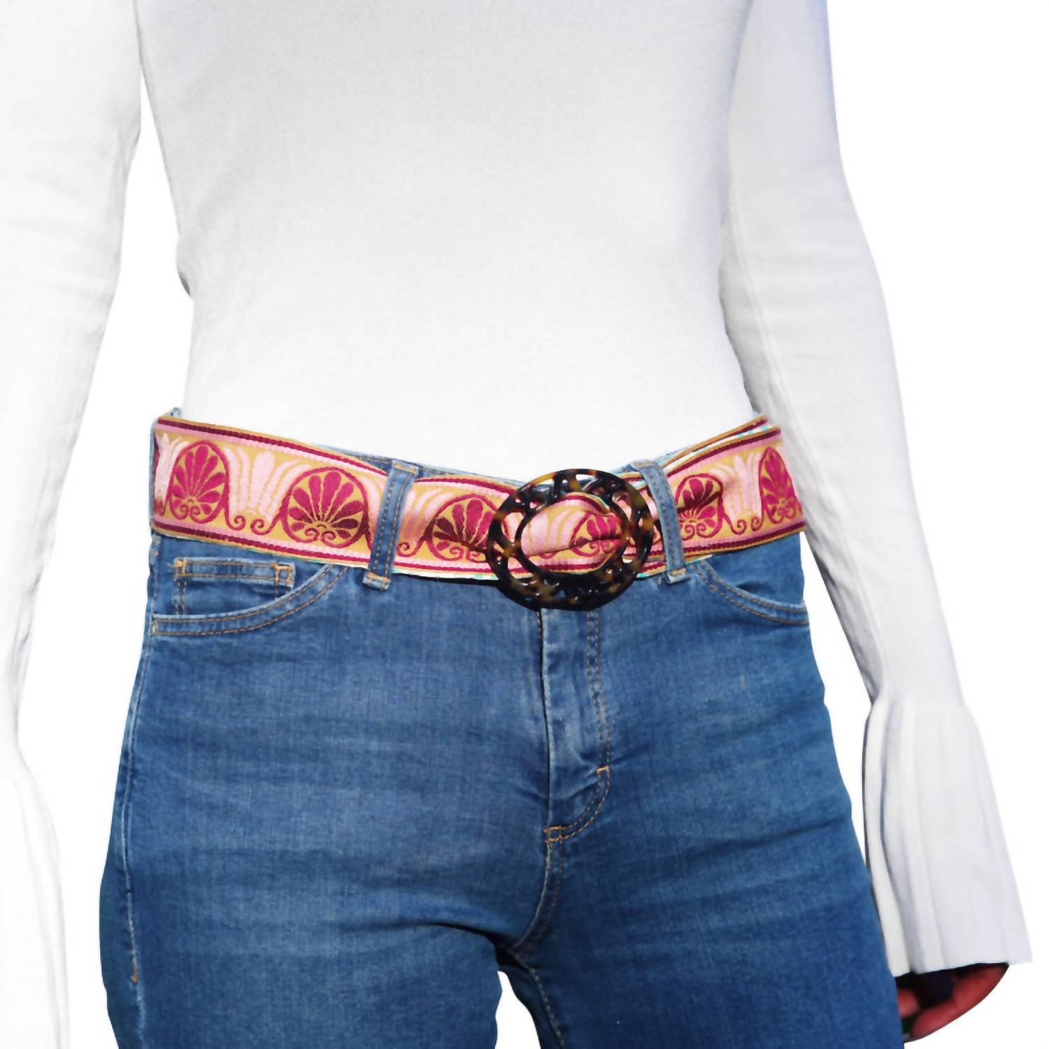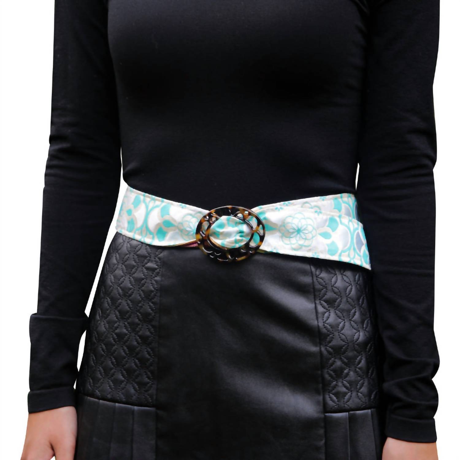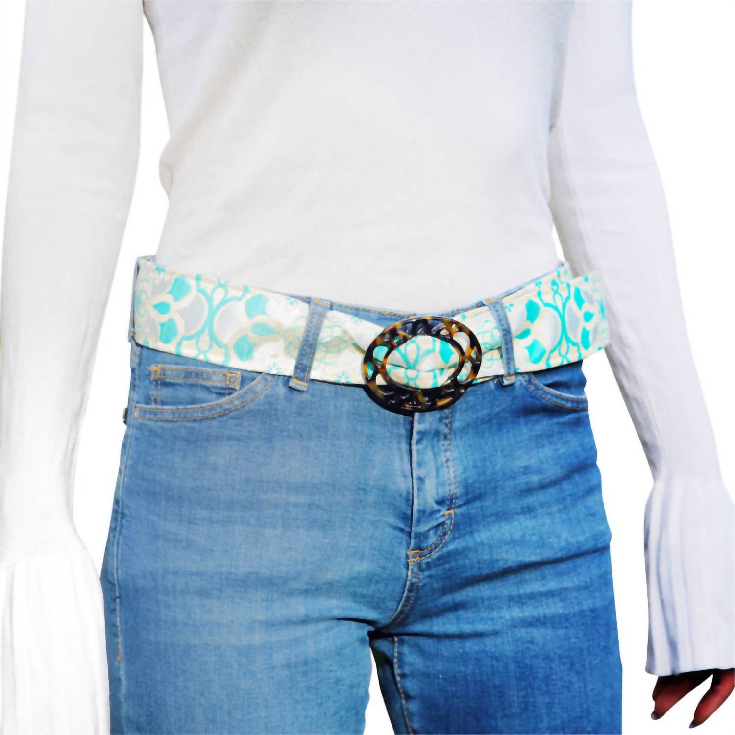 Upgrade your accessory game with this stylish and versatile belt that will tie any outfit together. This must-have accessory is classic in its design and will never go out of style. Embrace versatile style with the Reversible Floweret Belt by Hadley Pollet, perfect for adding a chic touch to any outfit. This handcrafted jacquard belt features a unique tortoise buckle and comes in stunning sea color. Ideal for switching up your look, this belt is a great addition to any wardrobe. Small- 38" long ~ Medium- 40" ~ Large- 42" ~ X-Large- 44"