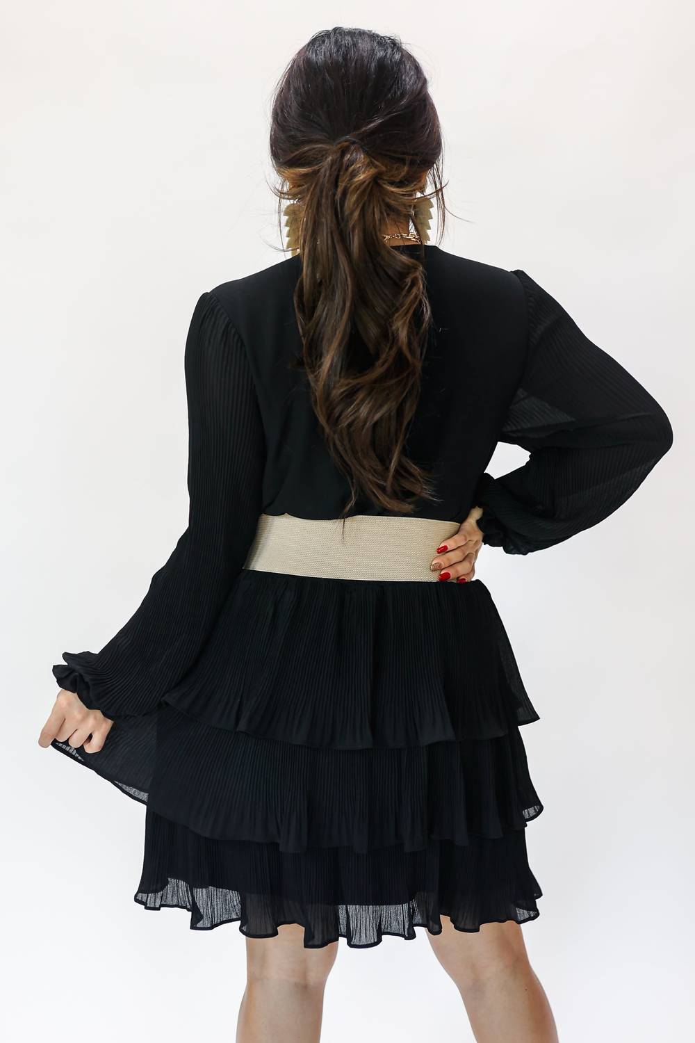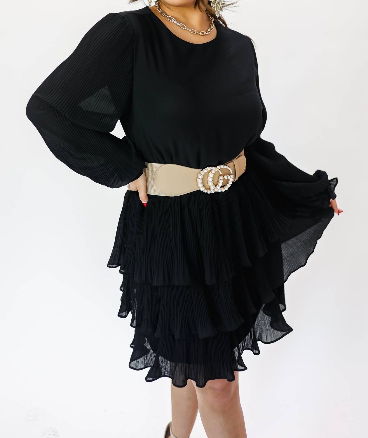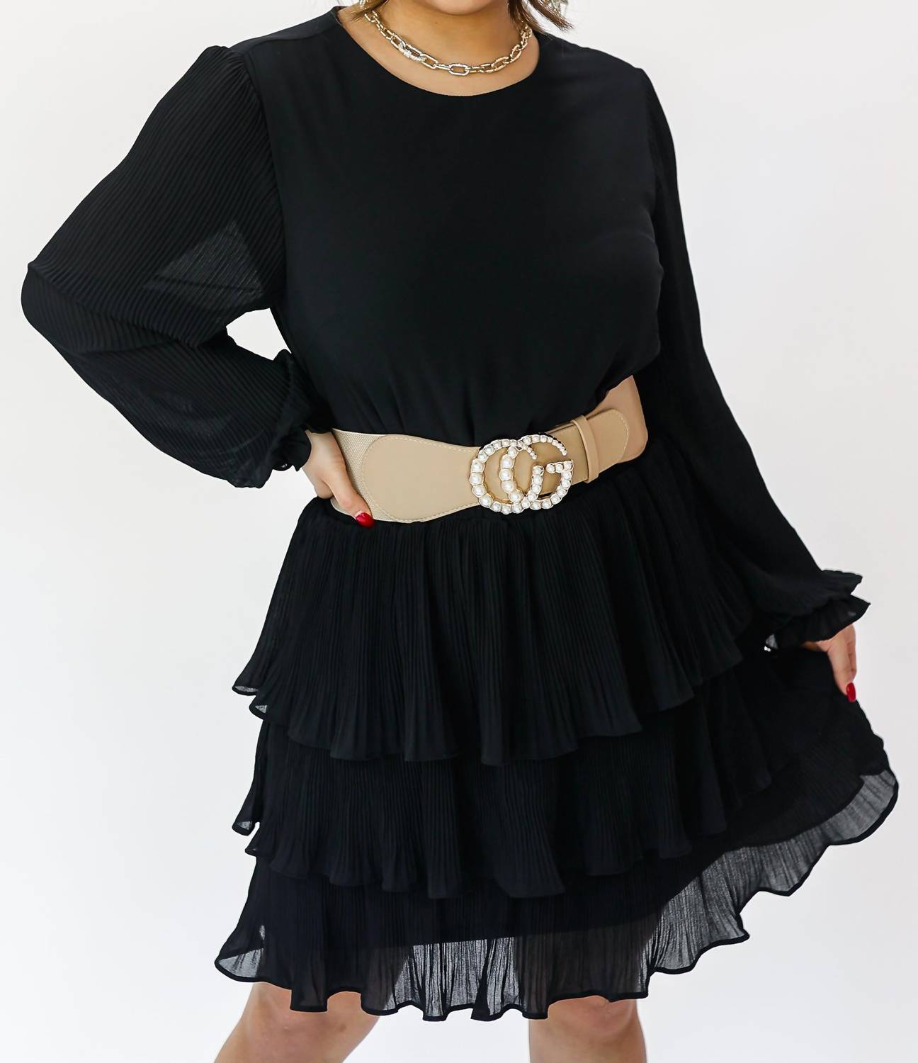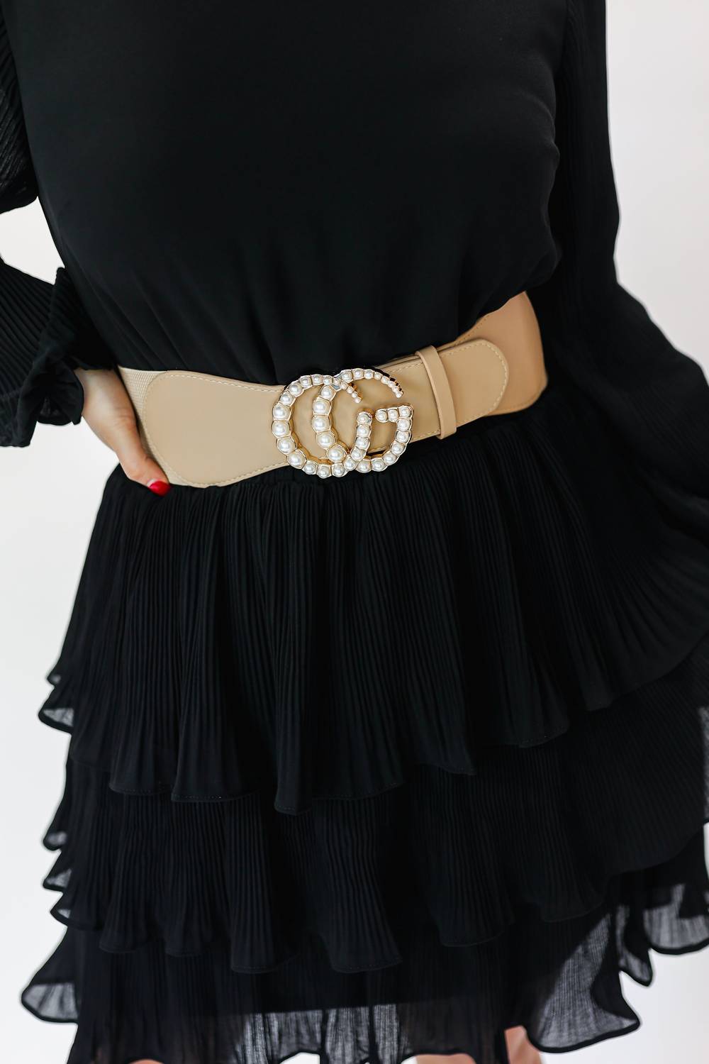 This stretchy statement belt featuring a large pearl and gold buckle! It is adjustable for comfort and can be worn on the waist or hips. One size fits most.