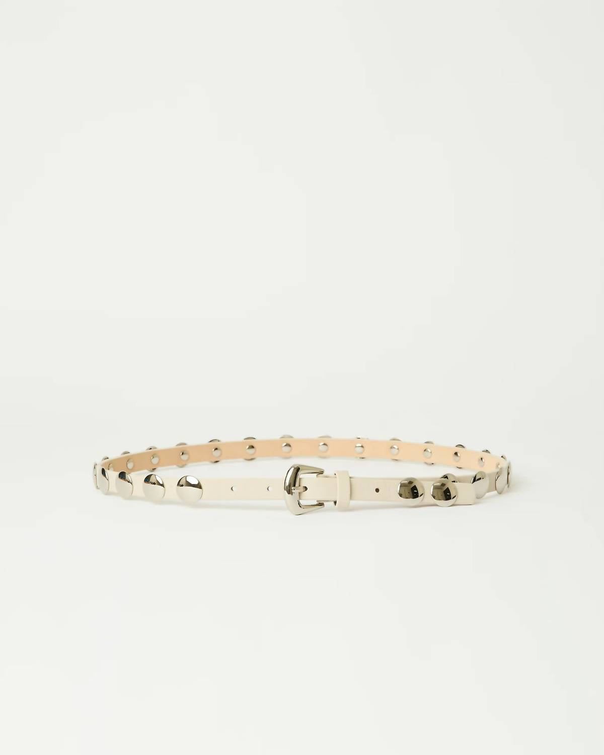 Elevate your style with the B-Low the Belt Women's Ames Leather Belt in Bone/Silver, combining edgy elegance with a polished aesthetic. Featuring dome metal studs, a sleek polished buckle, and a versatile 0.5-inch width, this genuine leather belt is designed with a nubuck lining for added comfort. Its adjustable design with 5 holes ensures a perfect fit as a hip belt for any outfit. This imported accessory is perfect for adding a touch of sophistication to your wardrobe.
