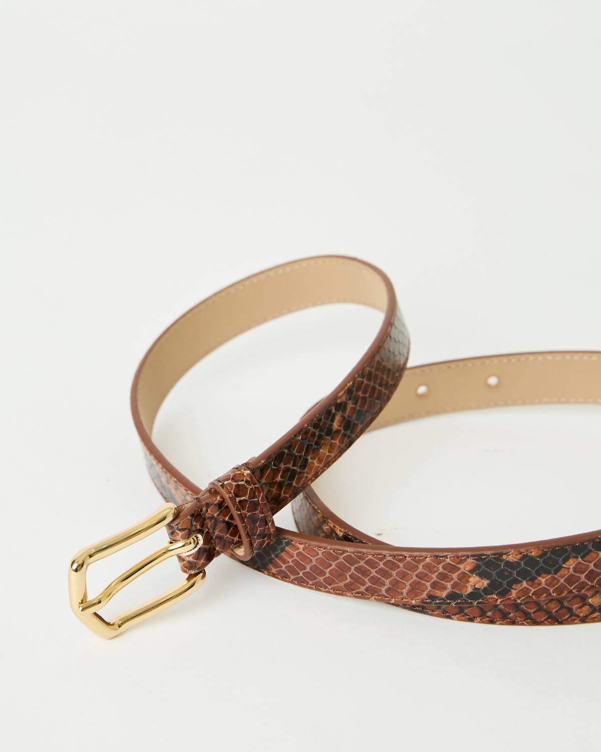 Enhance your ensemble with the Women's Calvin Python Leather Belt by B-Low The Belt in striking Cognac Gold. This waist belt is masterfully crafted from python-embossed genuine leather with a luxurious nubuck lining, providing a refined elegance. The belt features a gold-tone buckle and is adjustable with five holes, offering a comfortable fit and strap width of 0.75 inches. Made in Italy, it's the perfect accessory to transition your look from day to night gracefully.