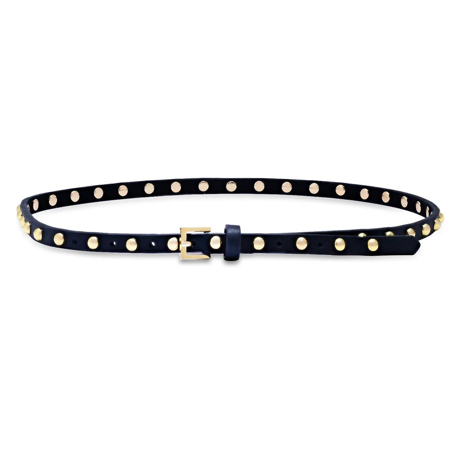 Introducing the Women's Centinela Belt by Laurel and Gold, a striking accessory that adds a touch of rock and roll to any outfit. Crafted from genuine leather in a chic black and gold colorway, this belt is embellished with gold domes throughout. It measures 1/2" wide and features seven holes for size adjustment. Closure: Buckle and leather loop.