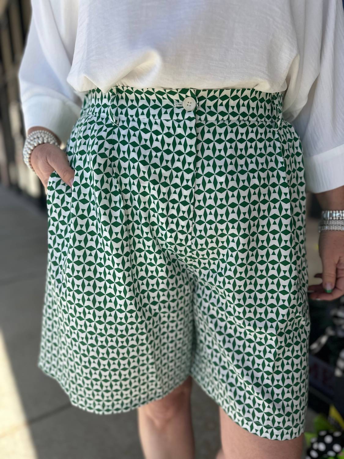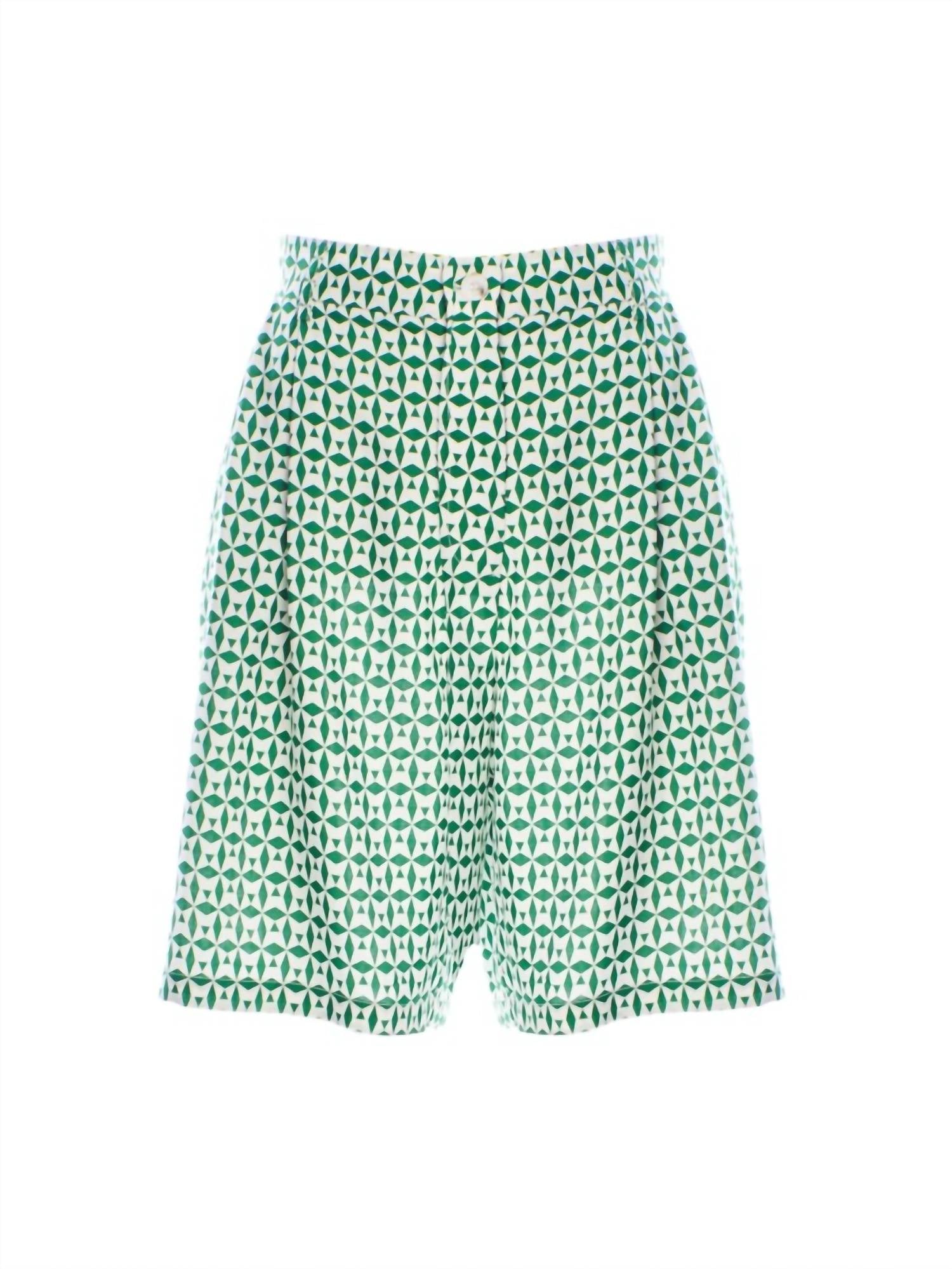 Discover the ultimate warm-weather essential with these stylish women's Bermuda shorts, skillfully crafted to provide a harmonious fusion of fashion and function. The Geom Bermuda Shorts by Anonyme effortlessly blend style and functionality with their patterned design in a fresh green hue. Crafted from 100% lightweight polyester, these women's shorts feature a longer length with a modern, shorter cut, perfect for versatile styling. Equipped with two front pockets and a convenient button closure, they offer both practicality and sleek appeal.