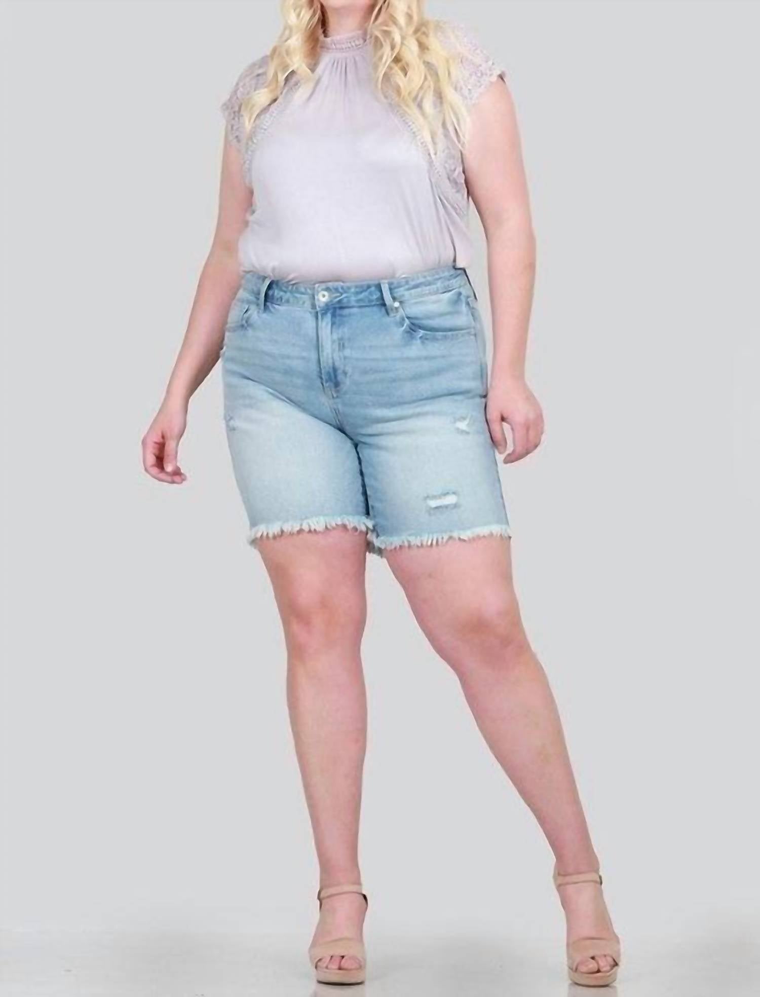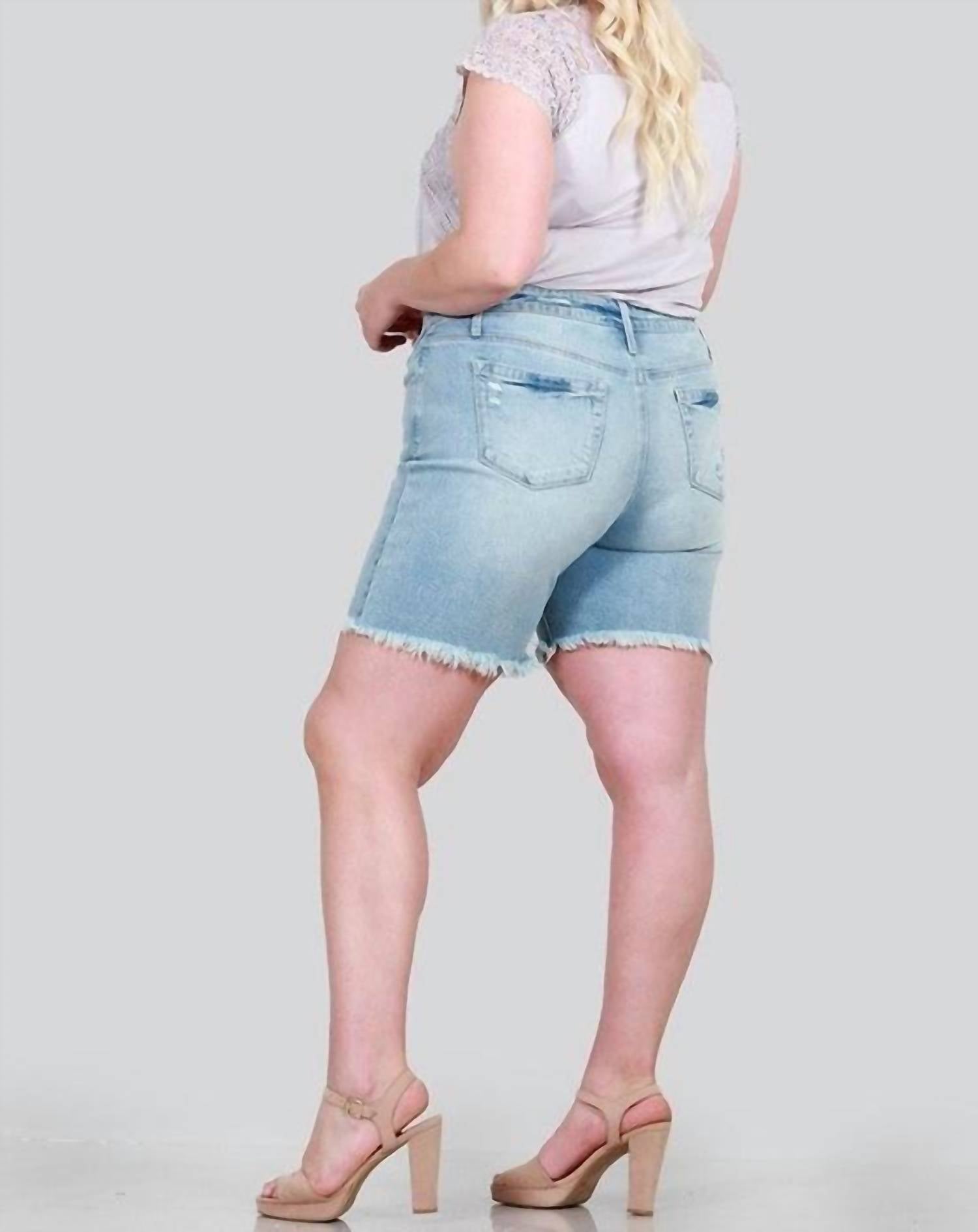 A preppy and feminine take on the classic bermuda short. Comfortable enough to lounge in and cute enough to wear out during your next warm weather outing. Introducing the Mid Rise Bermuda Shorts by Special A, a must-have for your summer wardrobe. These light wash shorts feature thigh-length with a natural fray hem and a comfortable stretch fabric. With a composition of 99% cotton and 1% spandex, they offer a button closure and classic 5-pocket styling. Care: Machine wash. Model is wearing a size 1XL with a front rise of 11 3/4", an inseam of 7 1/2", and a leg opening of 23".