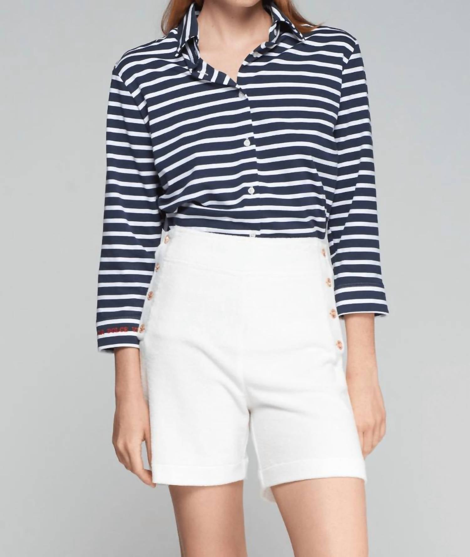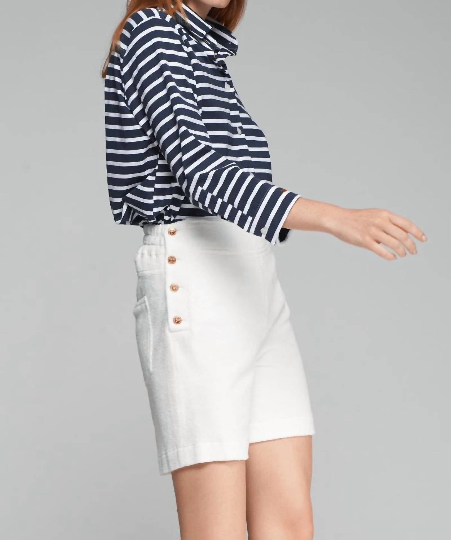 Embrace the perfect blend of comfort and style with these fashionable women's Bermuda shorts, expertly designed to offer a flattering fit and versatile wear. Discover the Tea Sweatshirt Bermuda Short by Vilagallo, a minimalist summer staple crafted for both comfort and style. These plush white shorts feature a solid pattern and are made from 100% cotton stretch fabric. Adorned with gold buttons on the sides, they incorporate convenient pockets for practicality. With a button closure and machine wash care instructions, these shorts are perfect for a vacation-ready look.