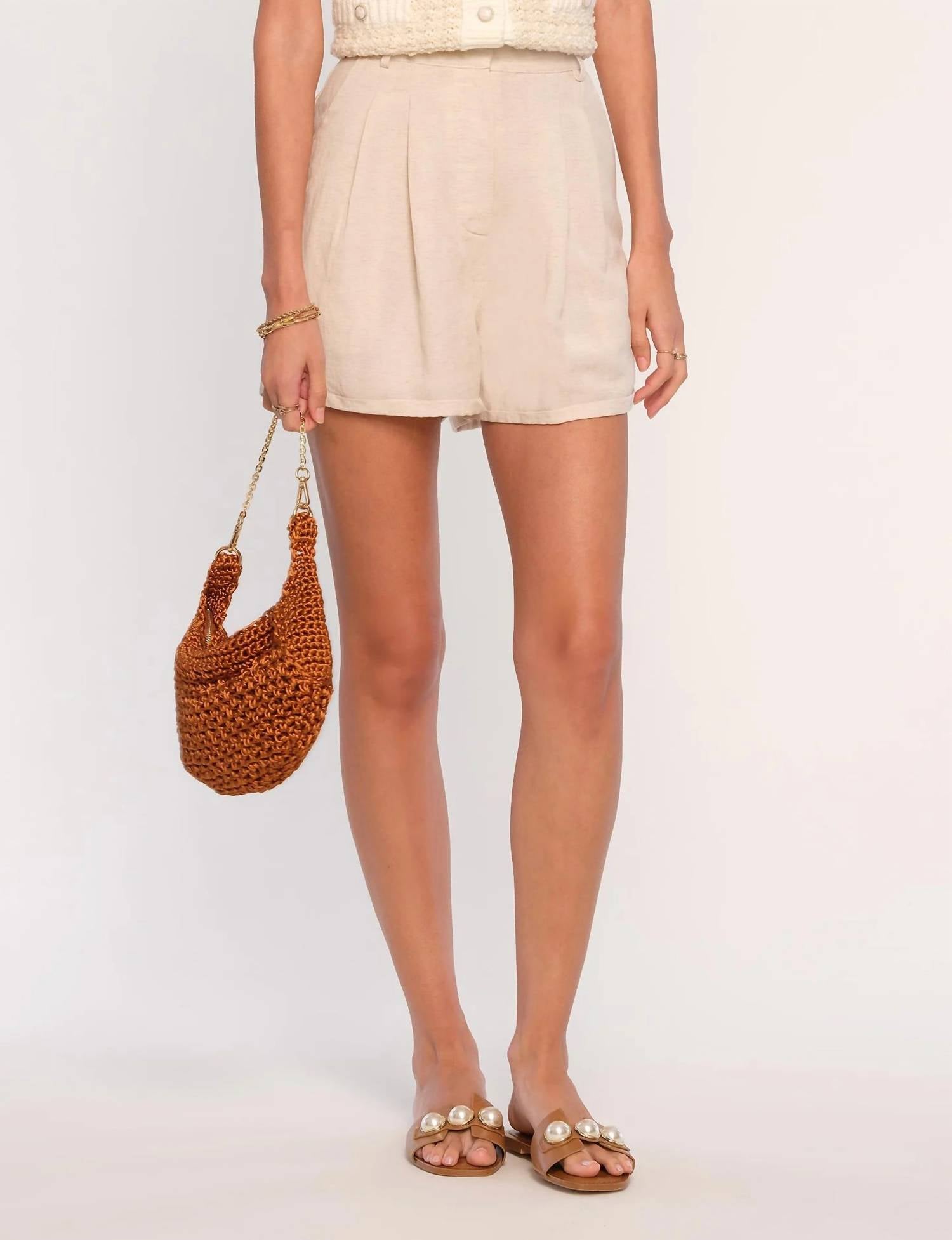 Discover the ultimate warm-weather essential with these stylish women's Bermuda shorts, skillfully crafted to provide a harmonious fusion of fashion and function. Introducing the Taye Short by Heartloom, the perfect blend of style and comfort for any occasion. Constructed from 65% Cotton 35% Rayon, these beige bermudas come with front pleats and a convenient back elastic band. Designed with functional pockets, they feature a pull-on closure that ensures easy wear. Care instructions include hand wash and line dry, making them a fuss-free addition to your wardrobe.