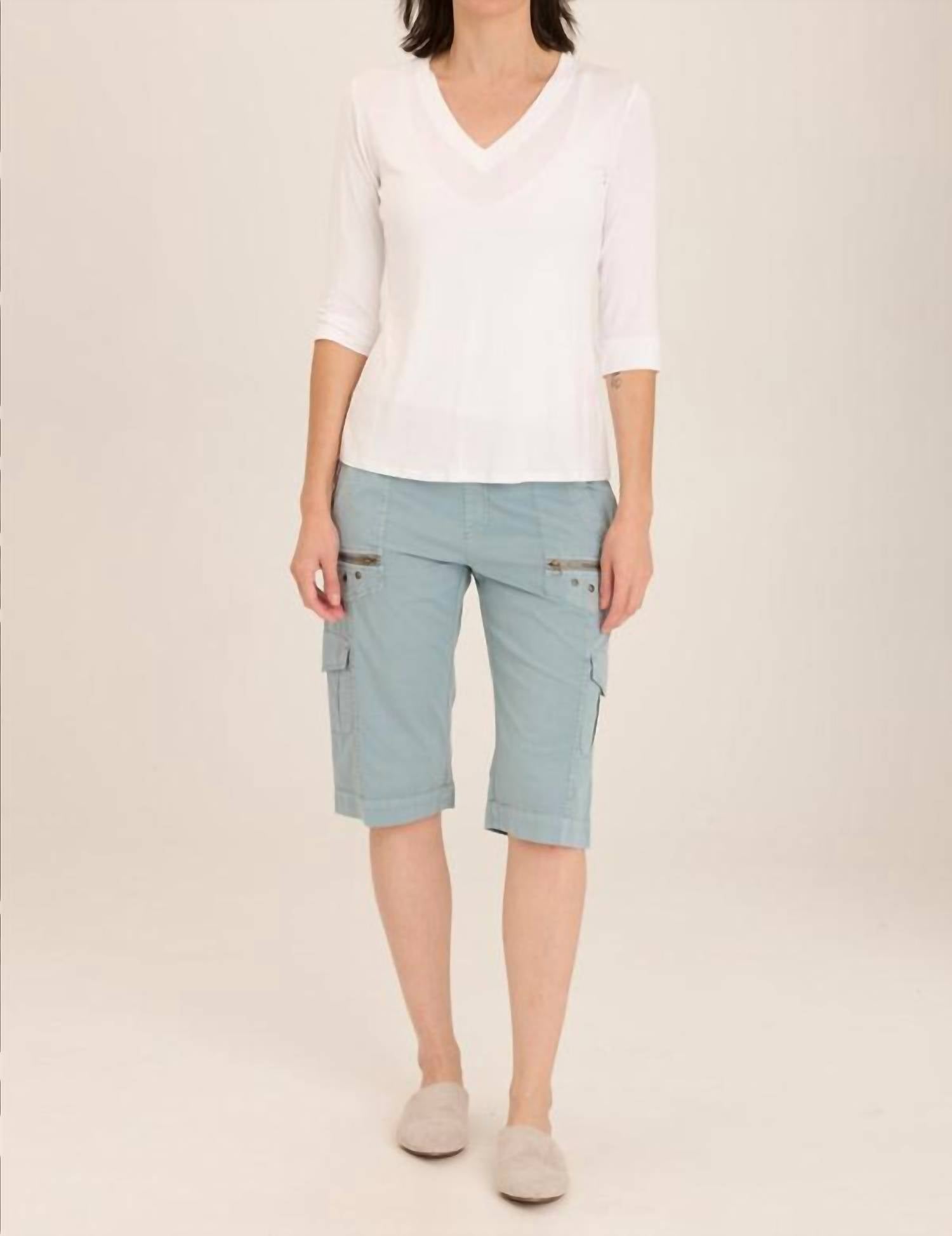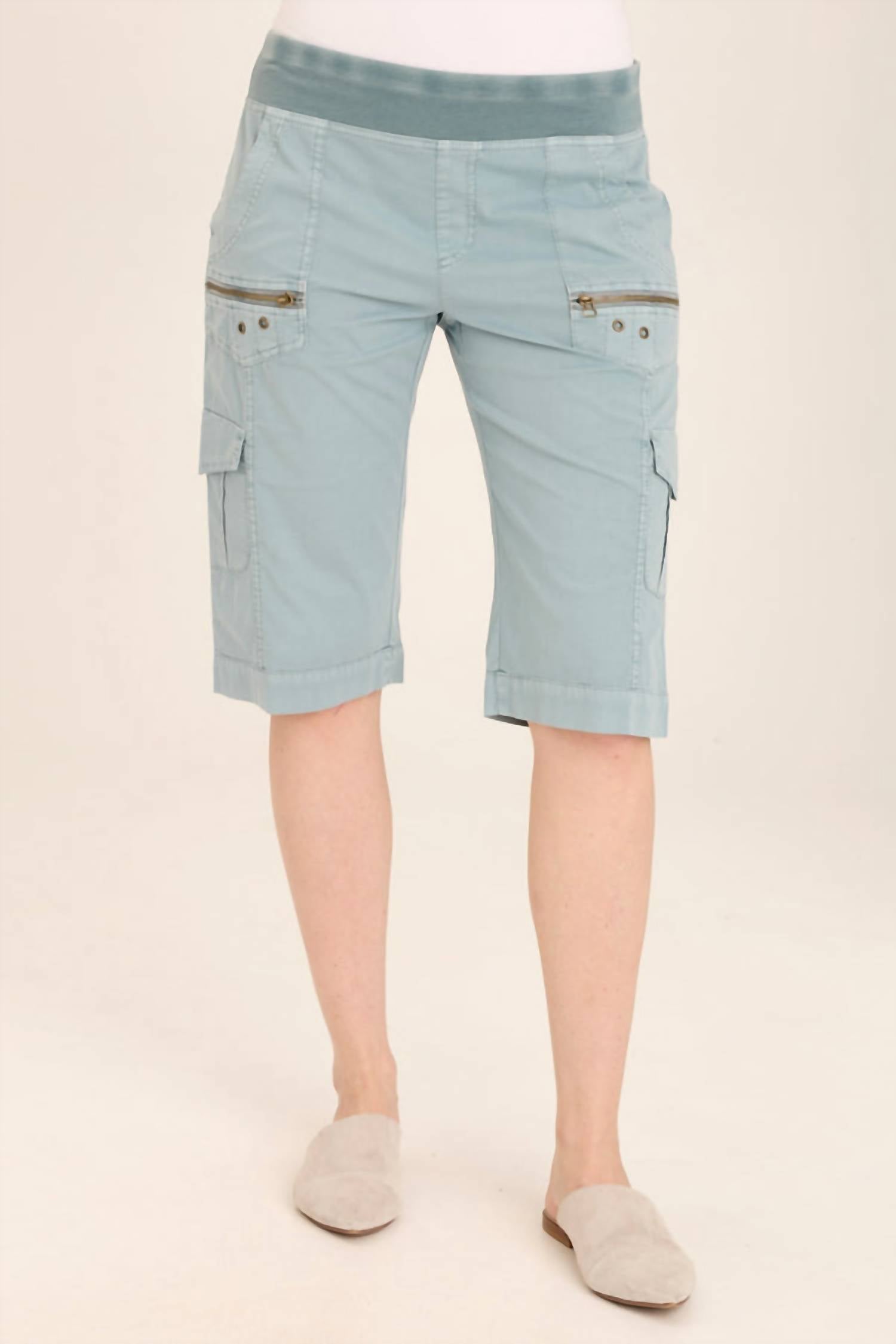 A preppy and feminine take on the classic bermuda short. Comfortable enough to lounge in and cute enough to wear out during your next warm weather outing. Introducing the Zola Bermuda Short by XCVI, a perfect addition for a minimalist summer wardrobe in a Thunderclap Pigment hue. These women's Bermudas feature a comfortable pull-on elastic waistband, and practical storage with two front pockets and two side cargo pockets. Made from a soft cotton blend, comprising 96% cotton and 4% spandex, these shorts offer both style and stretch. With an inseam of 13 inches, they're designed for ease and movement. Care for them effortlessly with machine wash instructions.