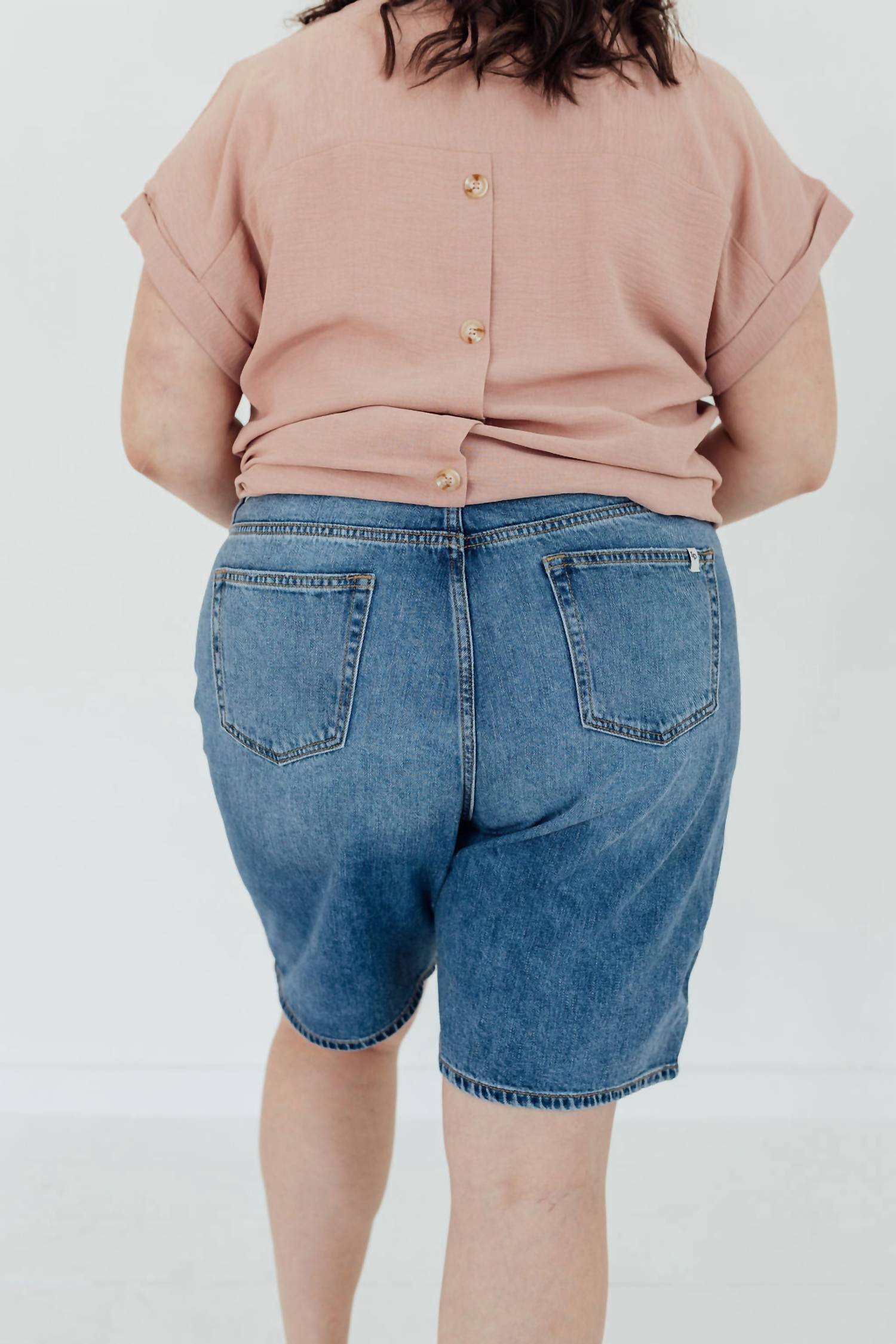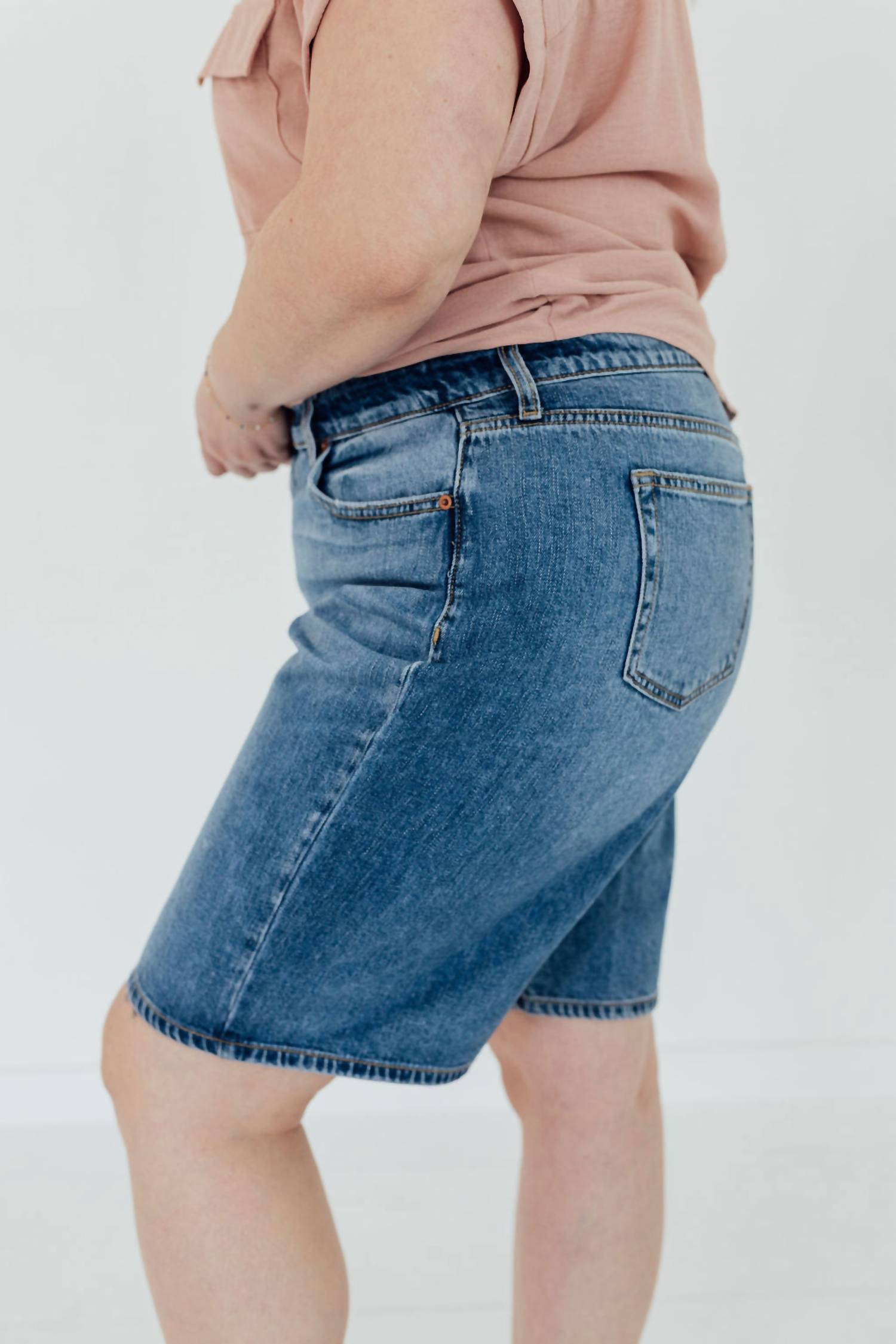Embrace the perfect blend of comfort and style with these fashionable women's Bermuda shorts, expertly designed to offer a flattering fit and versatile wear. Introducing the Carmel Bermudas by Sneak Peek, perfect for staying stylish and comfortable in any casual setting. These medium wash Bermudas feature a cotton blend composition of 78% cotton and 22% rayon, offering breathability and ease of movement. Designed with a 9.5-inch inseam and a solid pattern, these shorts include functional pockets and a zip closure, enhancing their practicality and versatility. Care for them effortlessly with machine wash cold, tumble dry low, and low iron when needed. Model is wearing a size 16 and is 5'5".