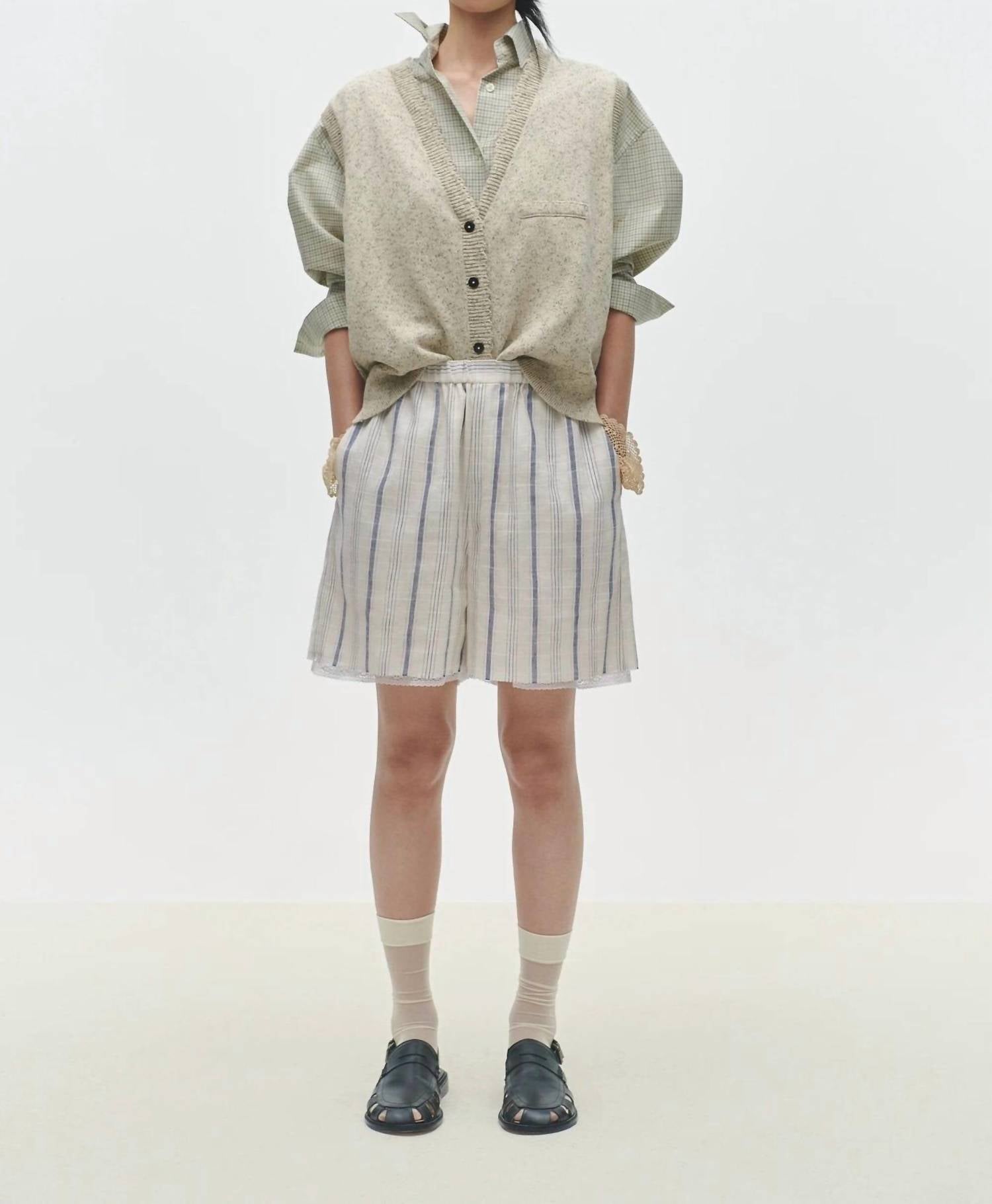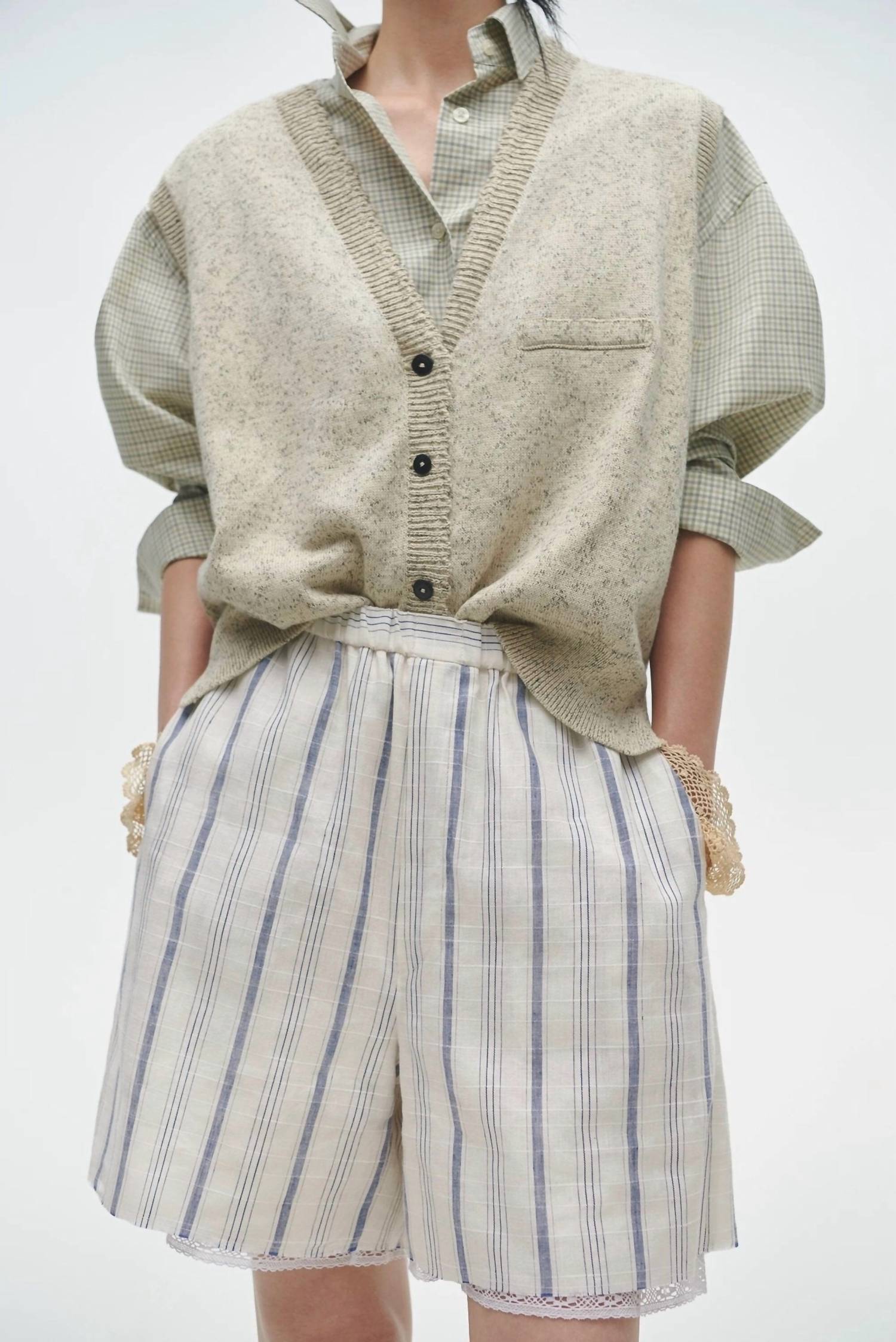Discover the ultimate warm-weather essential with these stylish women's Bermuda shorts, skillfully crafted to provide a harmonious fusion of fashion and function. Discover the Striped Bermuda With Lace by Cordera, an elegant addition to your summer wardrobe. Crafted from a 50% linen, 43% cotton, and 7% pineapple blend, these bermudas offer a comfortable regular fit with a pull-on elastic waistband. Designed with convenient side pockets and a faux fly, these shorts are made in Spain and feature an interior lining with visible lace trim. Care instructions include hand wash, do not bleach, do not tumble dry, and iron on low heat or dry clean. Model Ling stands 5'10" and wears One Size, which accommodates sizes US 2 - US 10.