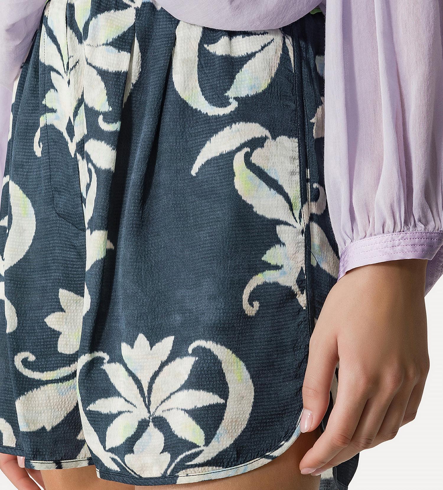 A preppy and feminine take on the classic bermuda short. Comfortable enough to lounge in and cute enough to wear out during your next warm weather outing. Delightful addition to any summer wardrobe in a vibrant Blue Multi floral pattern. Made from 100% satin viscose, these shorts are designed for a true-to-size fit and boast a luxurious Italian craftsmanship. With a convenient pull-on closure, they encapsulate the perfect Boho Chic trend for a relaxing beach day. Enjoy effortless style and comfort, all crafted without pockets for a sleek look.