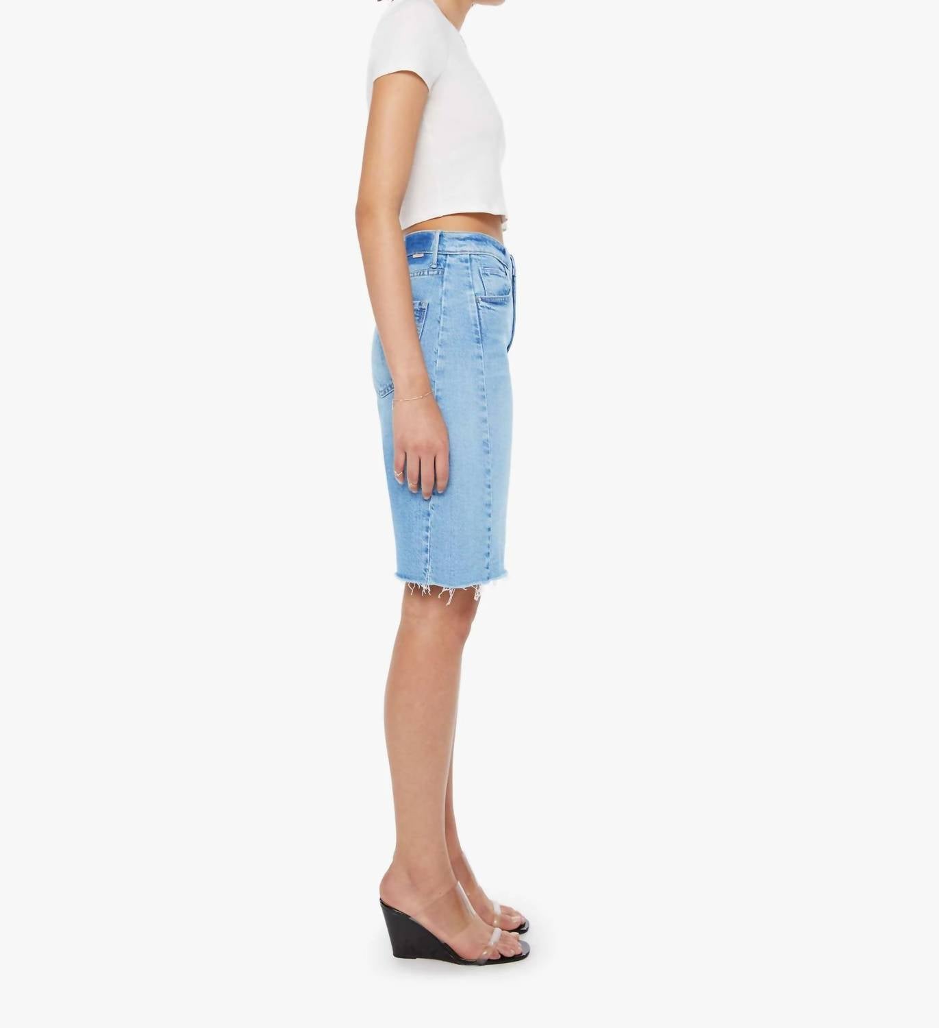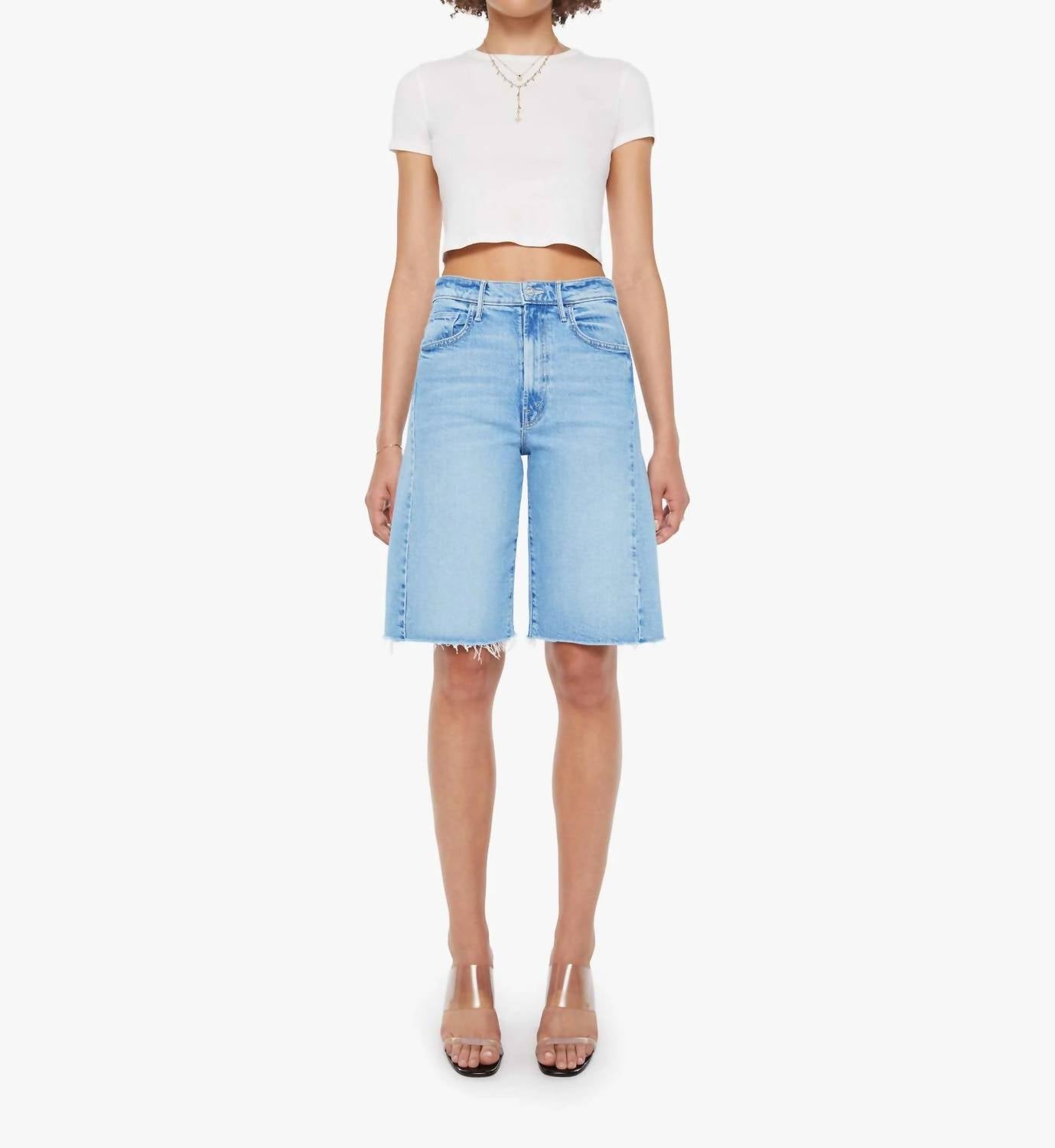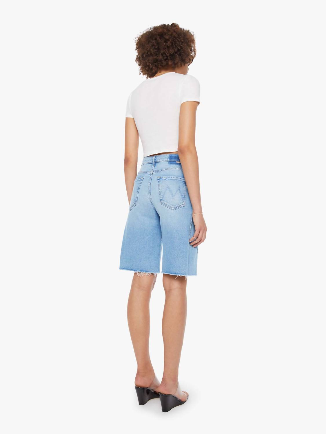 Embrace the perfect blend of comfort and style with these fashionable women's Bermuda shorts, expertly designed to offer a flattering fit and versatile wear. Elevate your summer wardrobe with The Half-Pipe Bermuda by Mother, a chic addition in light blue. These women’s Bermuda shorts feature a super high waist and knee-length inseam with a wide leg and frayed hem for an effortlessly stylish look. Made in Los Angeles from robust, semi-rigid SUPERIOR denim, these shorts will mold perfectly to your shape over time, exuding character with whiskering and fading throughout. Closure: Zip closure. Please note, patience during the break-in process is recommended.