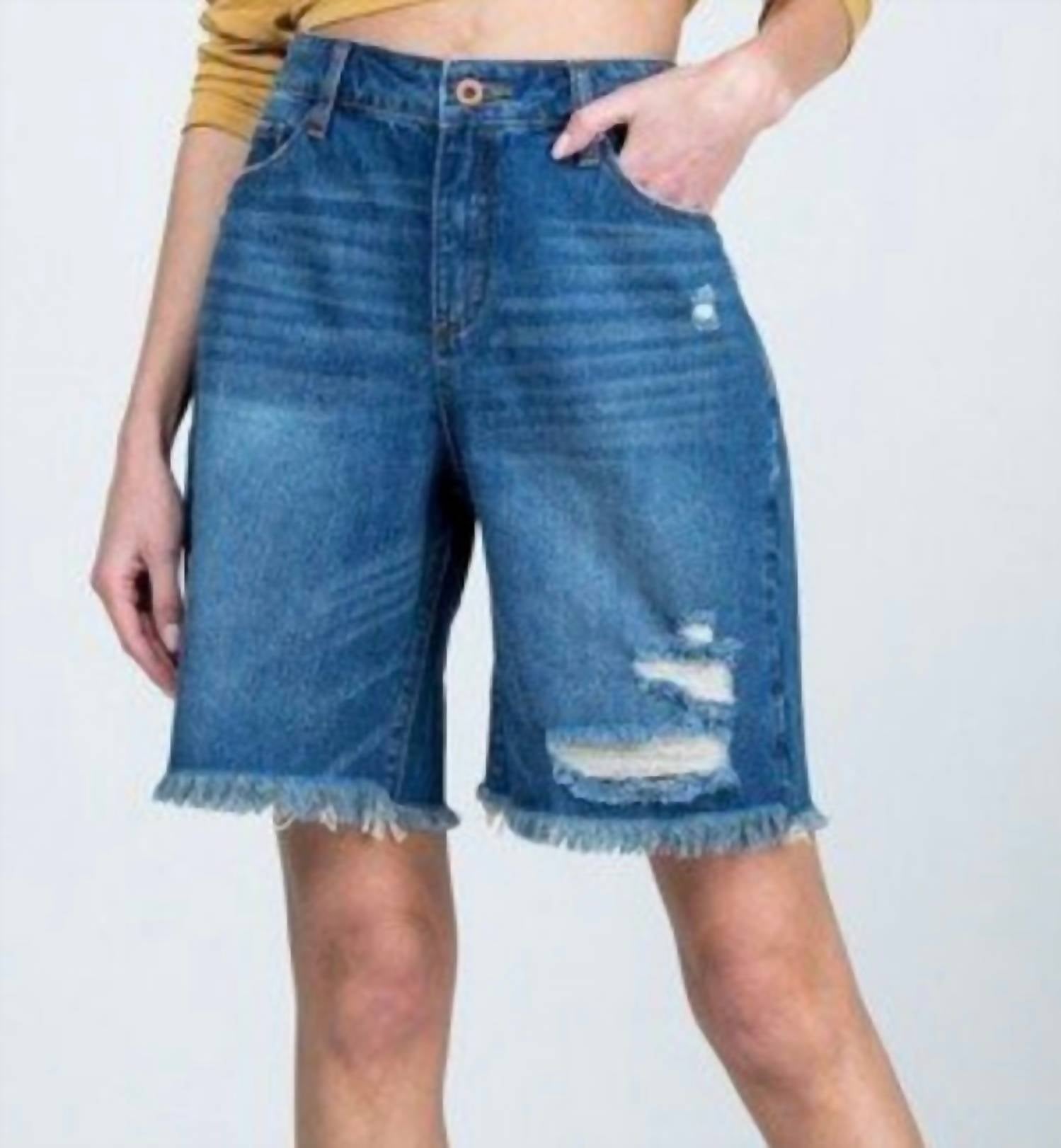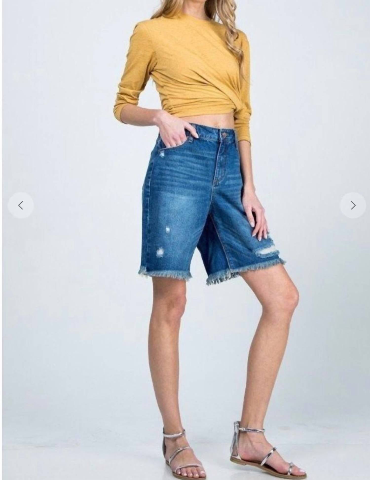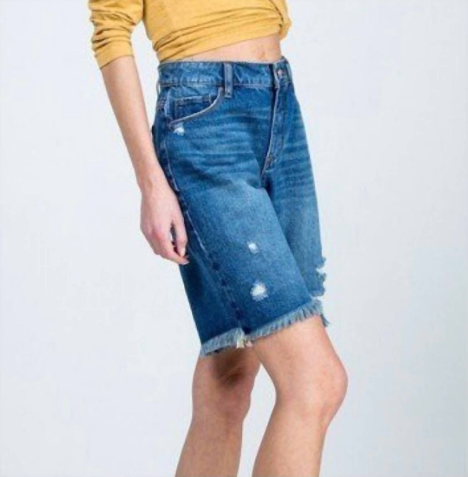 Embrace the perfect blend of comfort and style with these fashionable women's Bermuda shorts, expertly designed to offer a flattering fit and versatile wear. Introducing the Women's Terrasini Bermuda Shorts by Special A, a must-have addition in Denim Blue for your summer wardrobe. These solid-patterned shorts feature a high waisted, oversized boyfriend cut and a convenient button closure. Offering both style and functionality with pockets, they are perfect for streetwear looks. Ideal for back to school or celebrating the 4th of July, these shorts combine comfort with a trendy appeal.
