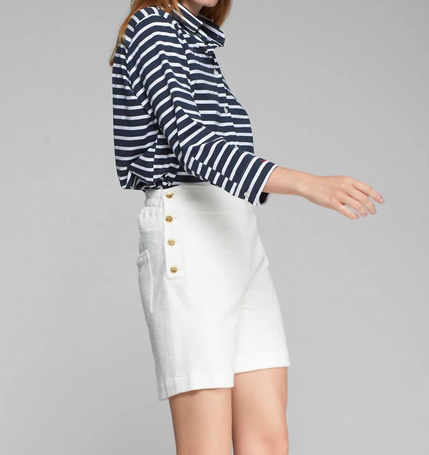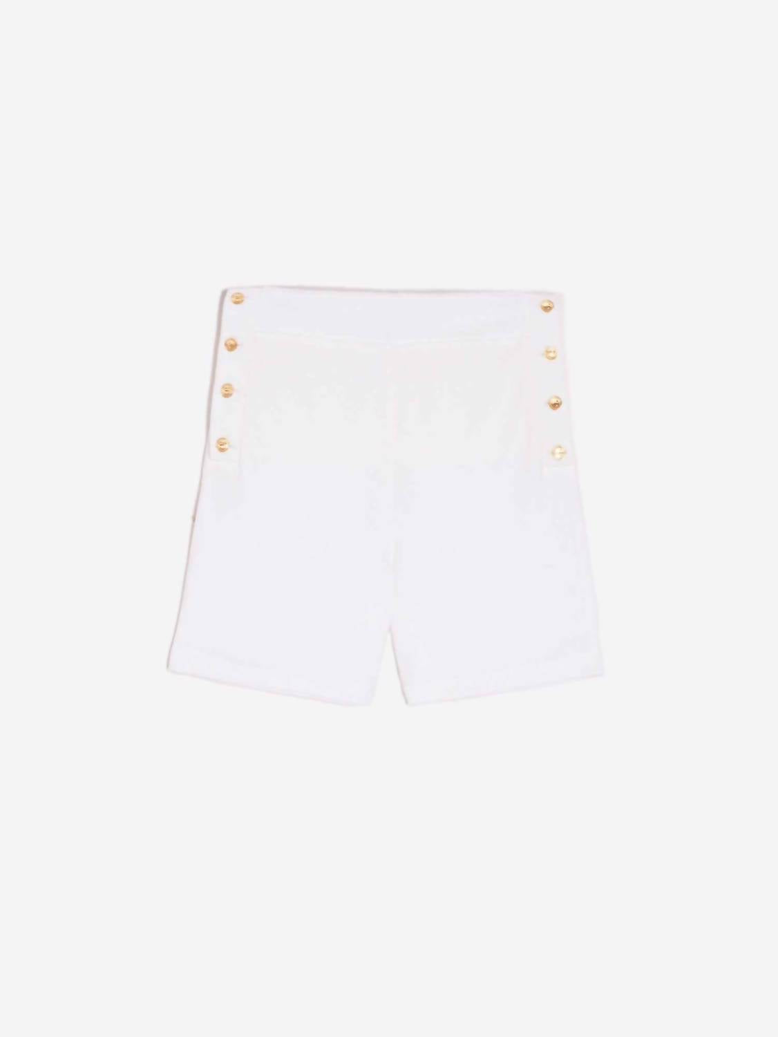 Discover the ultimate warm-weather essential with these stylish women's Bermuda shorts, skillfully crafted to provide a harmonious fusion of fashion and function. Experience the perfect fusion of style and comfort with the Tia Bermuda Shorts by Vilagallo, ideal for a minimalist summer look. These women's shorts in white boast a solid pattern, made from 100% cotton stretch fabric for ease and flexibility. Designed with a pull-on closure, they feature elegant gold buttons on the sides and include pockets for practicality. These shorts are perfect for a chic dinner party occasion.