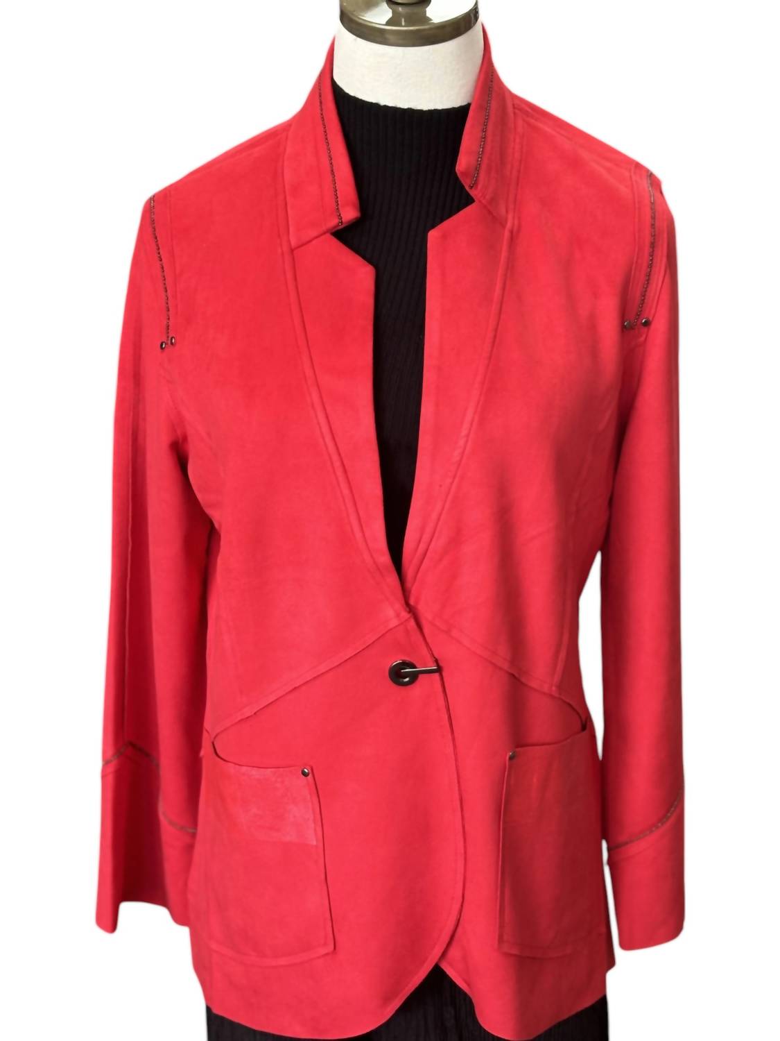 Unique metal chain detail. Functional front pockets. Button closure. Suede material.