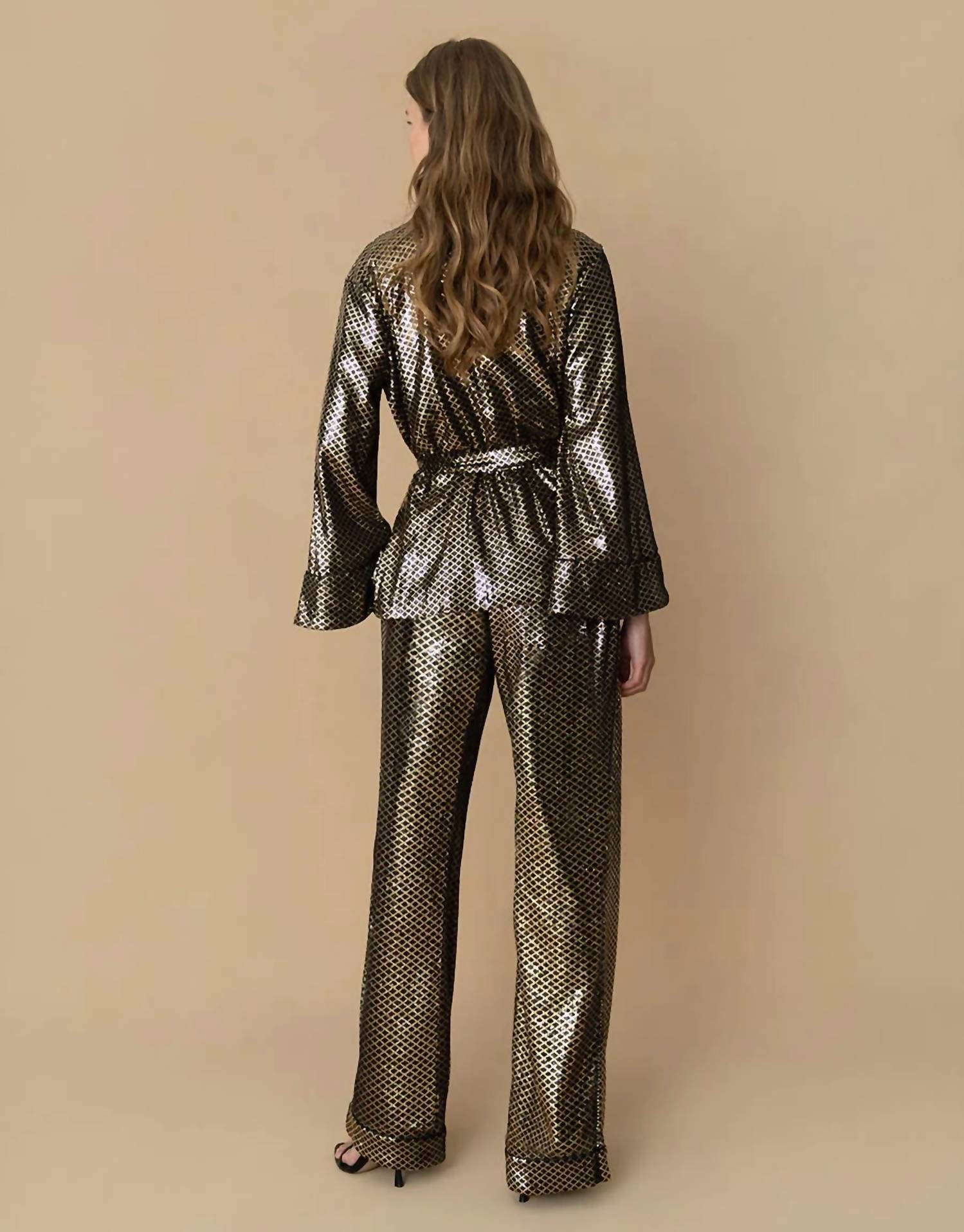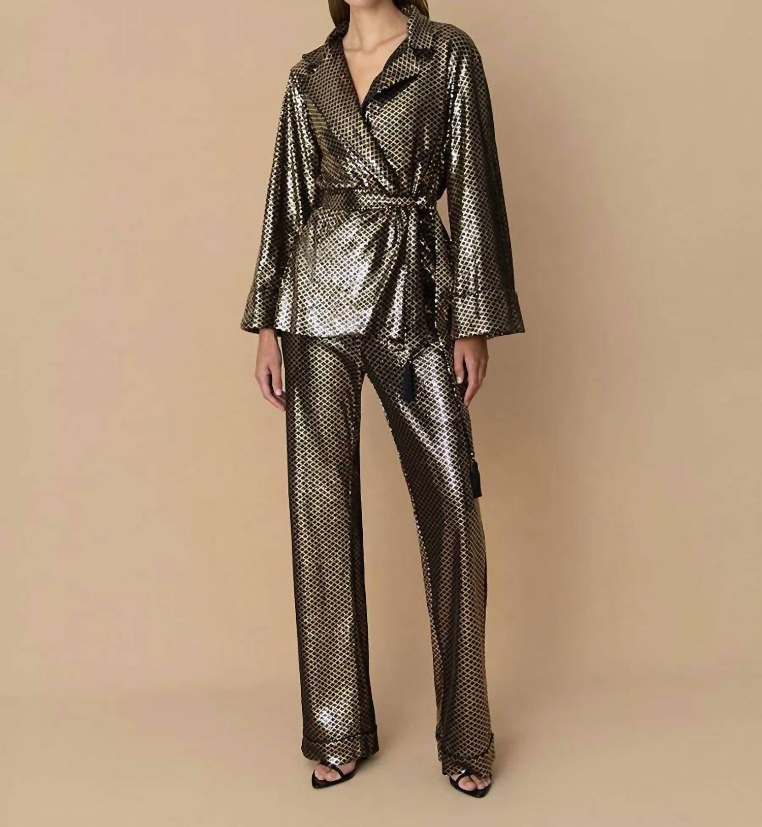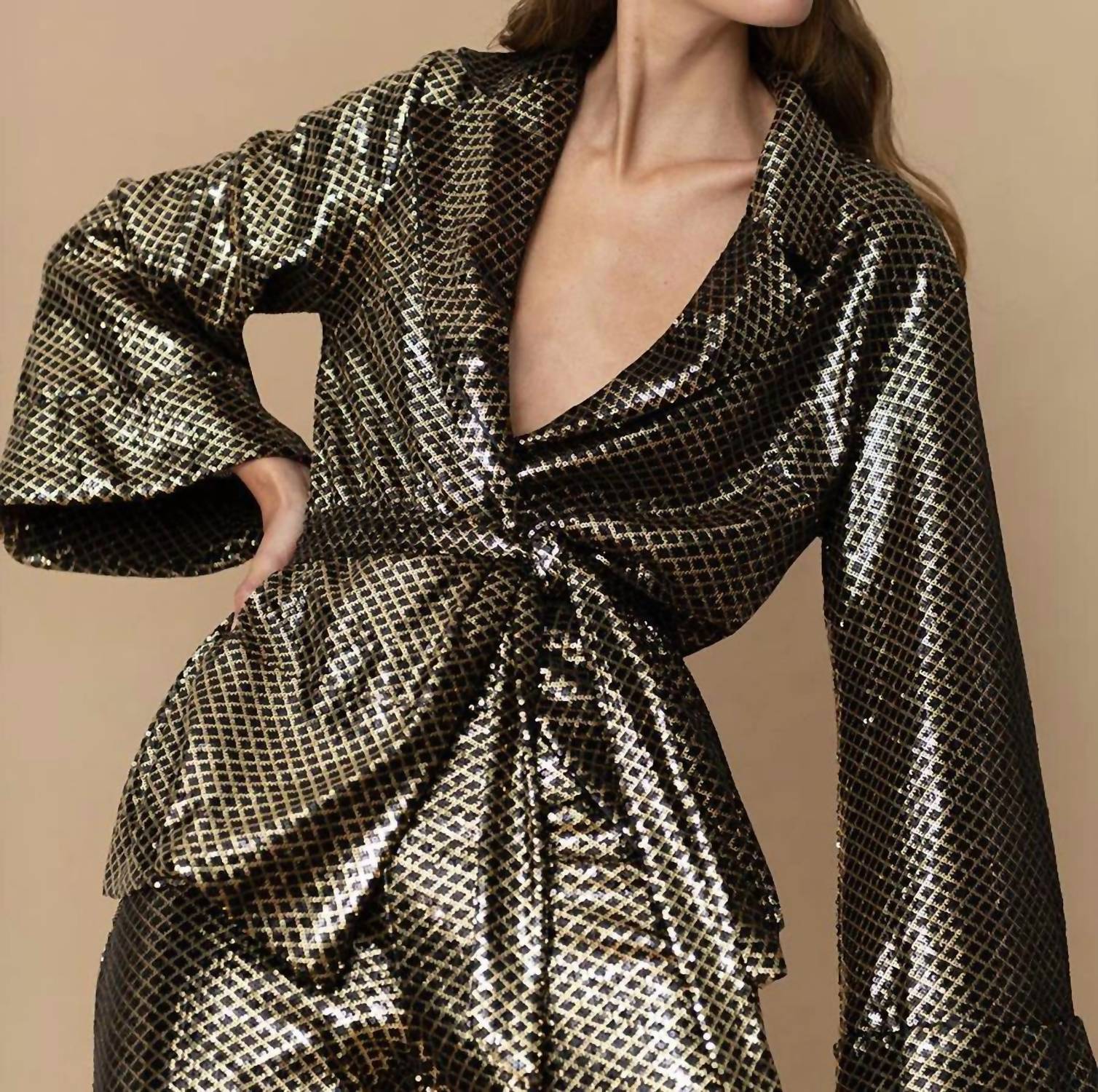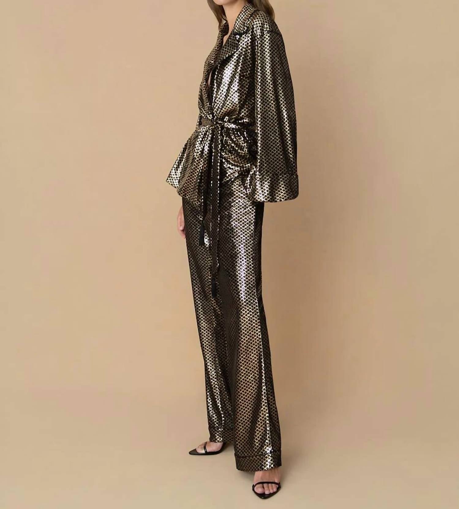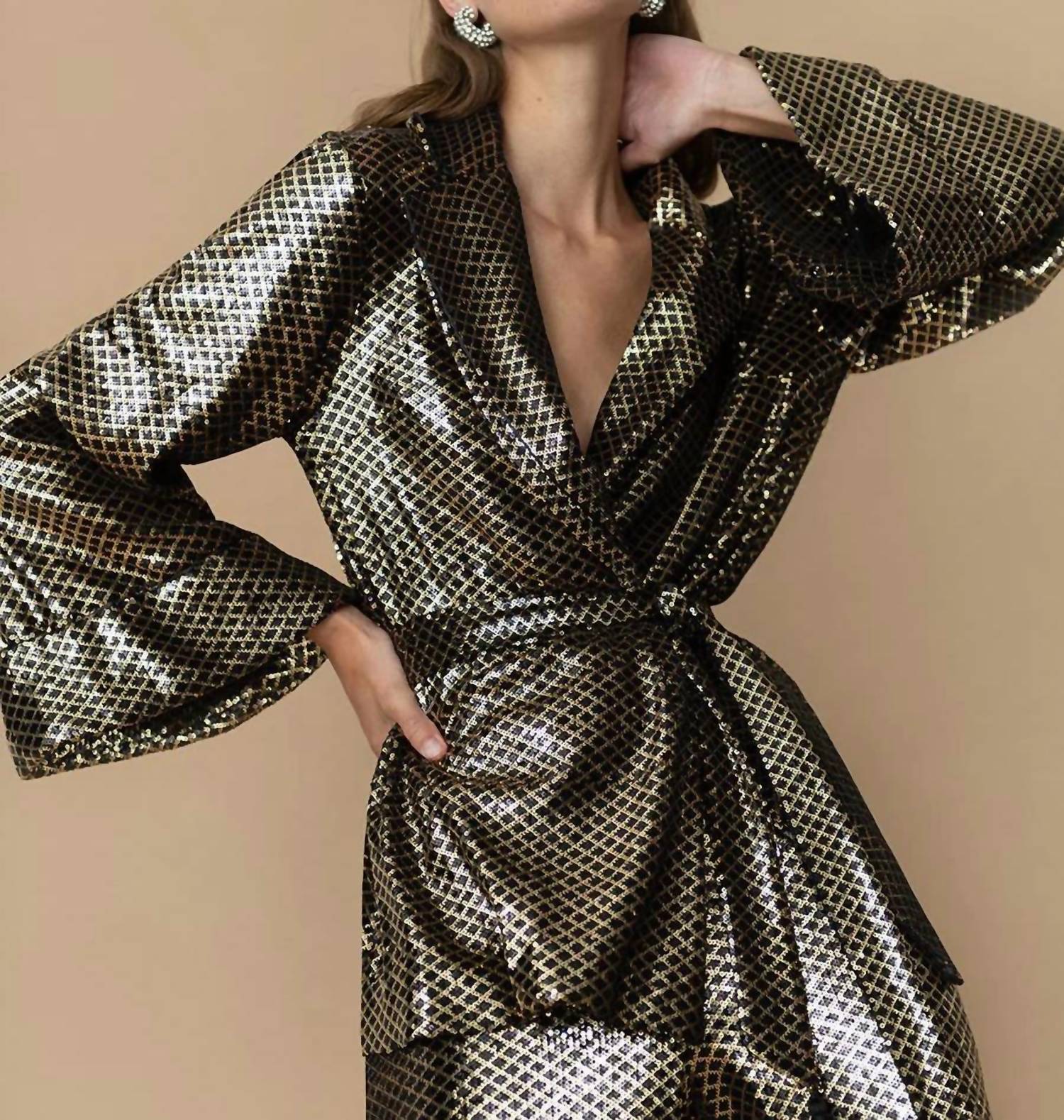 A sequin statement piece, the Una jacket promises to shimmer in even the lowest light. The easy kimono belt adds a refreshing informality to the classic evening jacket and cinches the waist for a flattering fit. Our Una works wonderfully well with both denim and separates, but we love seeing it paired with the matching Havana trouser for a true head-turning impact.  Loose fitting jacket. Self tie belt. 100% VISCOSE / LINING: 100% RECYCLED POLYESTER. Sequin detail. Model is 5'11 and wears a UK size 8.