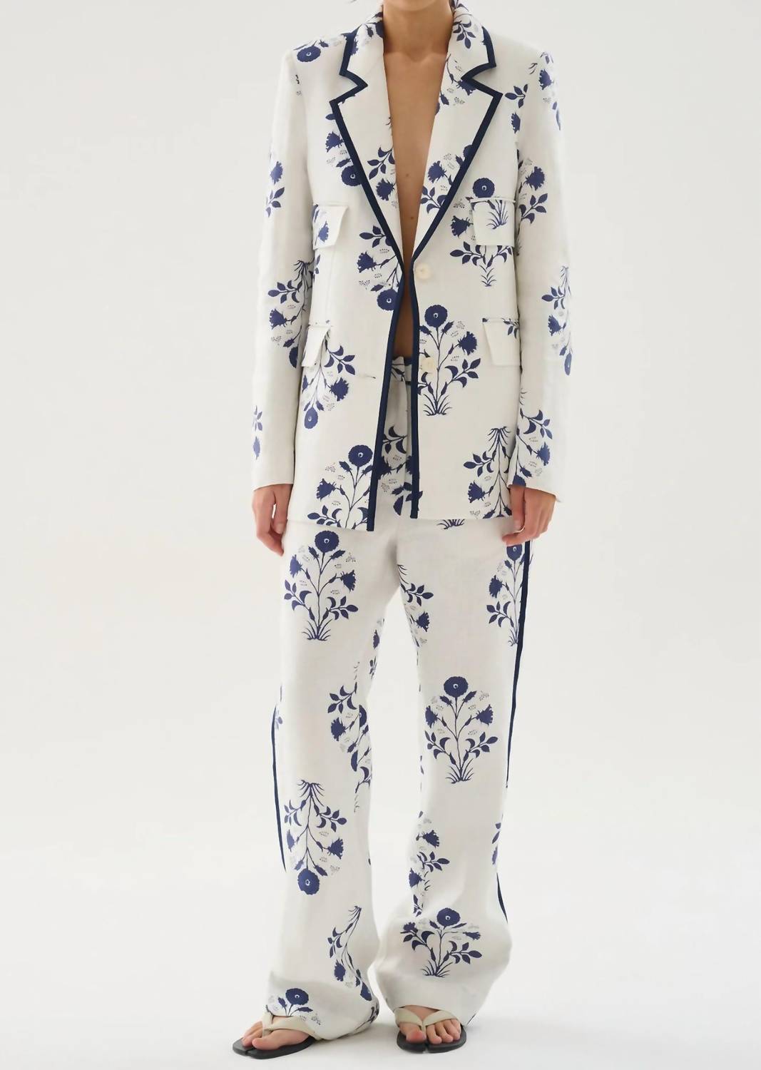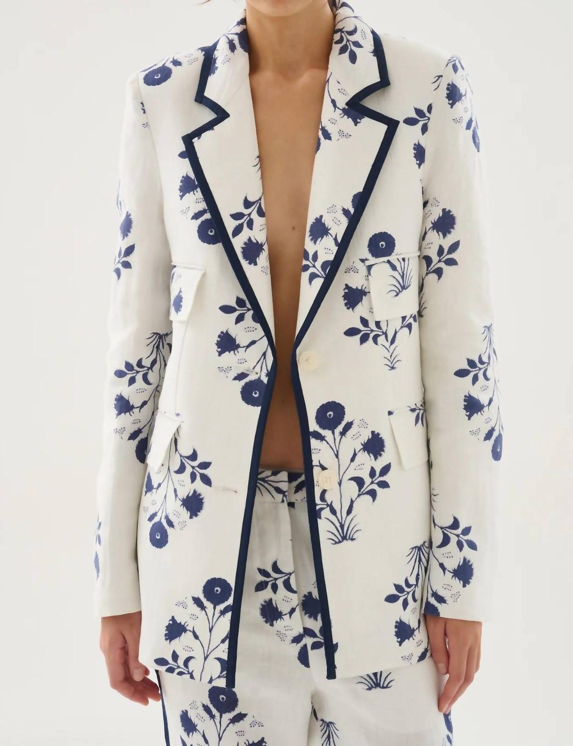 Tailored to perfection, this blazer will be your go-to jacket for years to come. Elevate your wardrobe with the Bolson Sawyer Blazer by Maria Cher, an exquisite choice for the Spring season. Featuring a long sleeve design, this blazer is crafted from 100% washed linen and showcases a striking floral pattern in deep blue hues. Its elongated silhouette and sharp lapels with contrast piping make it a perfect addition for a holiday party or any sophisticated occasion. Closure: Button closure. Care: Dry clean only.