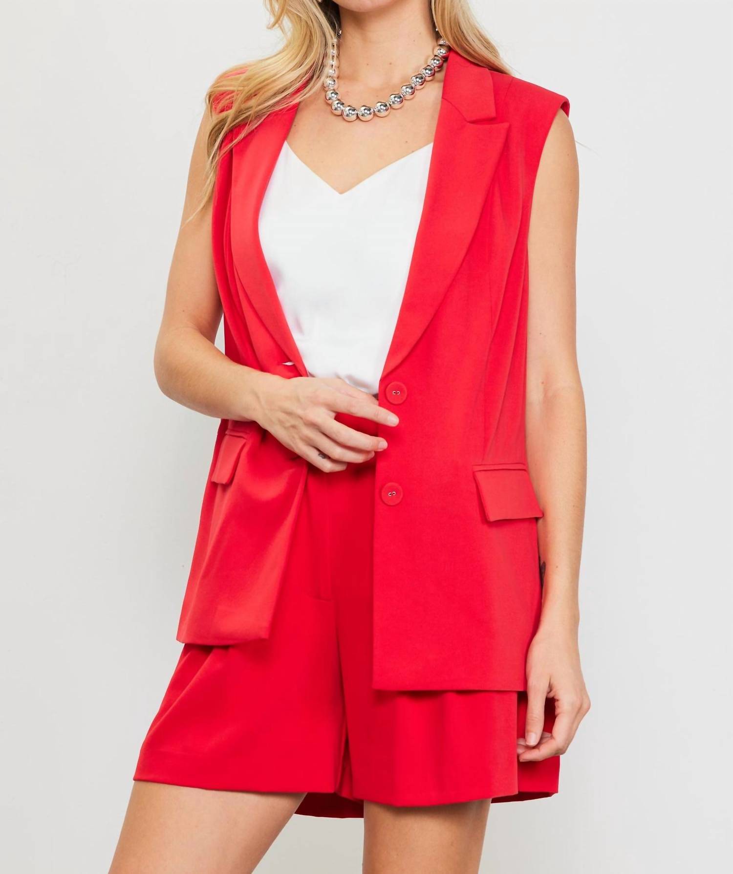 An elevated version of your favorite classic blazer. Introducing the Sleeveless Tailored Blazer by SKIES ARE BLUE, a chic addition to any wardrobe in vibrant red. This blazer features a classic collar, solid pattern, and practical pockets, crafted from high-quality polyester. Closure: Button closure. Perfect for professional settings or casual outings, this piece offers a modern twist to a classic design.