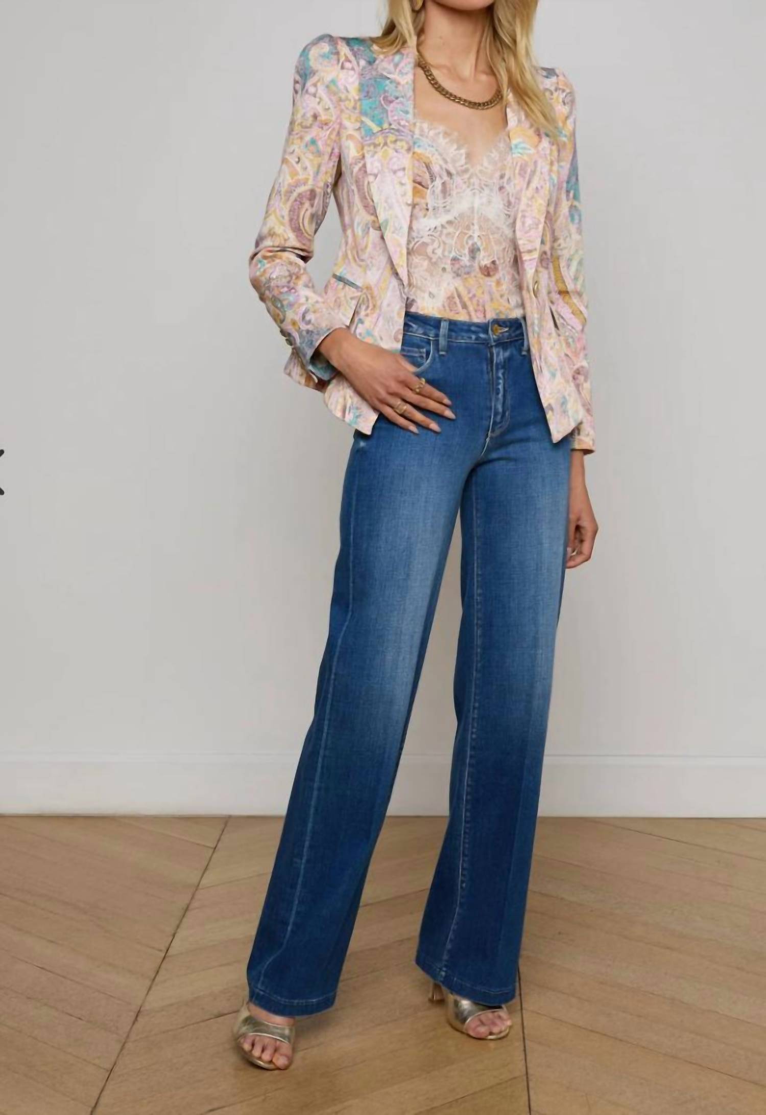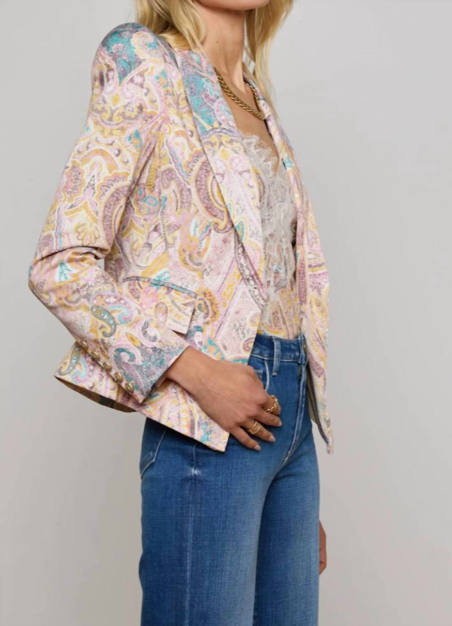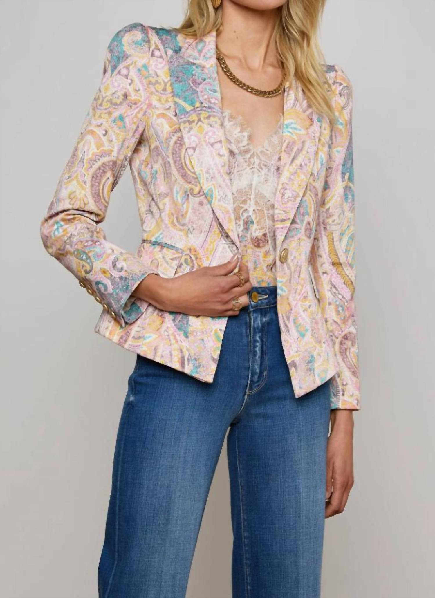 Tailored to perfection, this blazer will be your go-to jacket for years to come. Elevate your dinner party look with the L'Agence Kaisley Blazer, featuring long sleeves and a striking Western Paisley print. Crafted from printed cotton twill, this piece is designed with a flattering single-breasted button closure, complete with shoulder pads for a bold statement. Measuring at a chic 25.75 inches in length, it is thoughtfully lined and includes pockets for practicality. Perfect for spring occasions, this vintage-inspired blazer requires dry cleaning to maintain its pristine condition.