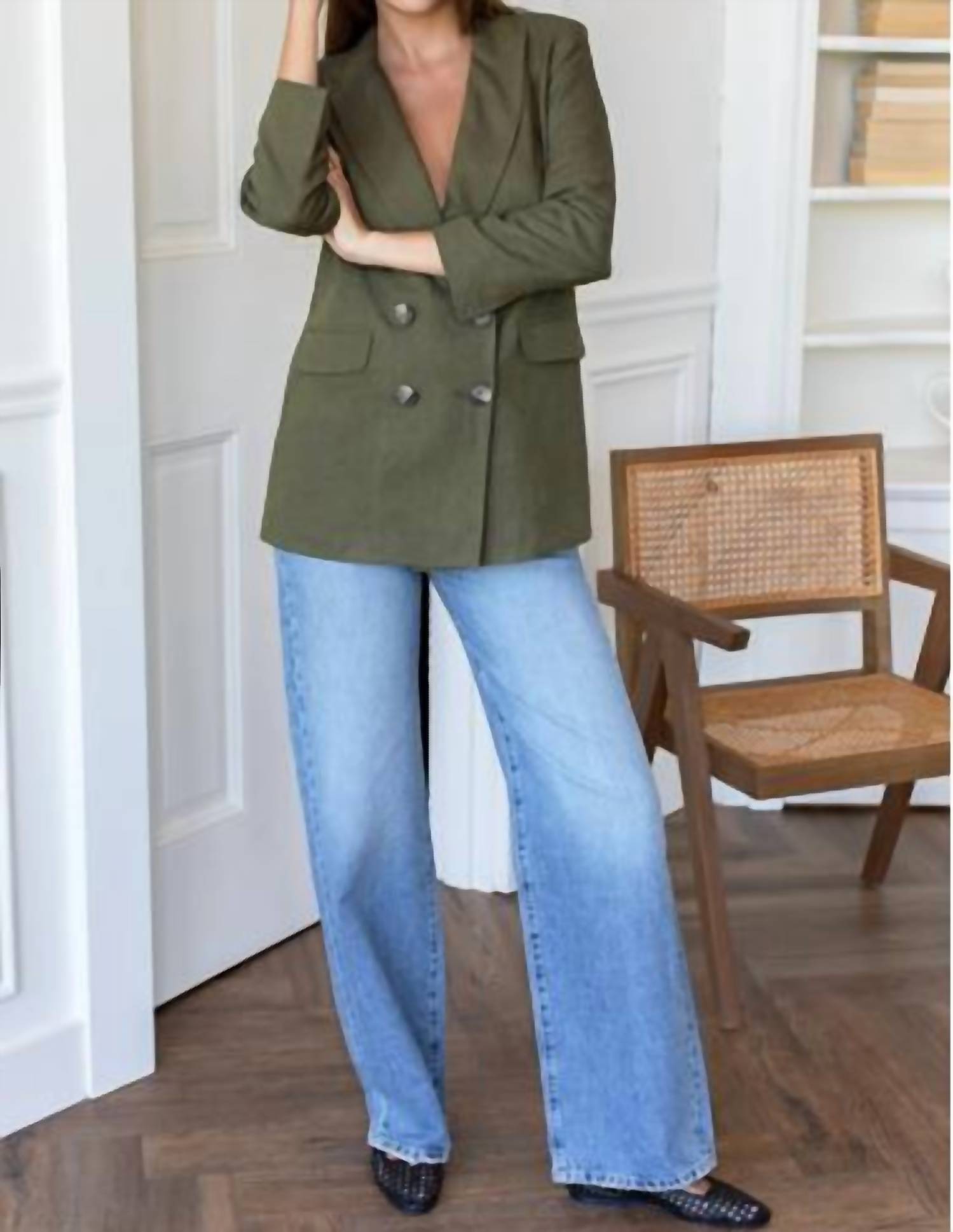An elevated version of your favorite classic blazer. Introducing the Lee Double Breasted Jacket by EMERSON FRY in Martini Olive, a perfect blend of elegance and sophistication. This women's blazer features long sleeves, crafted from a luxurious Linen Viscose blend for a timeless appeal. Designed with a tailored bracelet length sleeve, it includes a notched lapel, front flap pockets, and a lightly padded shoulder for added structure. Closure: Button closure. Made in NYC and recommended for dry cleaning. Available in sizes 2, 4, 6, 8, and 10. Ideal for a dinner party and capturing the quiet luxury trend.