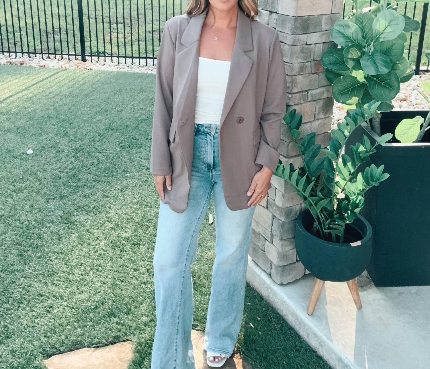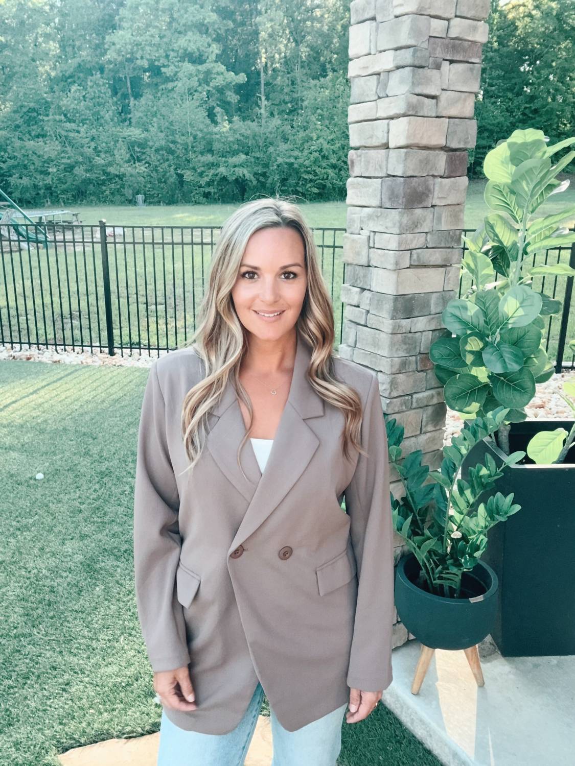 An elevated version of your favorite classic blazer. Introducing the Mocha Athluxury Blazer by Mono B, a stylish statement piece designed for a modern wardrobe. This women's blazer features long sleeves and is crafted from a 4-way stretch scuba fabric with jacquard stripes, offering both comfort and flexibility. The double-breasted button closure complements its oversized fit, and the light shoulder padding enhances comfort while the hand pockets add practicality. Care for this piece by dry cleaning and line drying for best results.
