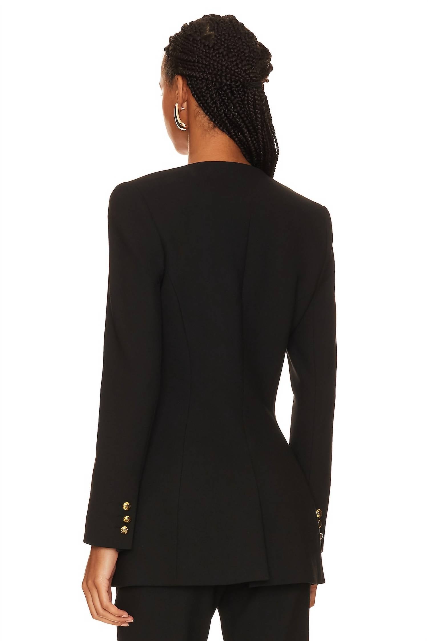 An elevated version of your favorite classic blazer. The Collarless Double-breasted Blazer by Smythe is a sophisticated piece perfect for the modern woman's wardrobe. Featuring long sleeves and crafted from a blend of 69% Polyester, 28% Viscose, and 3% Elastane, it boasts a longline silhouette with waist-shaping darts accentuated by brass hardware. This blazer is made in Canada with a button closure and is lined with 100% Cupro Rayon that is ecotoxicity-free and biodegradable. Care: Dry clean only to maintain its elegant shape and structure.