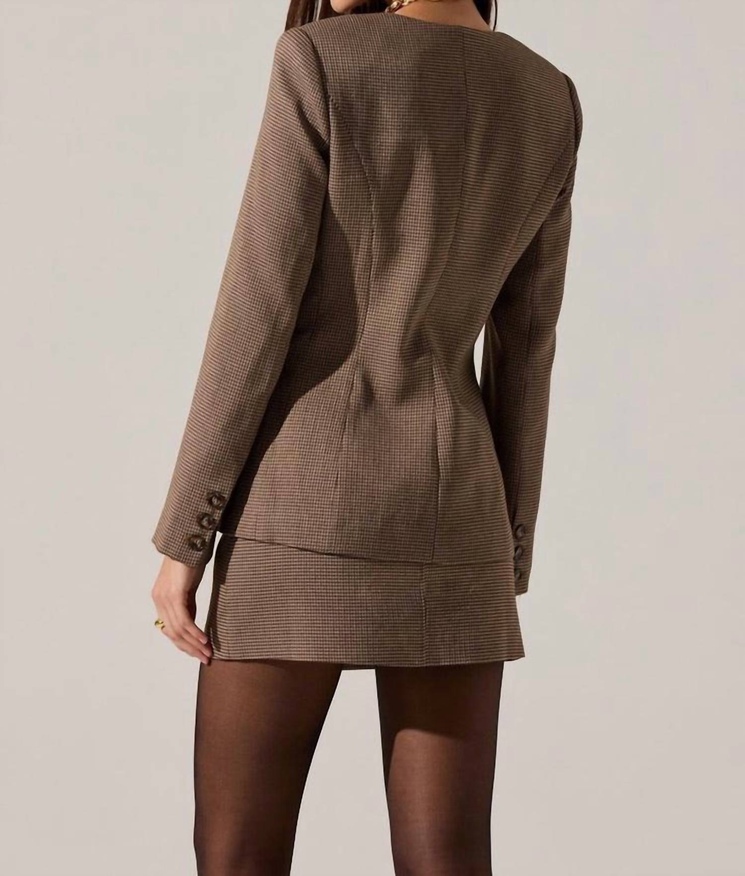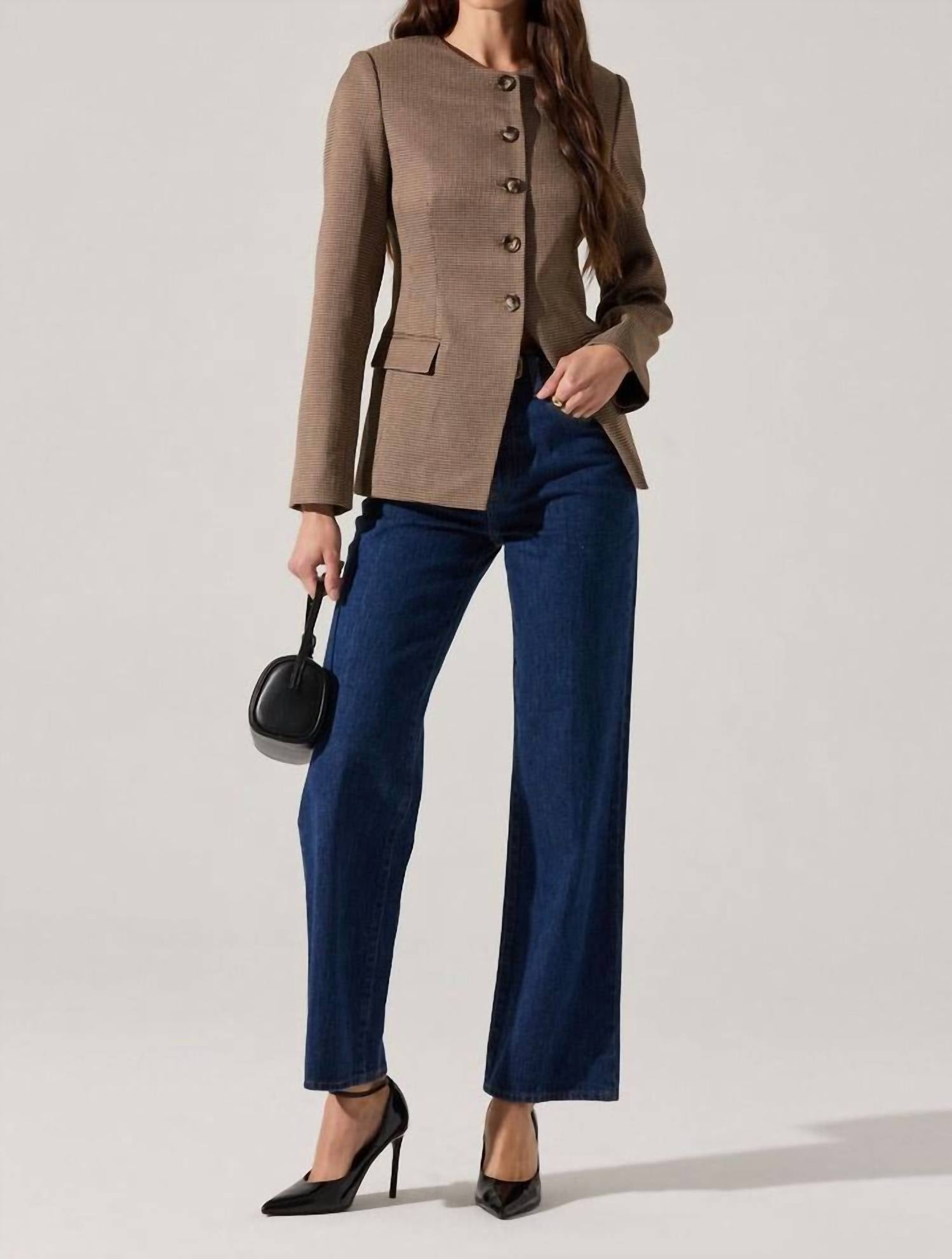 A blazer so versatile you can wear it to the office or pair it with jeans for a more casual look. The ASTR Bellmere Tailored Collarless Jacket in Brown Houndstooth is a minimalist masterpiece that will elevate your refined business casual wardrobe. This long-sleeve blazer features functional front pockets and shoulder padding for added structure, with a button front closure and button sleeve cuffs enhancing its sleek silhouette. Composition: Self: 85% Polyester, 15% Rayon, 2% Elastane; Lining: 100% Polyester. Care instructions specify dry clean only, making it the perfect polished piece for holiday parties and Thanksgiving.