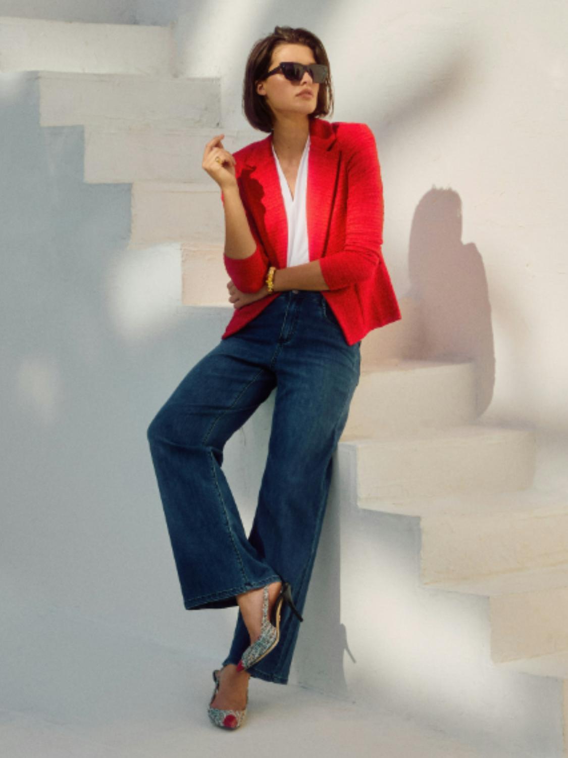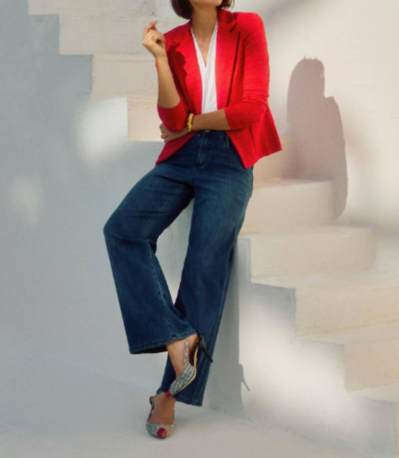 An elevated version of your favorite classic blazer. Introducing the Joseph Ribkoff Boucle Fitted Blazer, a sophisticated choice in radiant red for any evening event. This chic blazer features a long sleeve design with classic notched lapel and a single button closure, offering a tailored silhouette. Crafted from a quality cotton blend with a composition of 50% polyester, 37% viscose rayon, 12% cotton, and 1% spandex, its beautifully textured bouclé fabric adds a touch of quiet luxury. Made in Canada, care instructions include hand washing the garment inside out in cold water, drying flat, and avoiding ironing or dry cleaning.