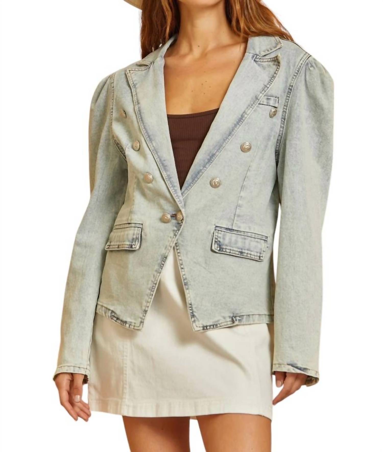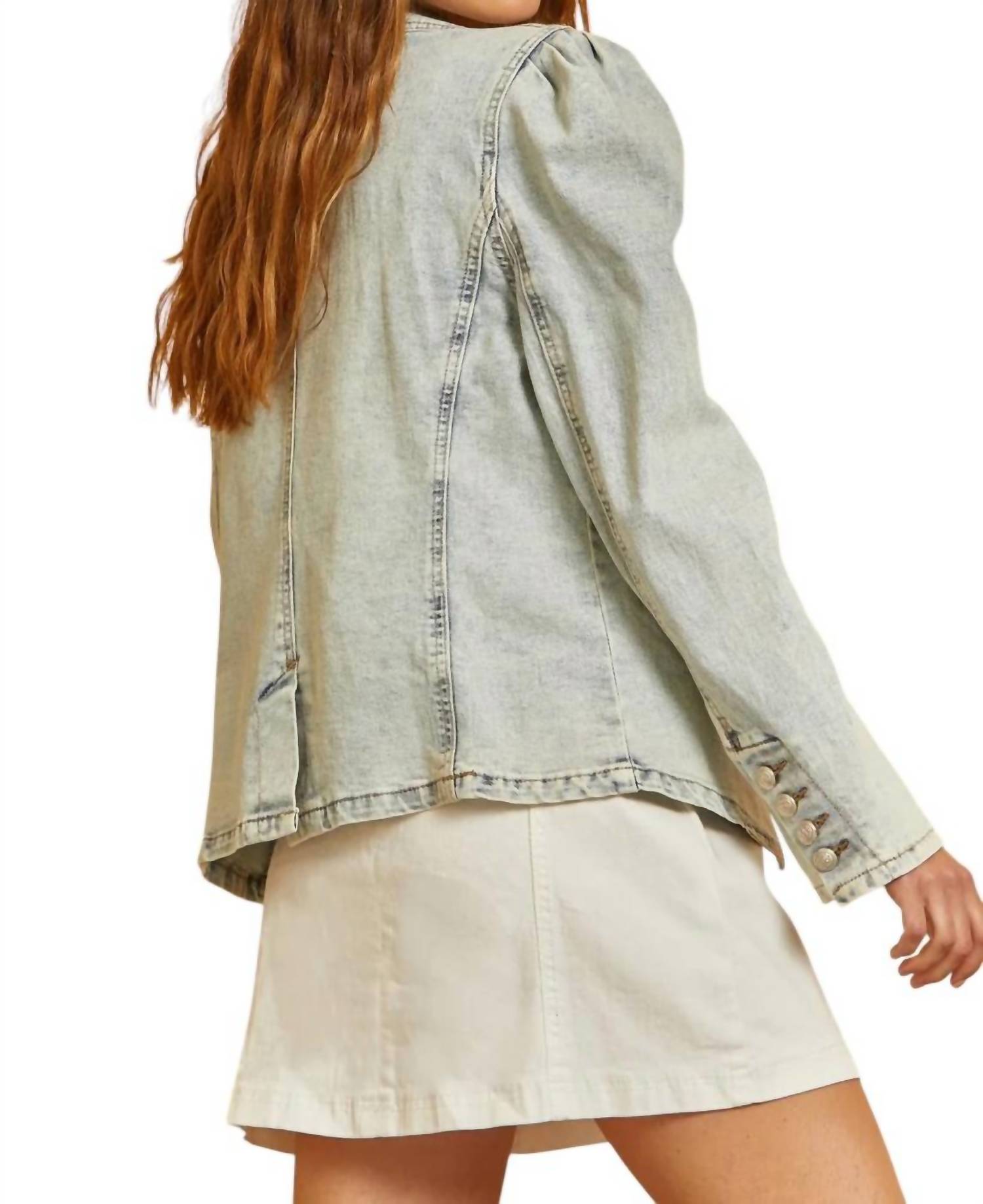 This denim jacket combines a classy blouse look with puff sleeves and button details. It features long sleeves and a collared design, made from 100% cotton.