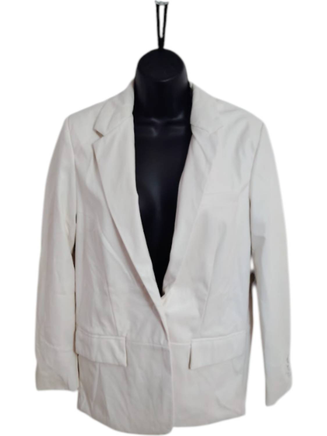 An elevated version of your favorite classic blazer. Stylish and versatile piece crafted for both casual and formal occasions. Features long sleeves and a structured design in textured white leather. Designed with a single-breasted style and a two-button closure. Includes functional pockets and a classic collar. Care instructions suggest hand washing to maintain its quality, ideal for fall workwear and black-tie events.