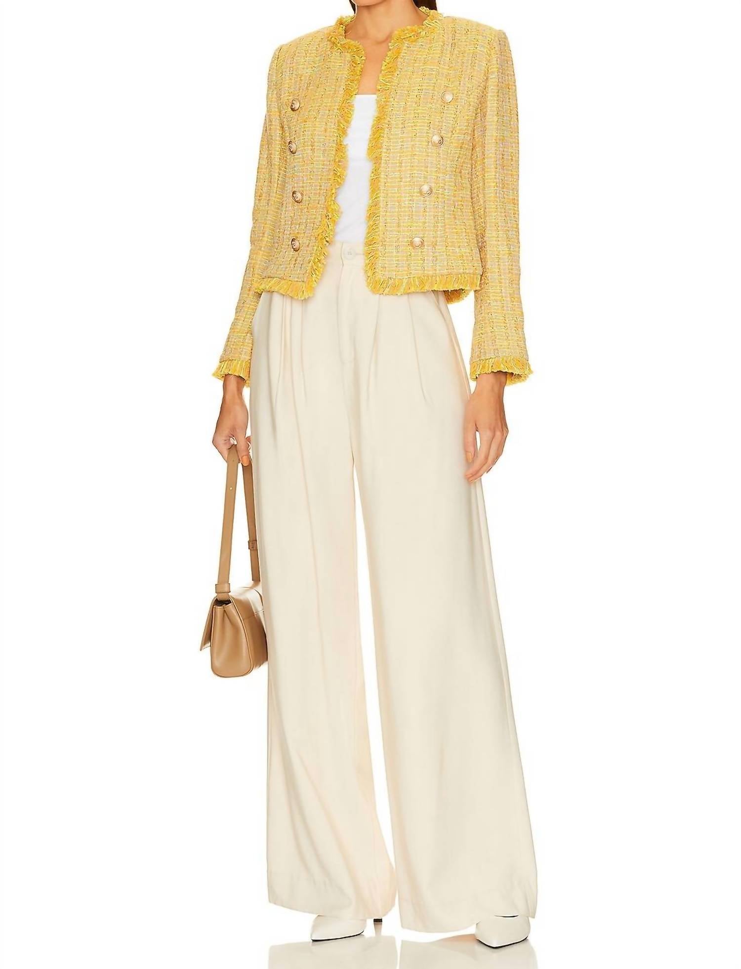 An elevated version of your favorite classic blazer. Step into the new season with the Tinlee Tweed Blazer by L'Agence, a chic addition to any fall workwear wardrobe. This long sleeve piece is crafted from a premium cotton blend, featuring a self composition of 59% cotton, 29% polyester, and 12% acrylic, with a 100% polyester lining. The blazer is imported and offers a sophisticated touch with its open front and padded shoulders. Designed with a midweight tweed fabric, it requires dry clean only care to maintain its pristine quality.