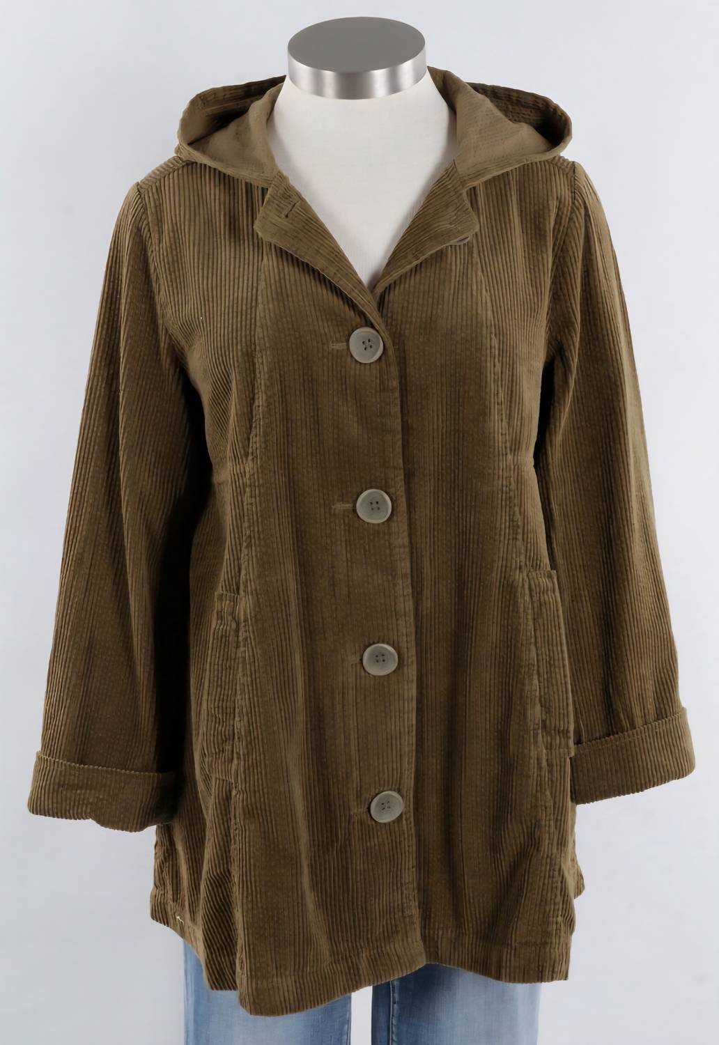 Tailored to perfection, this blazer will be your go-to jacket for years to come. Made from tumbled large wale corduroy this jacket is a Fall essential! The Cozy Tunic Jacket has a button closure with hood, full length sleeves and optional turned cuff, and two front welt pockets. The a-line swing hemline falls below the hip and the generous cut provides plenty of room for layering. Machine wash cold, tumble dry low small measures 42" bust, 31" length large measures 48" bust, 32"