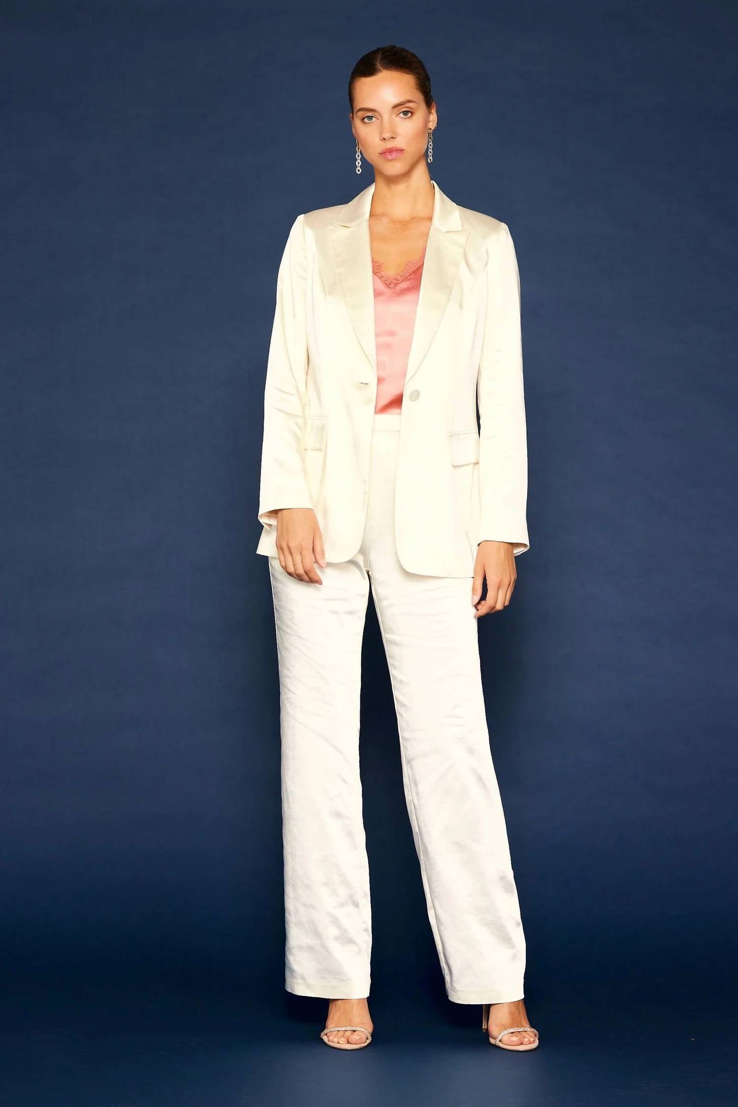 An elevated version of your favorite classic blazer. Elevate your wardrobe with the Reese Satin Blazer by SKIES ARE BLUE, designed for both summer and winter in a captivating cream hue. This satin blazer features long sleeves, a boyfriend style longer fit, and a practical button closure. Originating from solid design principles, this lined blazer includes pockets and should be dry cleaned for best care.