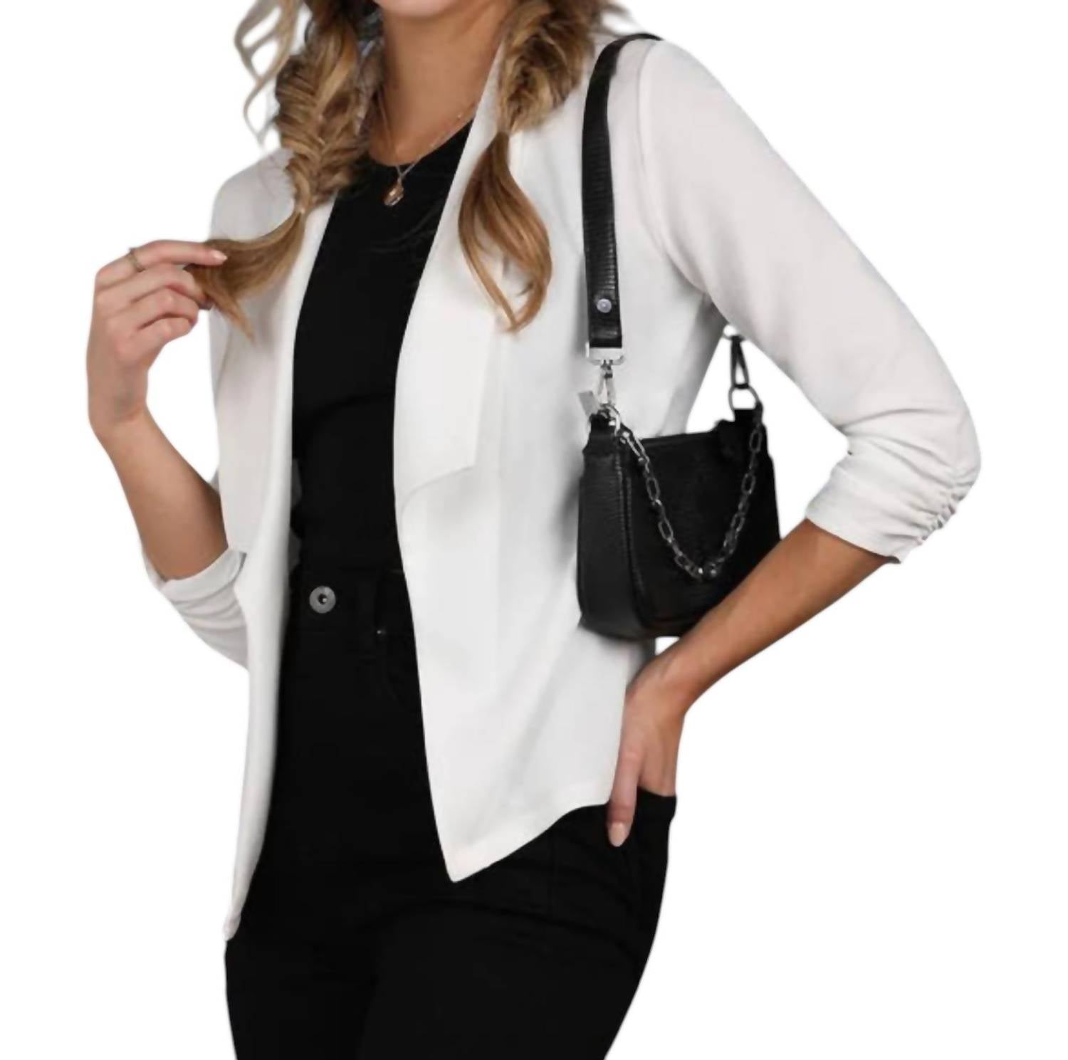 A blazer so versatile you can wear it to the office or pair it with jeans for a more casual look. Short blazer is crafted with long sleeves featuring a shirring detail, and a chic shawl collar for a sleek silhouette. Composed of 95% polyester and 5% spandex, ensuring a comfortable fit. Pull on. Hand wash.